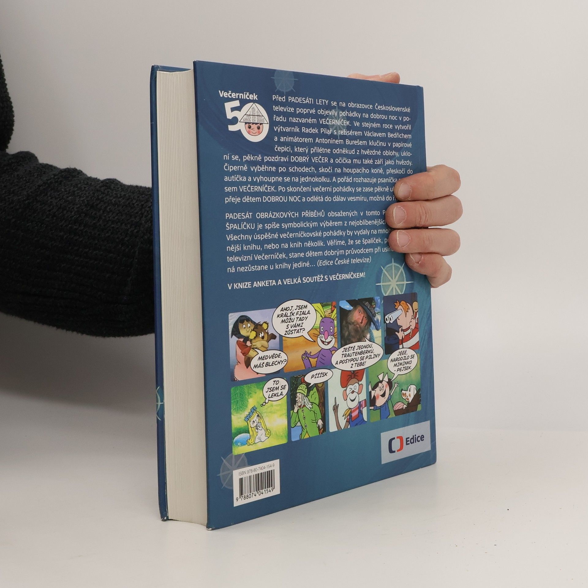 50 let Večerníčku - 50 obrázkových příběhů V knize anketa a velká soutěž s Večerníčkem! Před PADESÁTI LETY se na obrazovce Československé televize poprvé objevily pohádky na dobrou noc v pořadu nazvaném VEČERNÍČEK. Ve stejném roce se k pořadu přidal klučina v papírové čepici, který přilétne odněkud z hvězdné oblohy, ukloní se, mile pozdraví DOBRÝ VEČER a očička mu také září jako hvězdy. Čiperně vyběhne po schodech, skočí na houpacího koně, přeskočí do autíčka a vyhoupne se na jednokolku. A pořád rozhazuje psaníčka s nápisem VEČERNÍČEK. Po skončení večerní pohádky se zase pěkně ukloní, popřeje dětem DOBROU NOC a odlétá do dálav vesmíru, možná do říše snů... PADESÁT OBRÁZKOVÝCH PŘÍBĚHŮ obsažených v tomto POHÁDKOVÉM ŠPALÍČKU je spíše symbolickým výběrem z nejoblíbenějších večerníčků. Všechny úspěšné večerníčkovské pohádky by vydaly na mnohem objemnější knihu, nebo na knih několik. Prozatím ale postačí, když se tento svazek pohádek, podobně jako televizní Večerníček, stane dětem dobrým průvodcem při usínání. V KNIZE ANKETA A VELKÁ SOUTĚŽ S VEČERNÍČKEM!