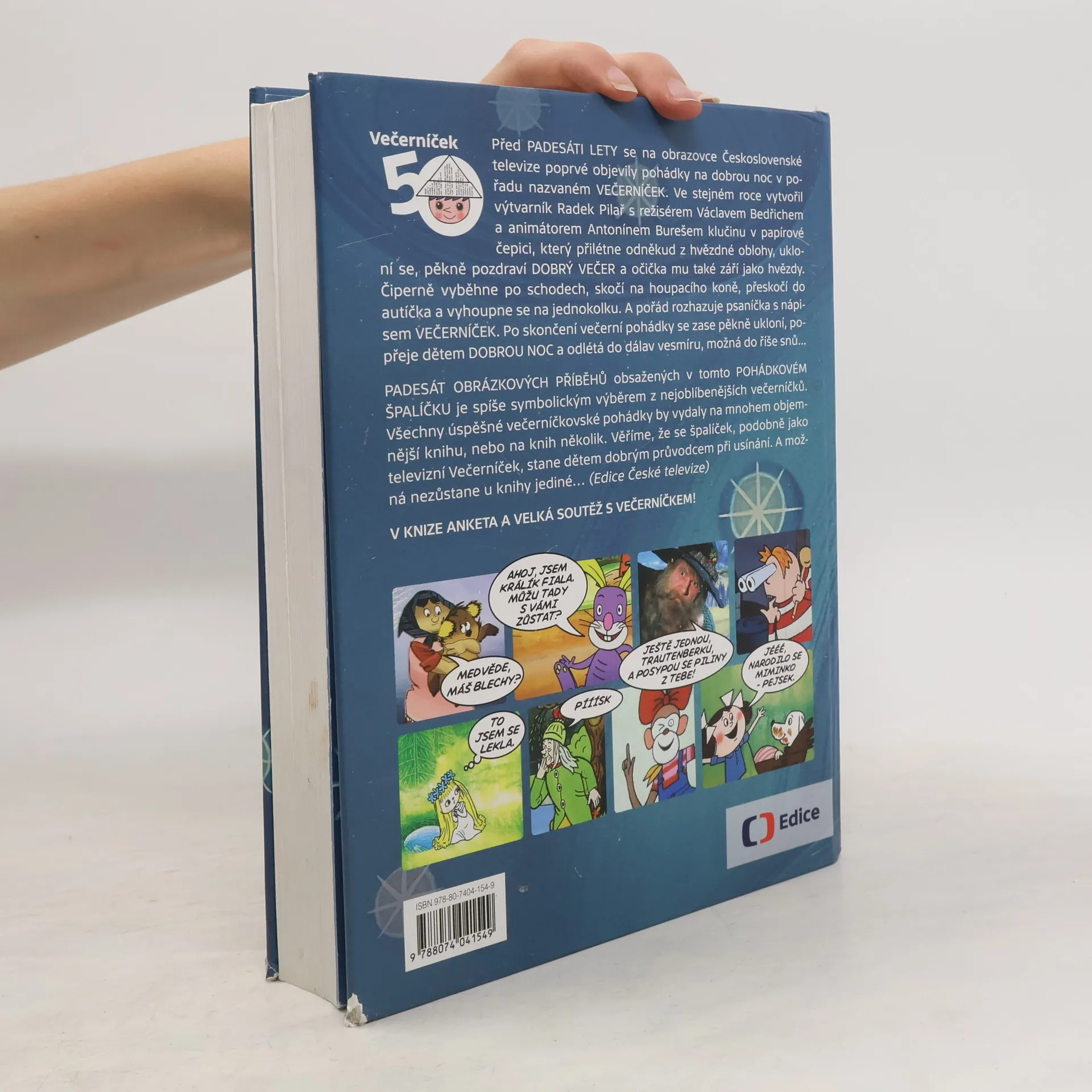 50 let Večerníčku - 50 obrázkových příběhů V knize anketa a velká soutěž s Večerníčkem! Před PADESÁTI LETY se na obrazovce Československé televize poprvé objevily pohádky na dobrou noc v pořadu nazvaném VEČERNÍČEK. Ve stejném roce se k pořadu přidal klučina v papírové čepici, který přilétne odněkud z hvězdné oblohy, ukloní se, mile pozdraví DOBRÝ VEČER a očička mu také září jako hvězdy. Čiperně vyběhne po schodech, skočí na houpacího koně, přeskočí do autíčka a vyhoupne se na jednokolku. A pořád rozhazuje psaníčka s nápisem VEČERNÍČEK. Po skončení večerní pohádky se zase pěkně ukloní, popřeje dětem DOBROU NOC a odlétá do dálav vesmíru, možná do říše snů... PADESÁT OBRÁZKOVÝCH PŘÍBĚHŮ obsažených v tomto POHÁDKOVÉM ŠPALÍČKU je spíše symbolickým výběrem z nejoblíbenějších večerníčků. Všechny úspěšné večerníčkovské pohádky by vydaly na mnohem objemnější knihu, nebo na knih několik. Prozatím ale postačí, když se tento svazek pohádek, podobně jako televizní Večerníček, stane dětem dobrým průvodcem při usínání. V KNIZE ANKETA A VELKÁ SOUTĚŽ S VEČERNÍČKEM!
