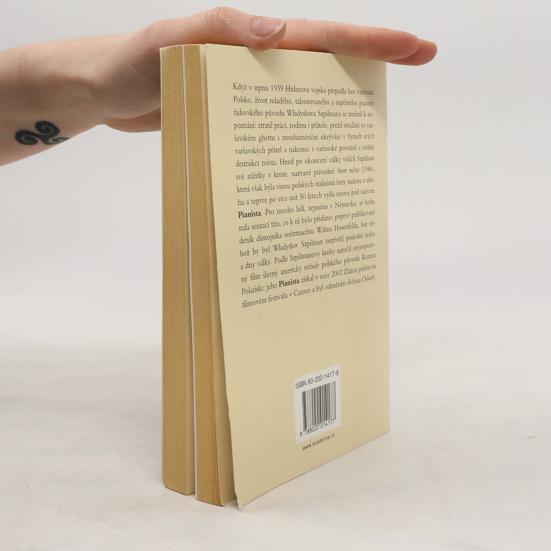 ISBN 978-80-200-1417-7 (dotisk 2007 ; brož.) Když v srpnu 1939 Hitlerova vojska přepadla bez varování Polsko, život mladého, talentovaného a úspěšného pianisty židovského původu Władysława Szpilmana se změnil k nepoznání: ztratil práci, rodinu i přátele, přežil strádání ve varšavském ghettu i mnohaměsíční ukrývání v bytech svých varšavských přátel a nakonec i varšavské povstání a totální destrukci města. Hned po ukončení války vylíčil Szpilman své zážitky v knize, nazvané původně Smrt města (1946), která však byla vinou polských stalinistů brzy stažena z oběhu a teprve po více než 50 letech vyšla znovu pod názvem Pianista. Pro mnoho lidí, zejména v Německu, se kniha stala senzací tím, co k ní bylo přidáno: poprvé publikovaný deník důstojníka wehrmachtu Wilma Hosenfelda, bez něhož by byl Władysław Szpilman nepřežil poslední týdny a dny války. Podle Szpilmanovy knihy natočil stejnojmenný film slavný americký režisér polského původu Roman Polański: jeho Pianista získal v roce 2002 Zlatou palmu na filmovém festivalu v Cannes a byl odměněn dvěma Oskary.