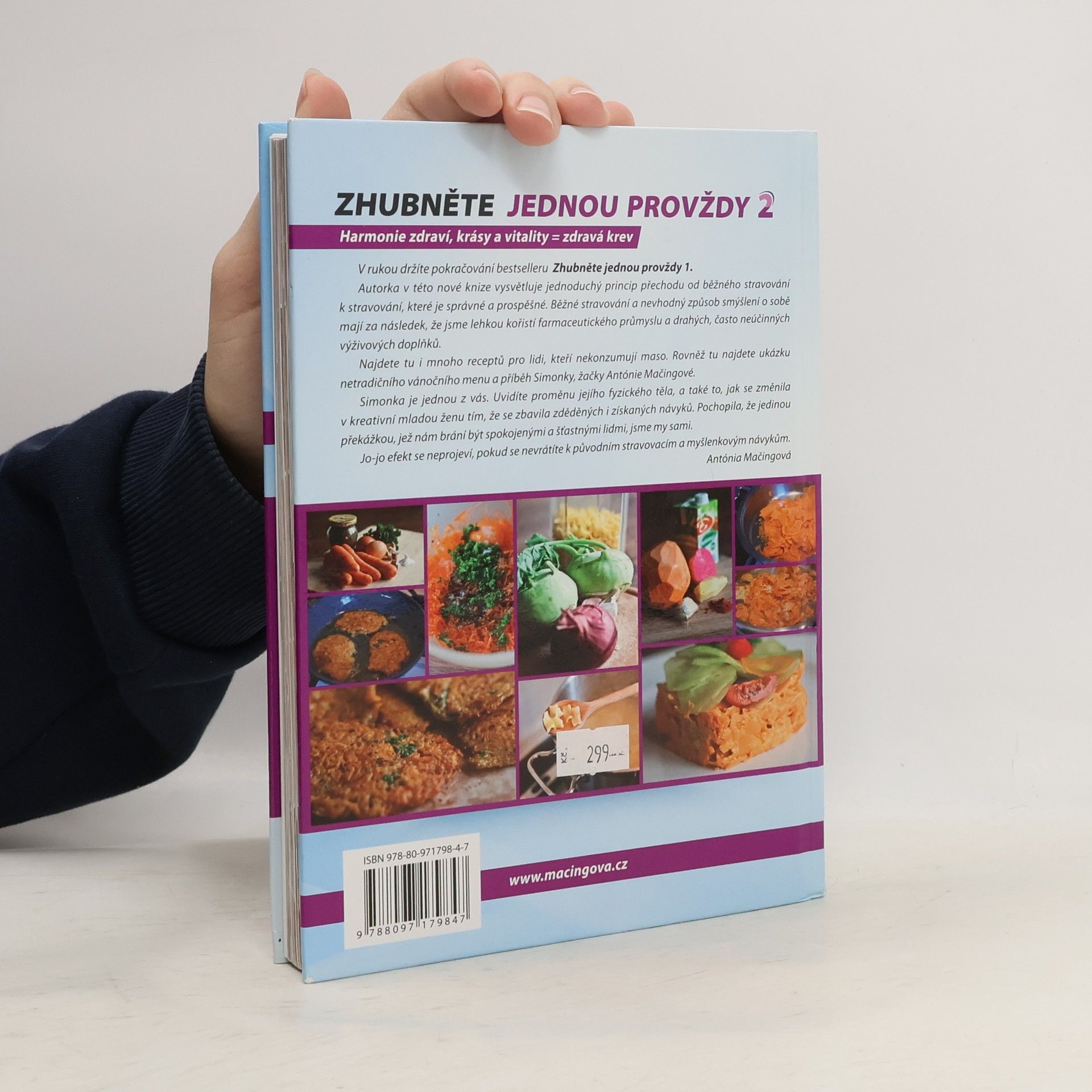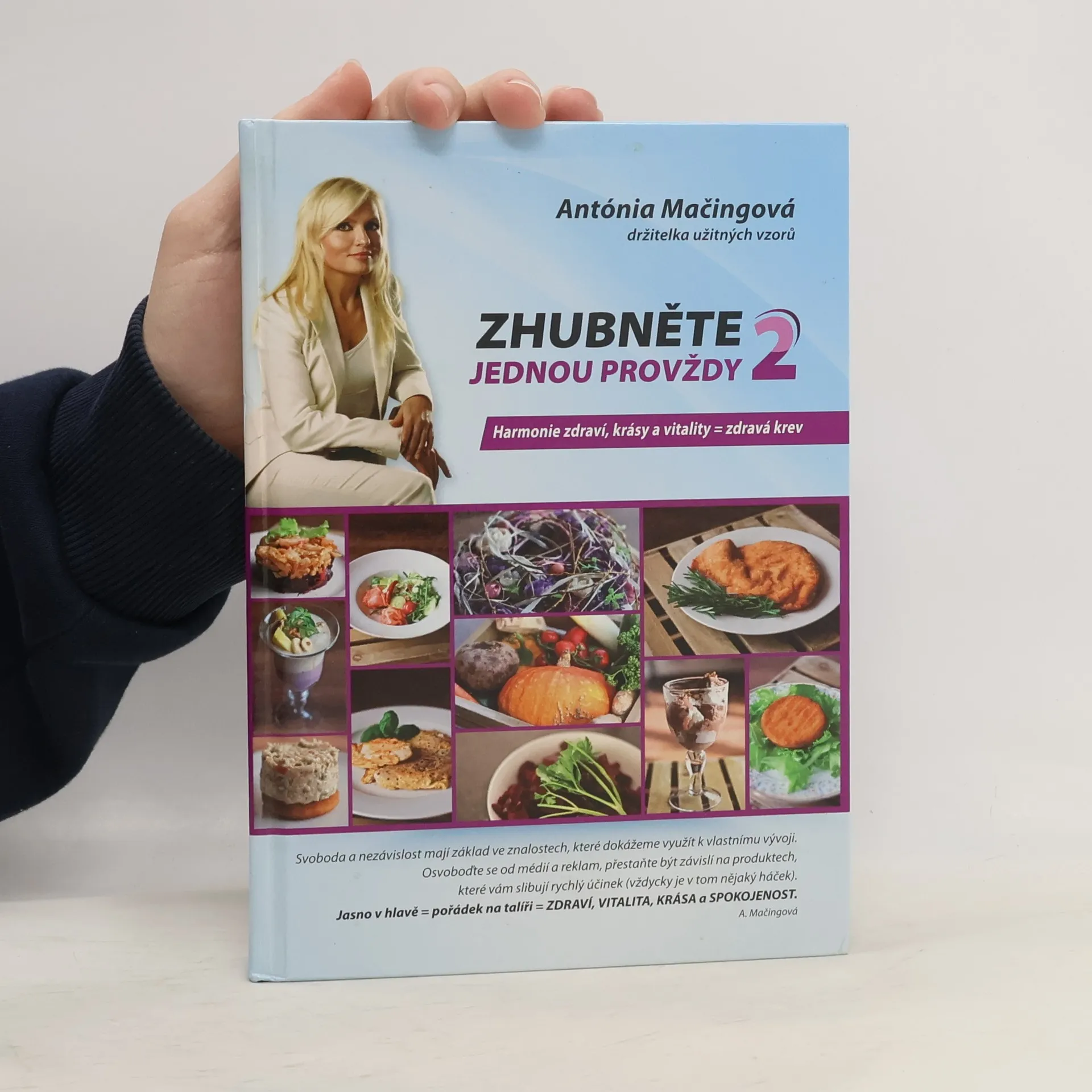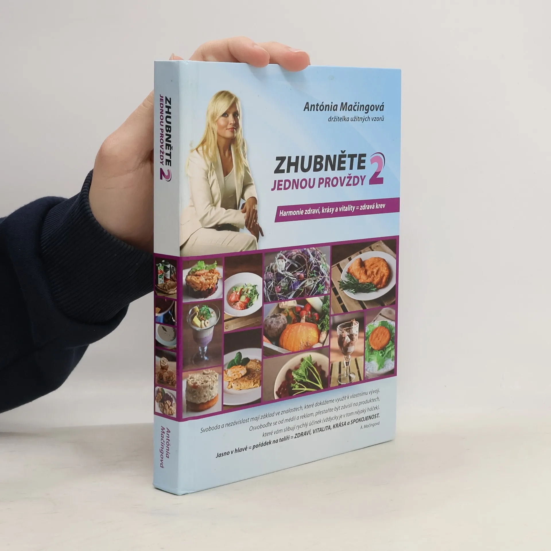 Upravené vydání knihy Harmonie zdraví, krásy a vitality. Pokračování bestselleru Zhubněte jednou provždy. Autorka Antónia Mačingová v této knize vysvětluje jednoduchý princip přechodu od běžného stravování k stravování, které je správné a prospěšné. Běžné stravování a nevhodný způsob smýšlení o sobě mají za následek, že jsme lehkou kořistí farmaceutického průmyslu a drahých, často neúčinných výživových doplňků. Najdete tu i mnoho receptů pro lidi, kteří nekonzumují maso. Rovněž tu najdete ukázku netradočního vánočního menu a příběh Simonky, žáčky Antónie Mačingové. Simonka je jedna z vás. Uvidíte proměnu jejího fyzického těla, a také to, jak se změnila v kreativní mladou ženu tím, že se zbavila zděděných i získaných návyků. Pochopila, že jedinou překážkou, jež nám brání být spokojenými a šťastnými lidmi, jsme my sami. Jo-jo efekt se neprojeví, pokud se nevrátíte k původním stravovacím a myšlenkovým návykům.