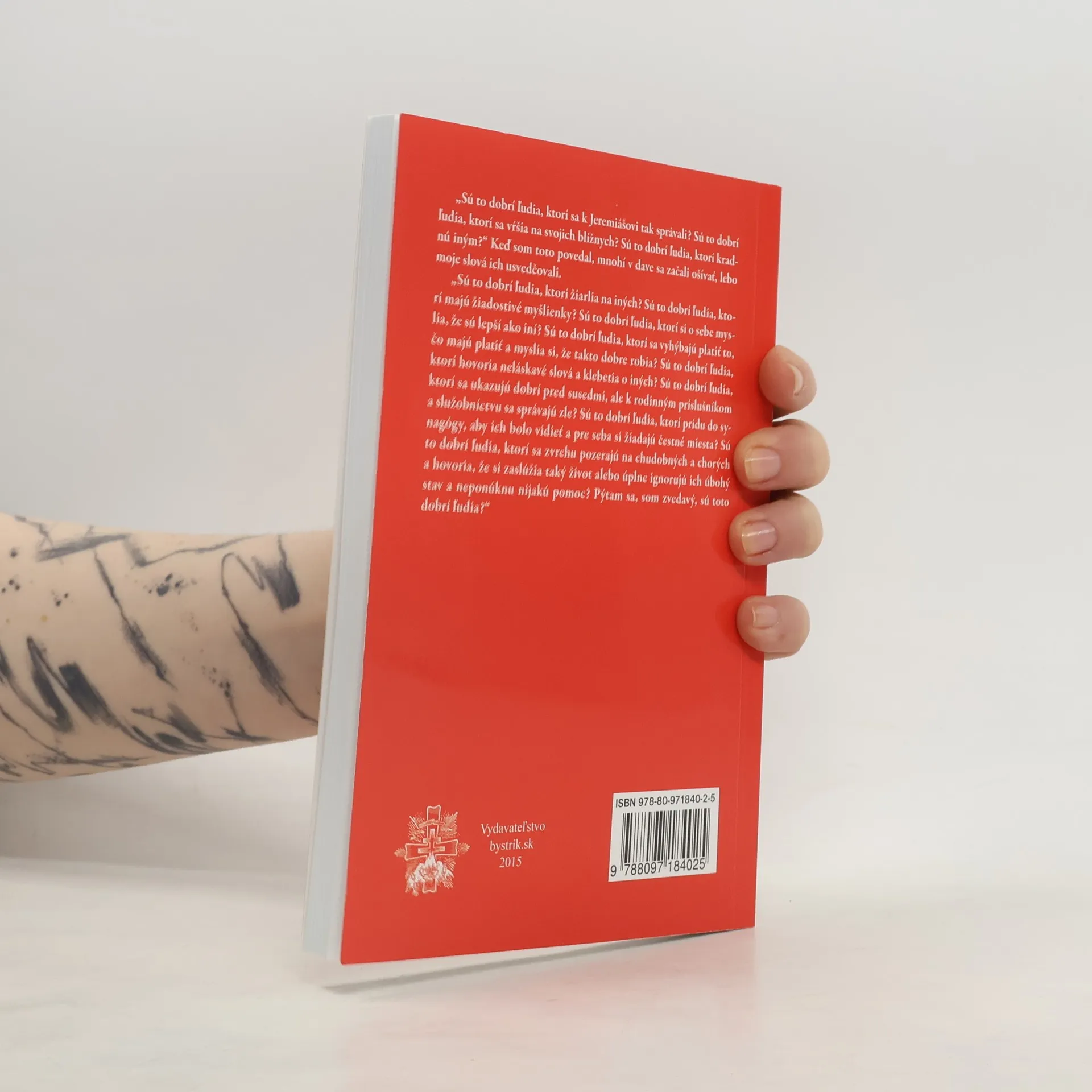 „Sú to dobrí ľudia, ktorí sa k Jeremiášovi tak správali? Sú to dobrí ľudia, ktorí sa vŕšia na svojich blížnych? Sú to dobrí ľudia, ktorí kradnú iným?“ Ked som toto povedal, mnohí v dave sa začali ošívať, lebo moje slová ich usvedčovali. „Sú to dobrí ľudia, ktorí žiarlia na iných? Sú to dobrí ľudia, ktorí majú žiadostivé myšlienky? Sú to dobrí ľudia, ktorí si o sebe myslia, že sú lepší ako iní ? Sú to dobrí ľudia, ktorí sa vyhýbajú platiť to, čo majú platiť a myslia si, že takto dobre robia? Sú to dobrí ľudia, ktorí hovoria neláskavé slová a klebetia o iných? Sú to dobrí ľudia, ktorí sa ukazujú dobrí pred susedmi, ale k rodinným príslušníkom a služobníctvu sa správajú zle? Sú to dobrí ľudia, ktorí prídu do sy-nagógy, aby ich bolo vidieť a pre seba si žiadajú čestné miesta? Sú to dobrí ľudia, ktorí sa zvrchu pozerajú na chudobných a chorých a hovoria, že si zaslúžia taký život alebo úplne ignorujú ich úbohý stav a neponúknu nijakú pomoc? Pýtam sa, som zvedavý, sú toto dobrí ľudia?“