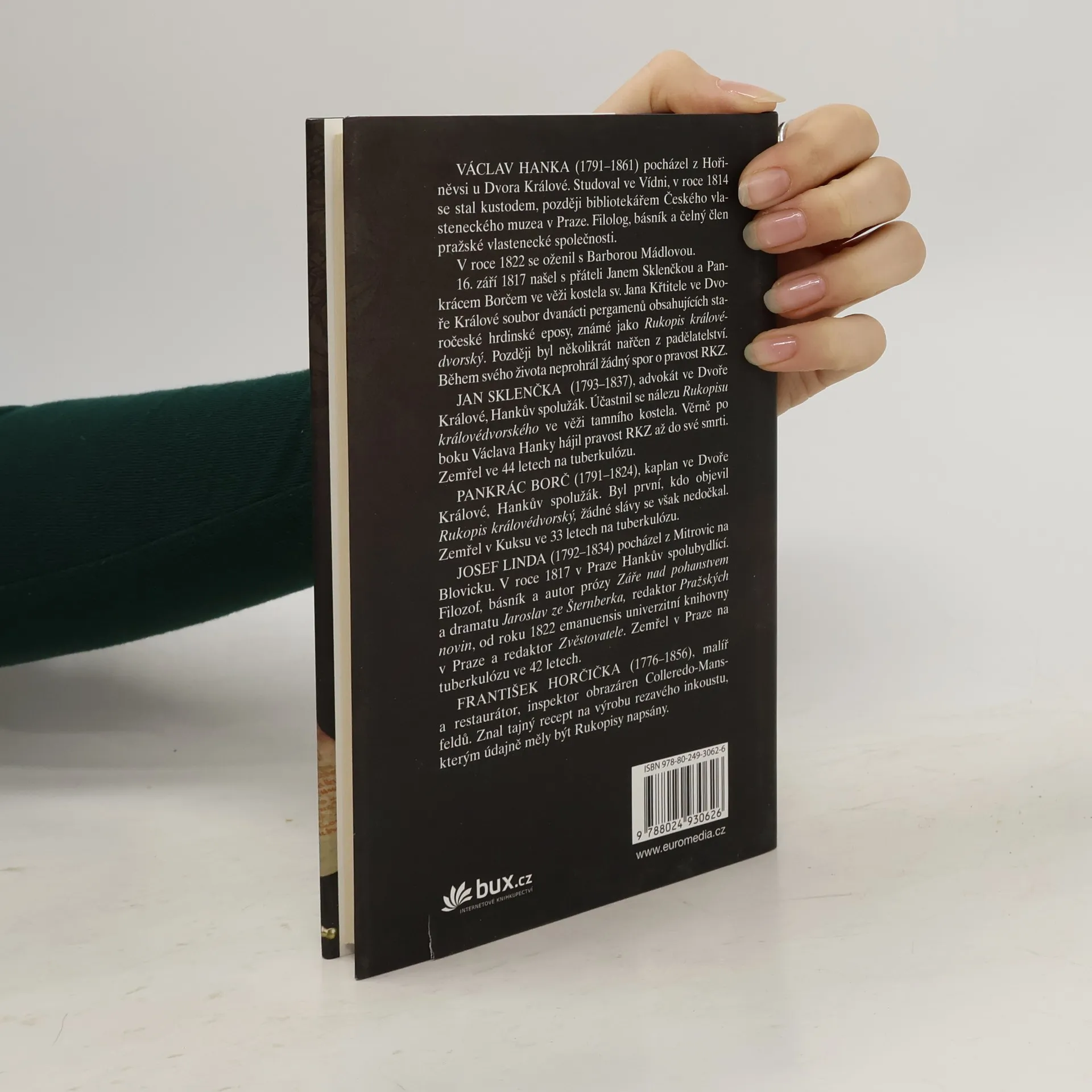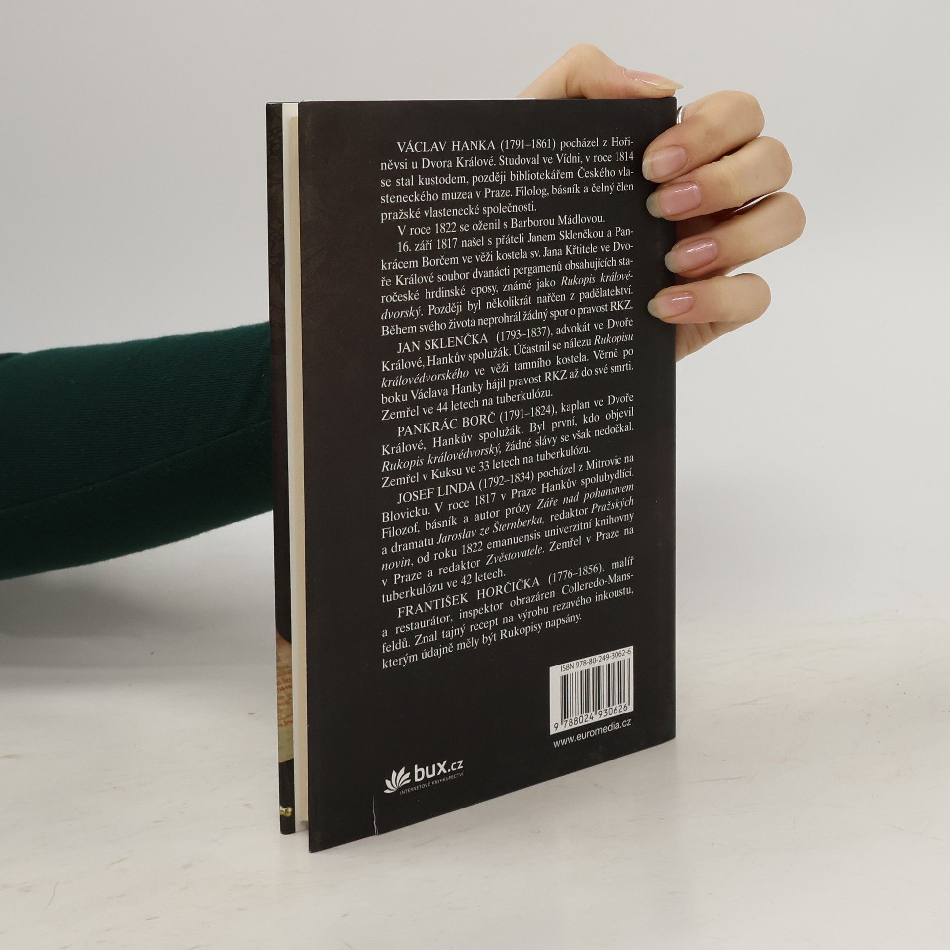 Příběh Václava Hanky, bibliotekáře Českého vlasteneckého muzea, a jeho přátel kaplana borče, justiciára Sklenčky, básníka Lindy a malíře-restaurátora Horčičky, kteří na podzim roku 1817 obeznámili českou veřejnost s rukopisem královédvorským a zelenohorským. Kniha přináší nové překvapivé okolnosti nálezů Rukopisů a zpochybňuje možnost, že by šlo o padělky.
