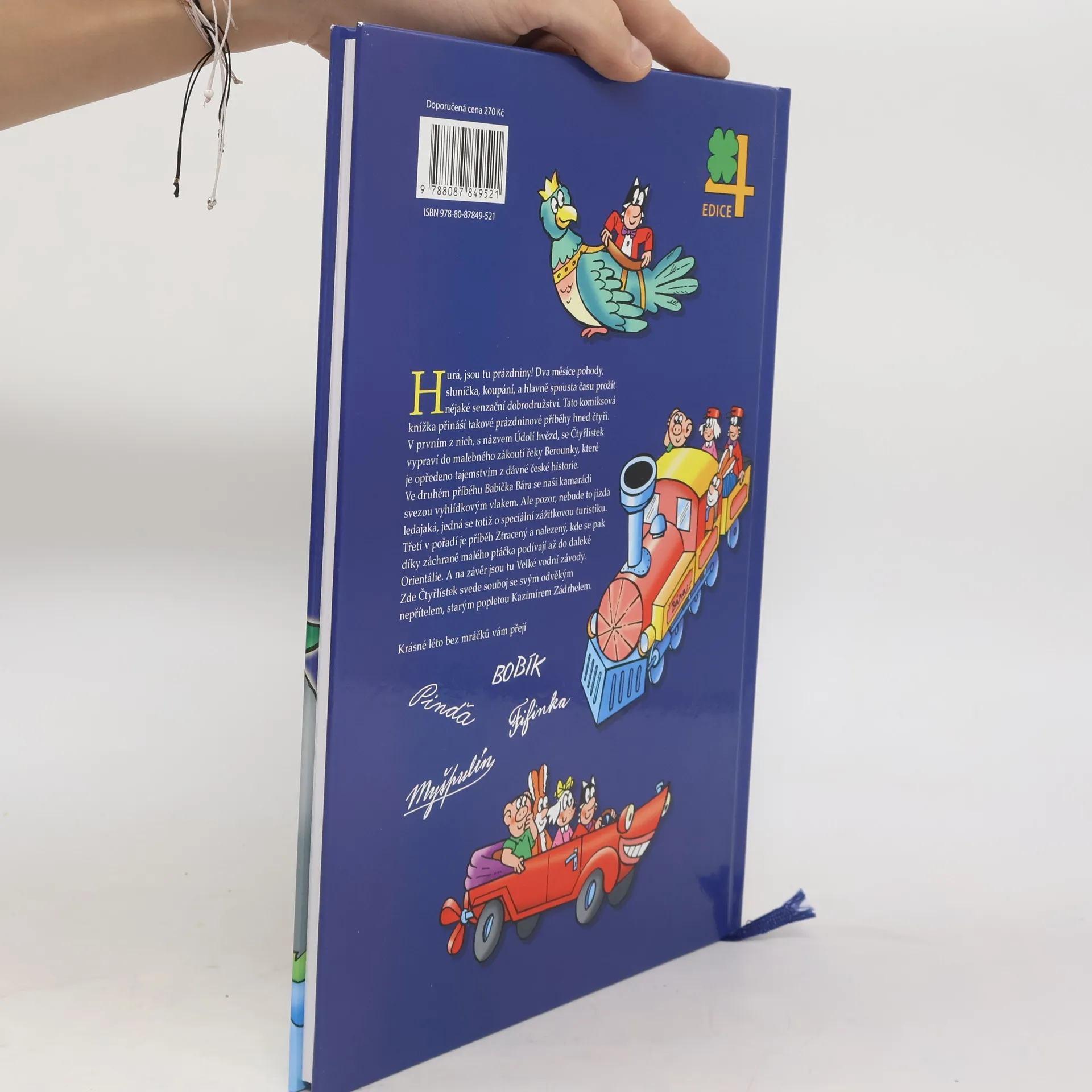 Komiksová knížka z oblíbené edice čtyř příběhů přináší další dobrodružství veselé party ze Čtyřlístku. Fifinka, Bobík, Pinďa a Myšpulín v ní zažijí příběhy tentokrát na prázdninové téma. V prvním z nich, s názvem Údolí hvězd, se Čtyřlístek vypraví do malebného zákoutí řeky Berounky, které je opředeno tajemstvím z dávné české historie. V příběhu Ztracený a nalezený se díky záchraně malého ptáčka podívají až do Orientálie, kde dokonce odhalí nebezpečné lupiče. Třetí v pořadí jsou Velké vodní závody. Zde svedou souboj se svým odvěkým nepřítelem, starým popletou Kazimírem Zádrhelem. A nakonec se v příběhu Babička Bára svezou vyhlídkovým vlakem. Ale pozor, nebude to jízda ledajaká, jedná se totiž o dobrodružnou zážitkovou turistiku.