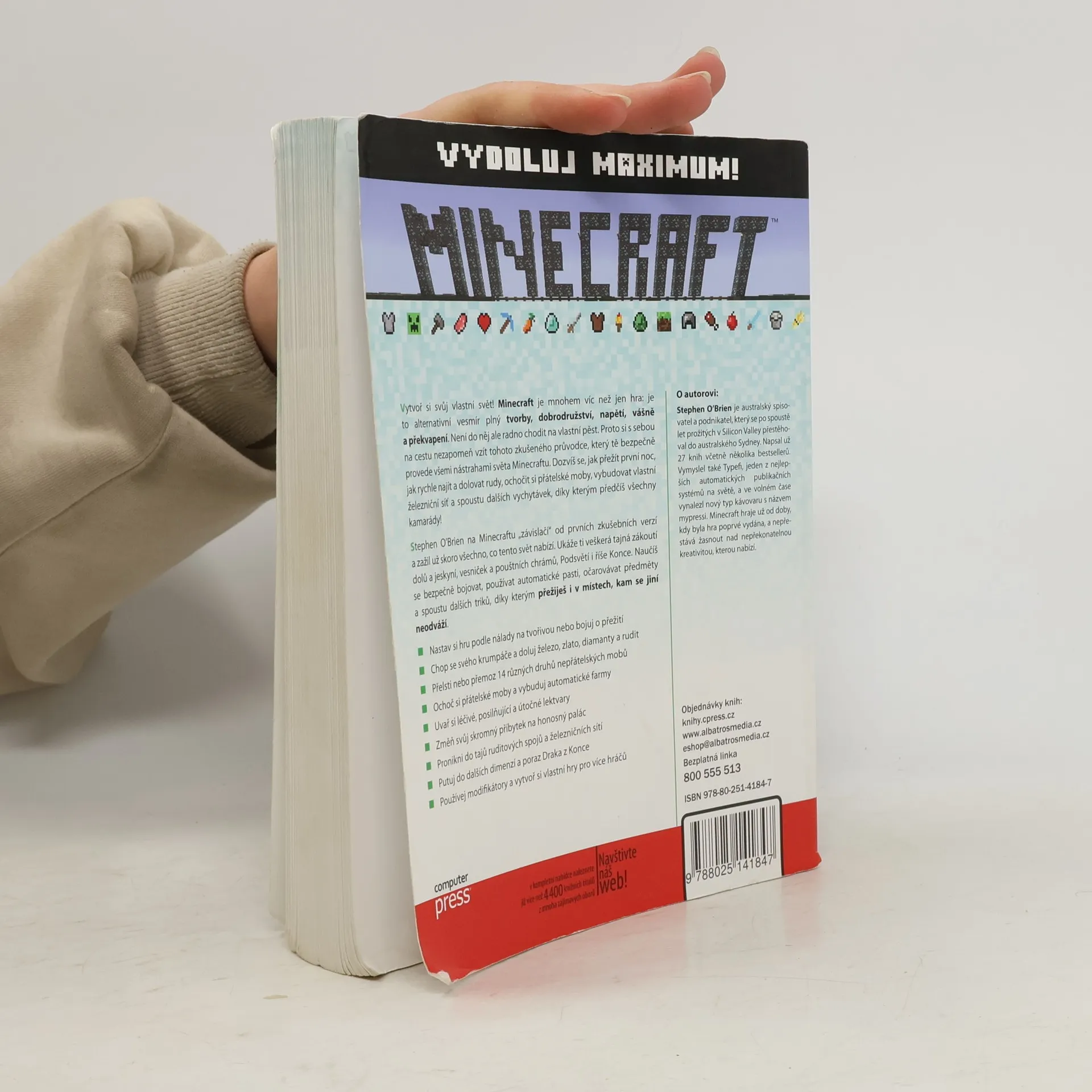 Vytvoř si svůj vlastní svět! Minecraft je mnohem víc než jen hra: je to alternativní vesmír plný tvorby, dobrodružství, napětí a překvapení. Není do něj ale radno vstupovat na vlastní pěst, takže si s sebou nezapomeň přibalit tohoto průvodce. Dozvíš se jak přežít první noc, rychle najít rudy, ochočit přátelské moby, vybudovat železniční síť a spoustu dalších vychytávek!