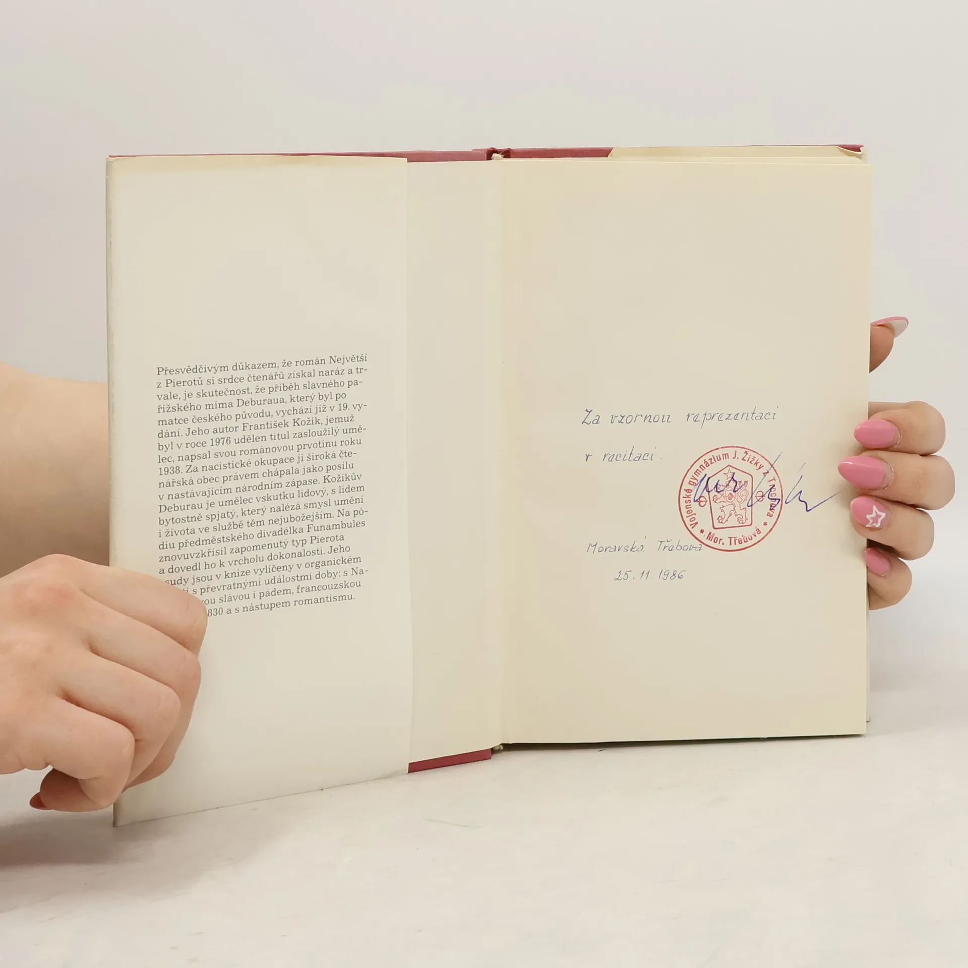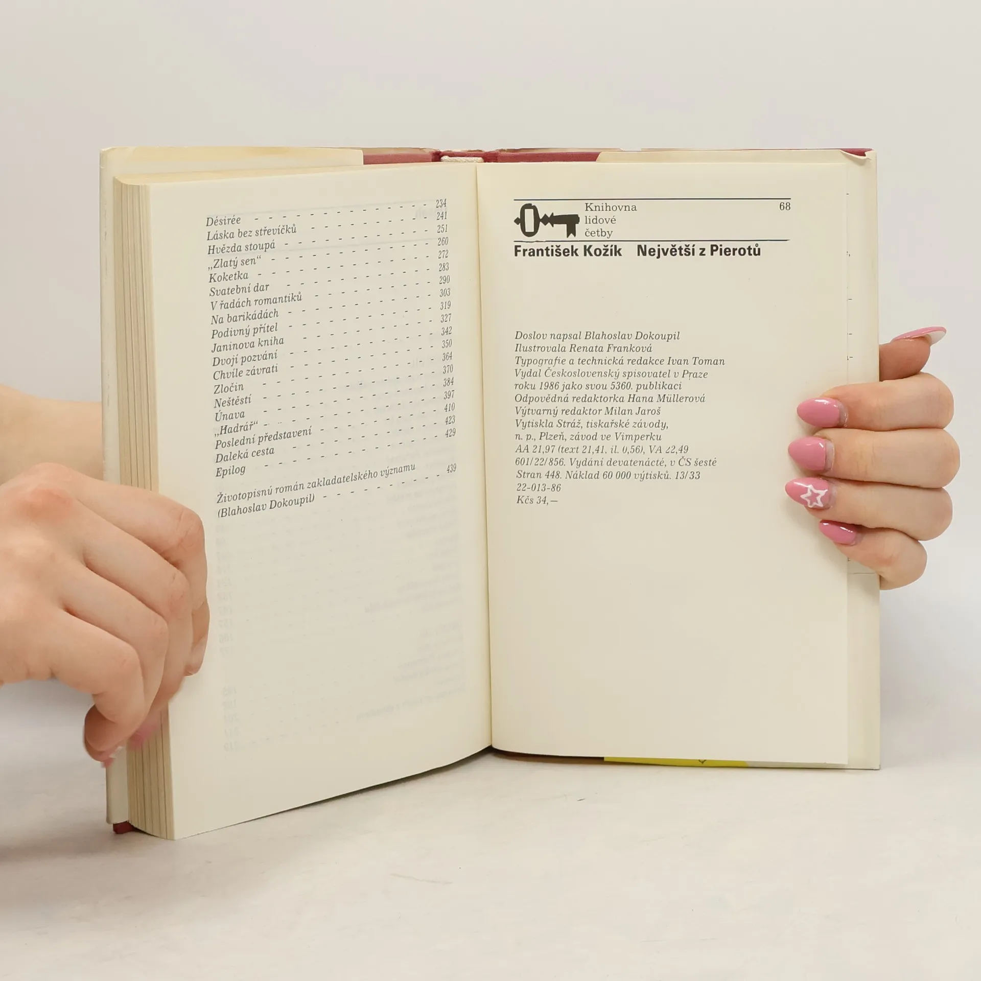 Franková Renata ilustrace černobílé celostránkové. Rozsáhlý román inspirovaný životní a uměleckou dráhou mistra pantomimy Jeana Gaspara Deburaua (1796-1846), který byl po své matce českého původu. Autor líčí jeho dětství a mládí strávené uprostřed kočovné artistické společnosti,léta čekání na výraznější umělecký úspěch a konečně i léta triumfu a uznání. V Paříži dosáhl po mnoha letech nesmírné popularity a byl milován a obdivován všemi - od prostého publika až po přestavitele kulturní elity tehdejší Francie. Román není životopisem v pravém slova smyslu, ale především psychologickou studií o cestě umělce za vyjádřením svých představ a poetickou básní o divadle a lidském životě.