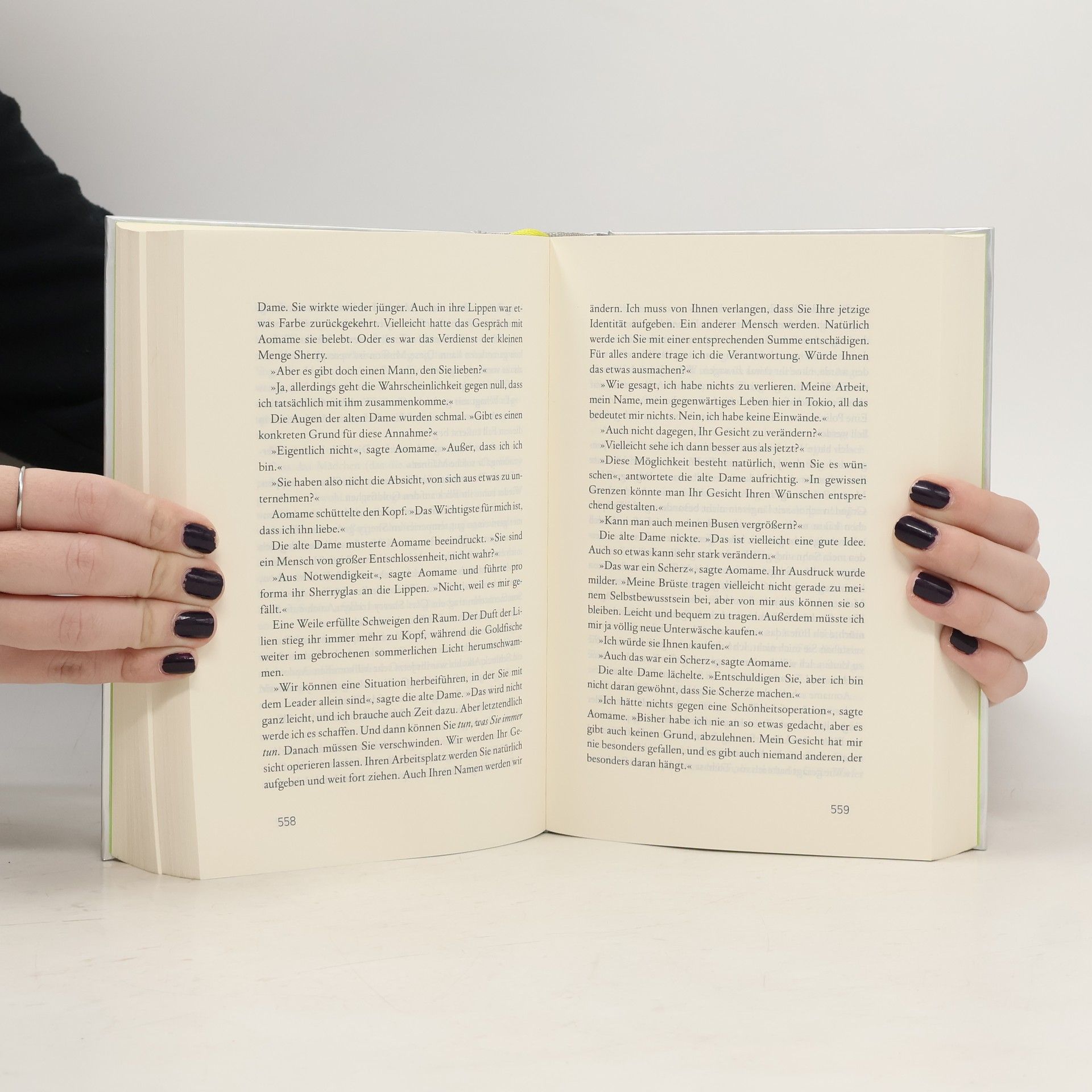 1984. Aomame hat zwei verschieden große Ohren. Beim Rendezvous mit einem reichen Ölhändler zückt sie eine Nadel und ersticht ihn – ein Auftragsmord, um altes Unrecht zu sühnen. Tengo ist Hobby-Schriftsteller. Er soll einen Roman der exzentrischen 17-jährigen Fukaeri überarbeiten, damit sie einen Literaturpreis bekommt. Der Text ist äußerst originell, aber schlecht geschrieben – ein riskanter Auftrag. Aomame wundert sich, warum die Nachrichten ihren Mord nicht melden. Ist sie in eine Parallelwelt geraten? Um diese Sphäre vom gewöhnlichen Leben im Jahr 1984 zu unterscheiden, gibt Aomame der neuen, unheimlichen Welt den Namen 1Q84.