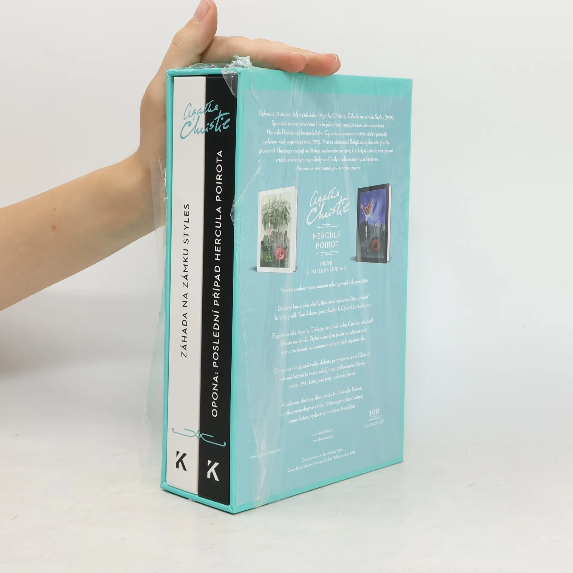 Před sto lety – v roce 1920 – vydala Agatha Christie svůj první román, Záhadu na zámku Styles, v níž se zároveň na scéně zločinu poprvé objevila autorčina neslavnější postava, detektiv Hercule Poirot. Na počest této významné události vychází speciální edice spojující tento úvodní a poslední Poirotův případ, Oponu, kde se stárnoucí Belgičan a jeho věrný přítel Hastings vracejí na Styles, aby zde naposledy změřili síly s rafinovaným pachatelem. Výroční soubor zahrnuje hned několik specialit: ilustroval ho spisovatelčin „dvorní“ britský grafik Tom Adams, jenž doplnil k Oponě i předmluvu. Archivář John Curran obohatil Záhadu na zámku Styles o analýzu textu a o alternativní scénu rozřešení, nalezenou v autorčiných zápisnících. O inspiraci k napsání svého debutu promlouvá sama Christie v článku Léky jako jedy v detektivkách. A v přiloženém dopise se nám představí sám jedinečný Hercule Poirot.