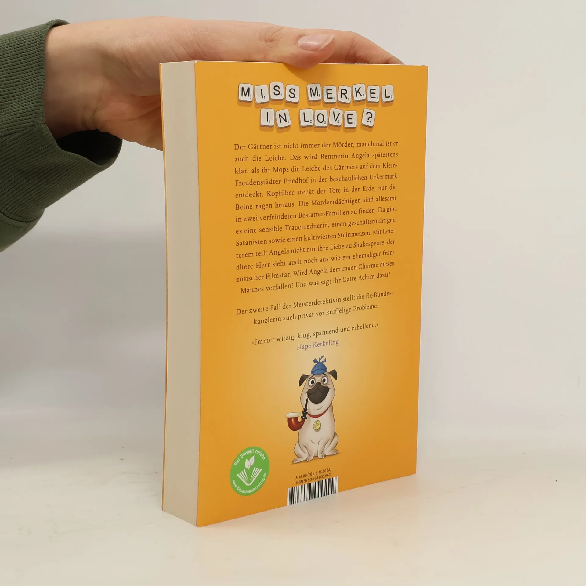 Der Gärtner ist nicht immer der Mörder, manchmal ist er auch die Leiche. Das wird Rentnerin Angela spätestens klar, als ihr Mops die Leiche des Gärtners auf dem Klein-Freudenstädter Friedhof in der beschaulichen Uckermark entdeckt. Kopfüber steckt der Tote in der Erde, nur die Beine ragen heraus. Die Mordverdächtigen sind allesamt in zwei verfeindeten Bestatter-Familien zu finden. Da gibt es einen dubiosen Geschäftsführer, eine spröde Buchhalterin, eine sensible Trauerrednerin, einen Satanisten sowie einen kultivierten Steinmetz. Mit Letzterem teilt Angela nicht nur ihre Liebe zu Shakespeare, der ältere Herr sieht auch noch aus wie ein ehemaliger französischer Filmstar. Wird Angela dem rauen Charme dieses Mannes verfallen? Und was sagt ihr Gatte Achim dazu? Der zweite Fall der Meisterdetektivin Miss Merkel stellt die Ex-Bundeskanzlerin auch privat vor kniffelige Probleme.