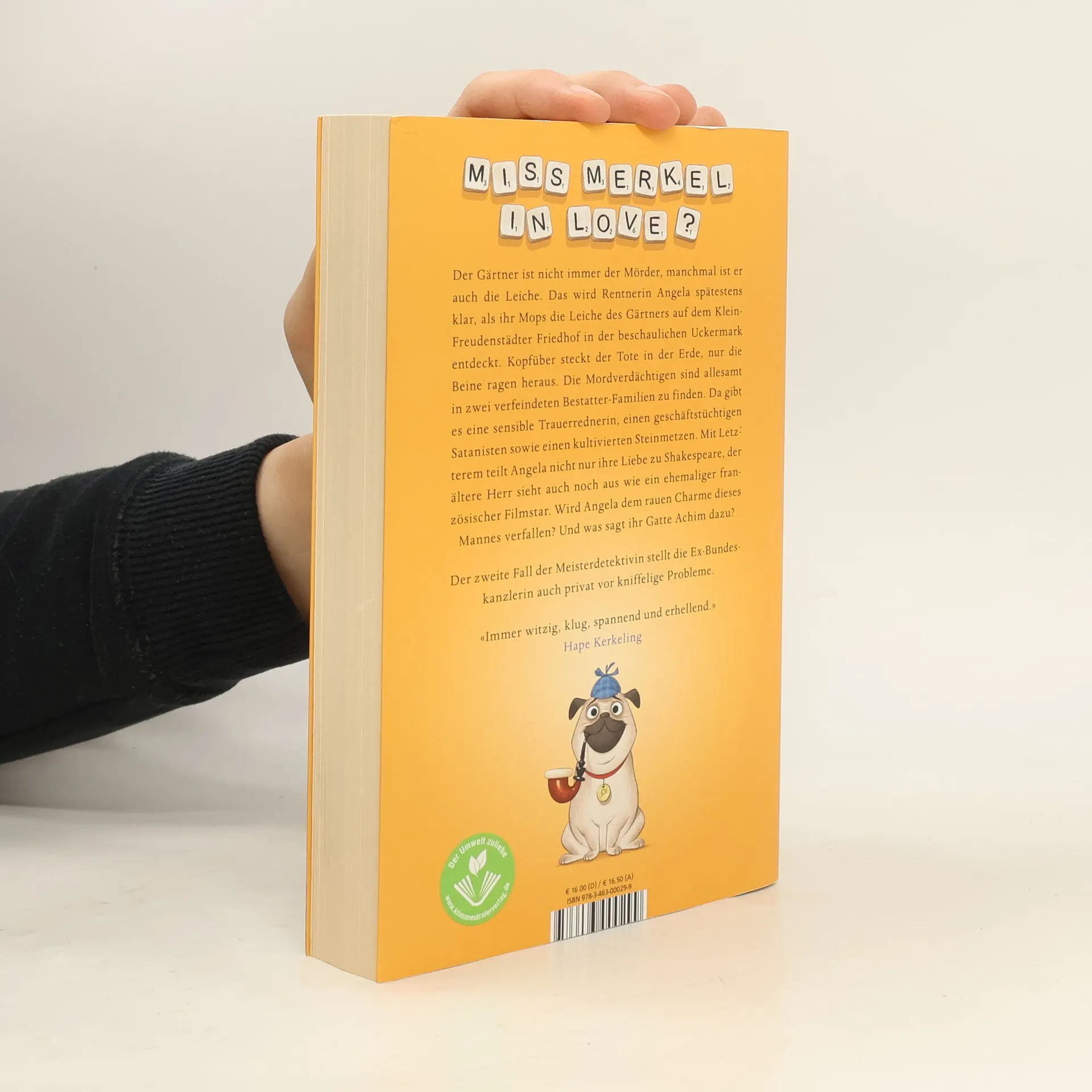 Der Gärtner ist nicht immer der Mörder, manchmal ist er auch die Leiche. Das wird Rentnerin Angela spätestens klar, als ihr Mops die Leiche des Gärtners auf dem Klein-Freudenstädter Friedhof in der beschaulichen Uckermark entdeckt. Kopfüber steckt der Tote in der Erde, nur die Beine ragen heraus. Die Mordverdächtigen sind allesamt in zwei verfeindeten Bestatter-Familien zu finden. Da gibt es einen dubiosen Geschäftsführer, eine spröde Buchhalterin, eine sensible Trauerrednerin, einen Satanisten sowie einen kultivierten Steinmetz. Mit Letzterem teilt Angela nicht nur ihre Liebe zu Shakespeare, der ältere Herr sieht auch noch aus wie ein ehemaliger französischer Filmstar. Wird Angela dem rauen Charme dieses Mannes verfallen? Und was sagt ihr Gatte Achim dazu? Der zweite Fall der Meisterdetektivin Miss Merkel stellt die Ex-Bundeskanzlerin auch privat vor kniffelige Probleme.