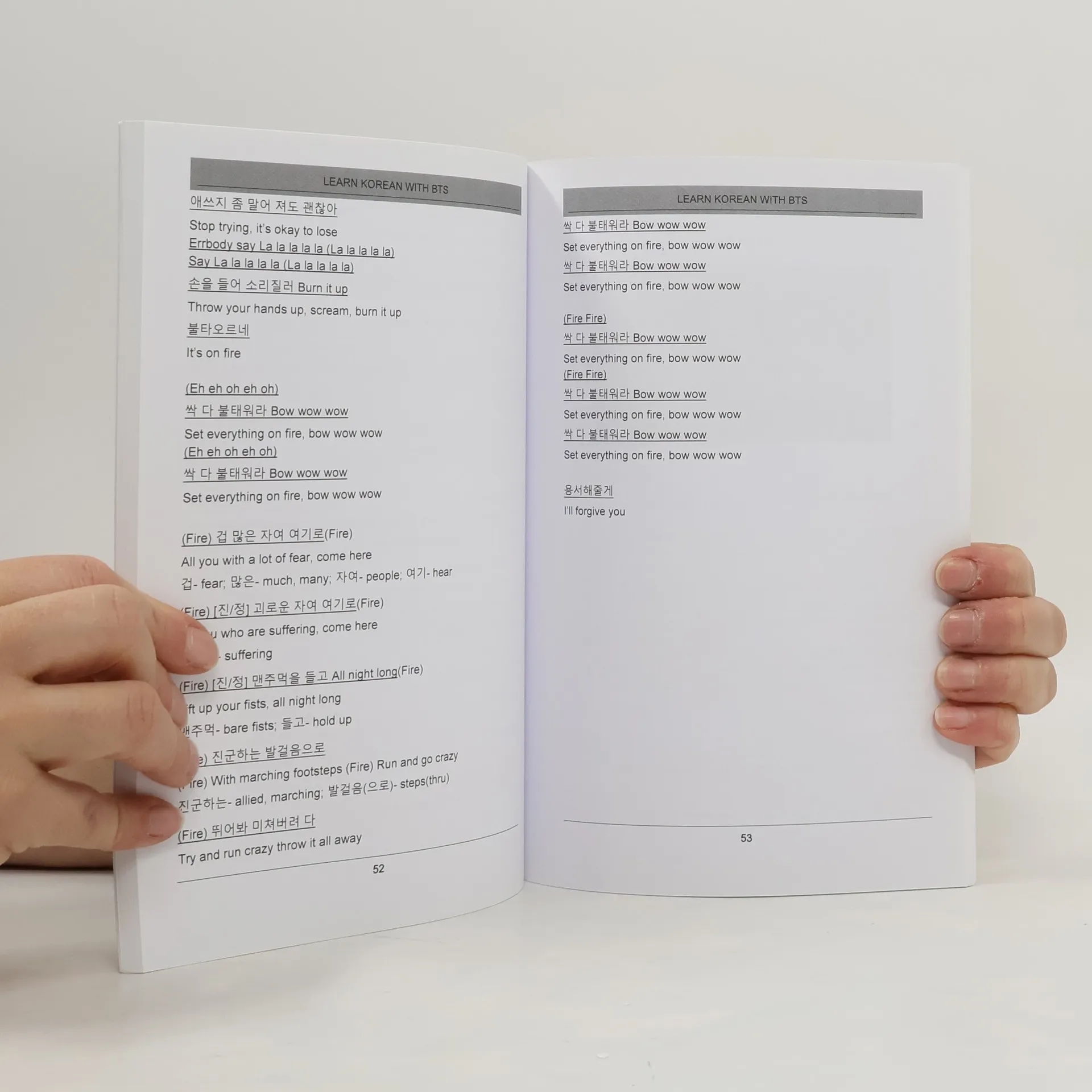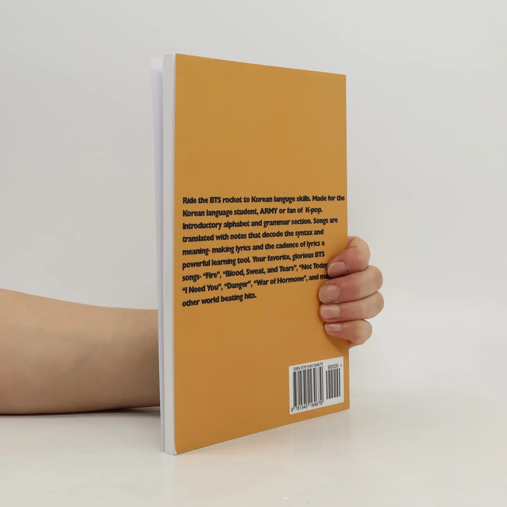 Ride the BTS rocket to Korean languge skills. Made for the Korean language student, ARMY or fan of K-pop. Introductory alphabet and grammar section. Korean lyrics are translated into English with extensive notes that decode the syntax and meaning- making lyrics and the cadence of lyrics a powerful learning tool. Your favorite, glorious BTS songs- “Fire”, “Blood, Sweat, and Tears”, “Not Today”, “I Need You”, “Danger”, “War of Hormone”, and many other world beating hits.