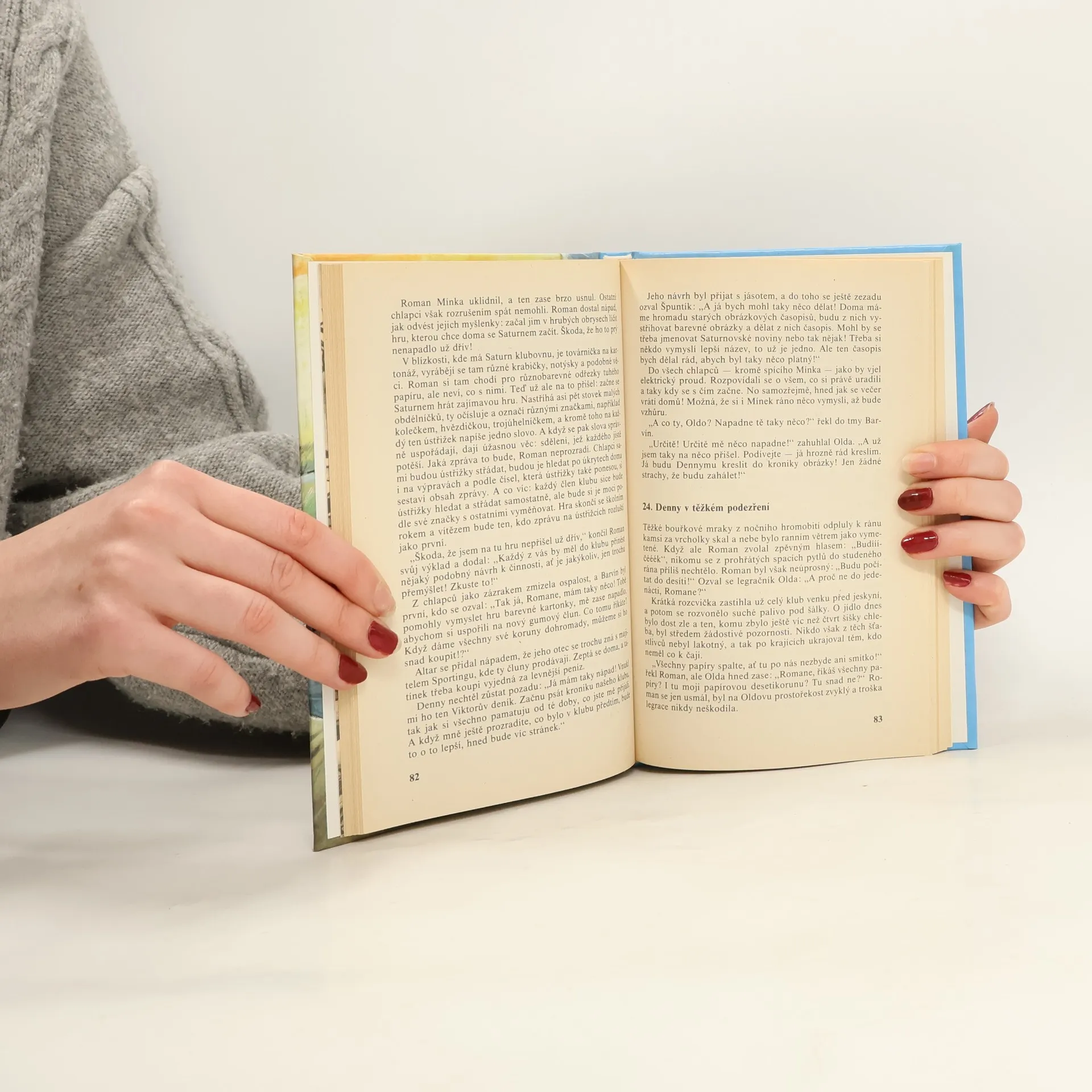 Hlavní postavou knihy je třináctiletý sportovec Denny, který se vážně zraní na kluzišti. V nemocnici se seznámí s vrstevníkem Oldou a ten jej později přivede do klubu Saturn. S novými kamarády prožije Denny mnohá dobrodružství. Jednou se společně vydají do opuštěného lomu pro jakousi namodralou hlínu, kterou vykupují dva kumpáni, Haryk a Milda. Přitom objeví krasovou oblast plnou skalisek a podzemních prostor, částečně nepřístupných. U jezera velké rozlohy přijdou na stopu dvou neznámých školáků a zjistí, že jeden záhadně zmizel a druhý ho marně hledá. Pouze zpola zatopený člun skýtá jakési tragické vysvětlení. Rozhodnou se pomoci kamarádovi v jeho pátrání a rozluštit záhadu. Na tomto nádherném místě vrcholí později jejich příběh prázdninovým táborem. Poznámka: Toto druhé (a další) vydání obsahuje další čtyři kapitoly (12 stránek) o pobytu na táboře.