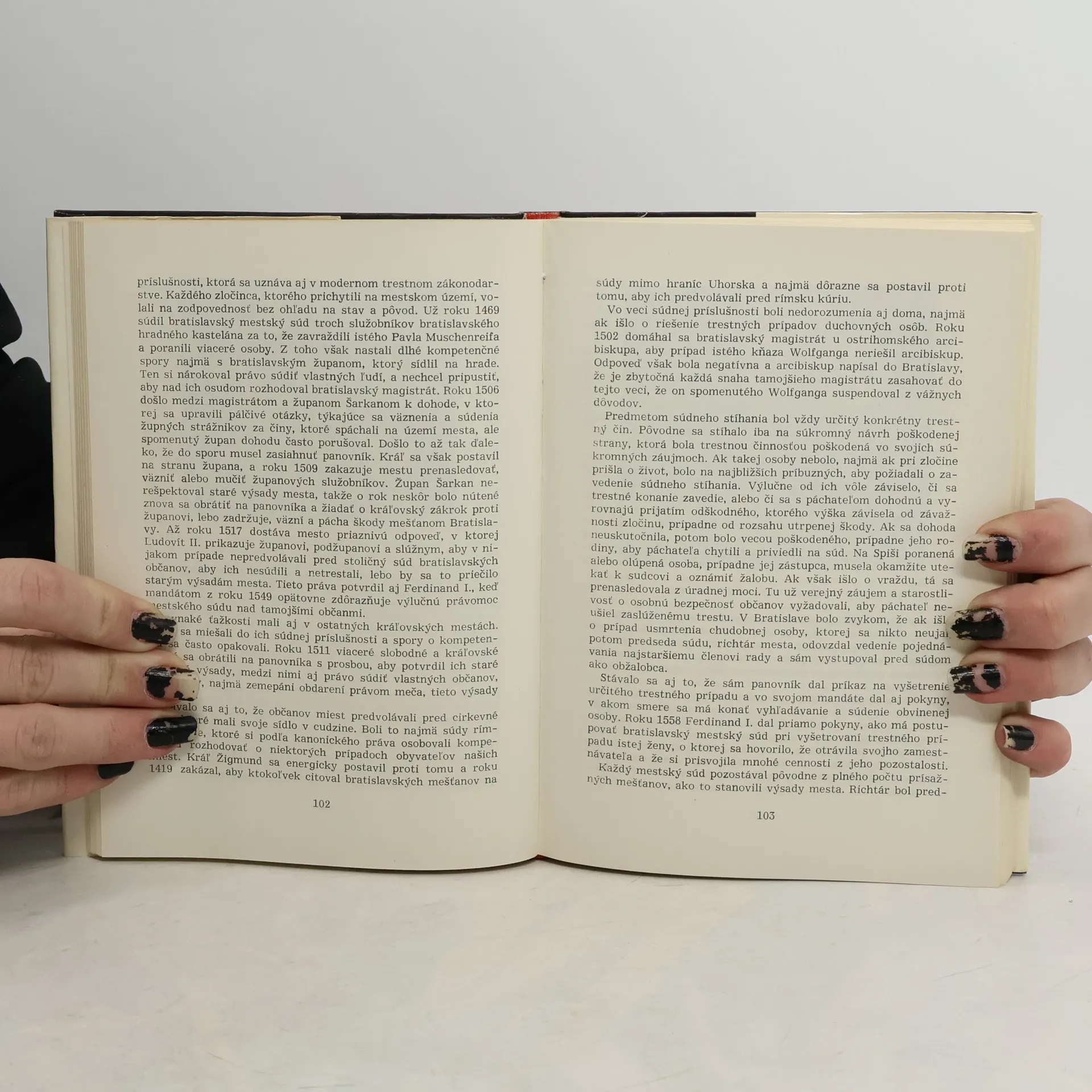 Publikácia predstavuje ucelený obraz stredovekého vysluhovania spravodlivosti – feudálne súdnictvo na území dnešného Slovenska v jeho nahote, umožňuje porovnať ho so sociálnym a právnym pokrokom súčasnosti. Na podklade archívneho materiálu – starých súdnych protokolov, rozsudkov súdov i súdobej korešpondencie – a odbornej literatúry podáva celú štruktúru feudálneho súdnictva v mestách i župách. Dotýka sa aj mimoriadnych vojenských súdov. Opisuje konanie pred súdmi, vyšetrovanie trestných činov, tresty a ich výkon. Všíma si trestné činy voči jednotlivcom i protifeudálne prejavy a ukrutnosti trestov (stínani, obesenie, lámanie v kolese, upálenie za živa, vláčenie na konskom chvoste a pod.). Všetky úvahy autor dokladá početnými príkladmi, ktoré sa pred súdmi od 9. do 18. storočia prejednávali.
