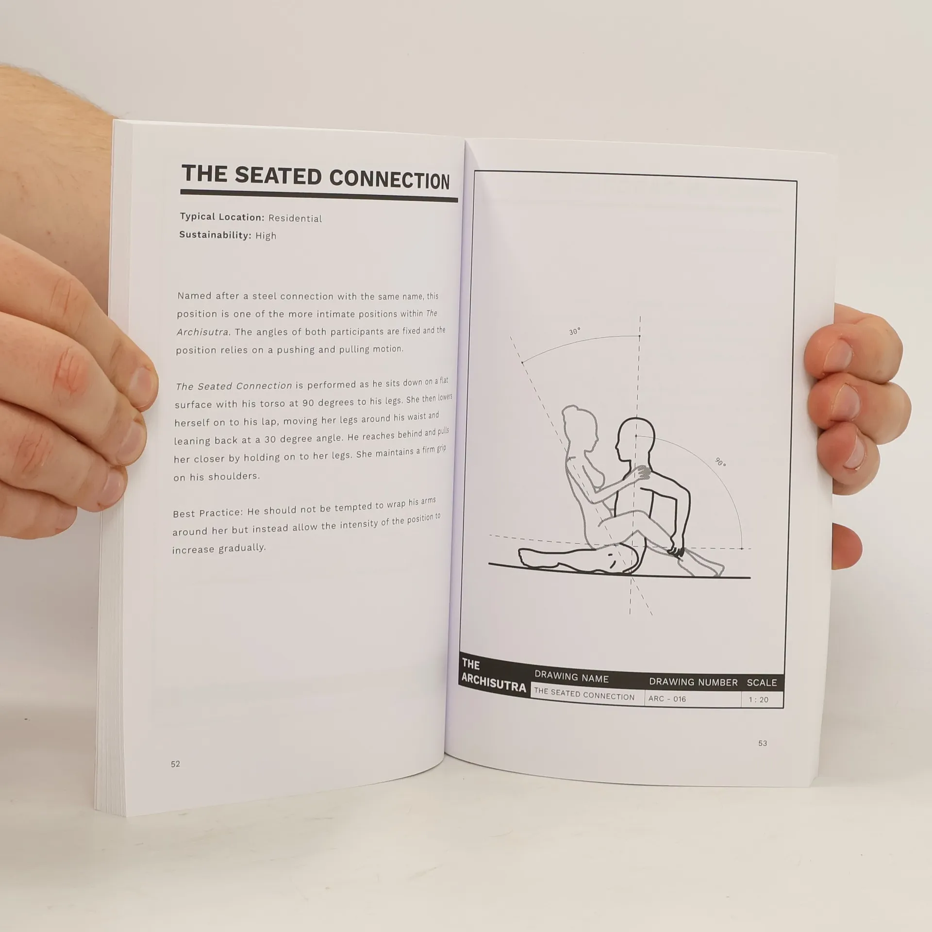 The Archisutra is a design manual giving you the necessary data for a selection of sex positions, using annotated scale drawings and informative descriptions. Swiss architect Le Corbusier coined the phrase 'machines for living', within his book, 'Towards an Architecture' in 1923. Sex plays a large role in society and everyday life. So, why is it so often overlooked when an architect designs a building? The Archisutra raises the question: How should we design for sex? In 1490 Leonardo da Vinci sketched the Vitruvian Man, a diagram showing the proportions of man based on the writings of Vitruvius in 400AD. The sketch of the Vitruvian Man depicts the perfect male form as seen by Vitruvius. Vitruvius aimed to discover the mathematical proportions of the human body and use the findings to improve the function and appearance of architecture. In more modern times, the architect Le Corbusier devised an anthropometric scale of proportions, a further development from Vitruvius' work. He called his system The Modulor. The Modulor, was a standard model of the human form used by Le Corbusier to determine the correct amount of living space needed for residents in his buildings. The Archisutra follows on from the work of Vitruvius, da Vinci and Le Corbusier and pushes the idea that buildings should be designed around human life.