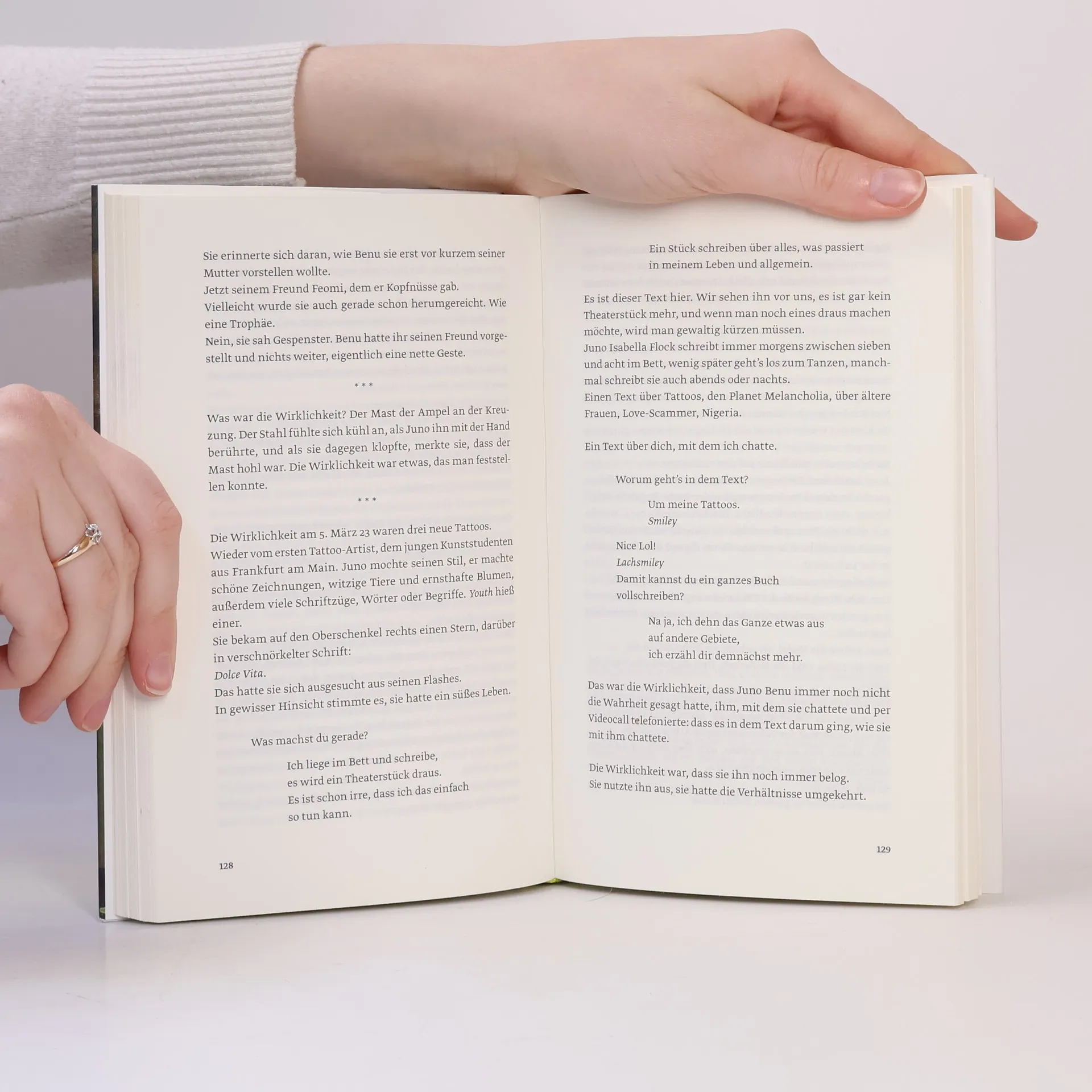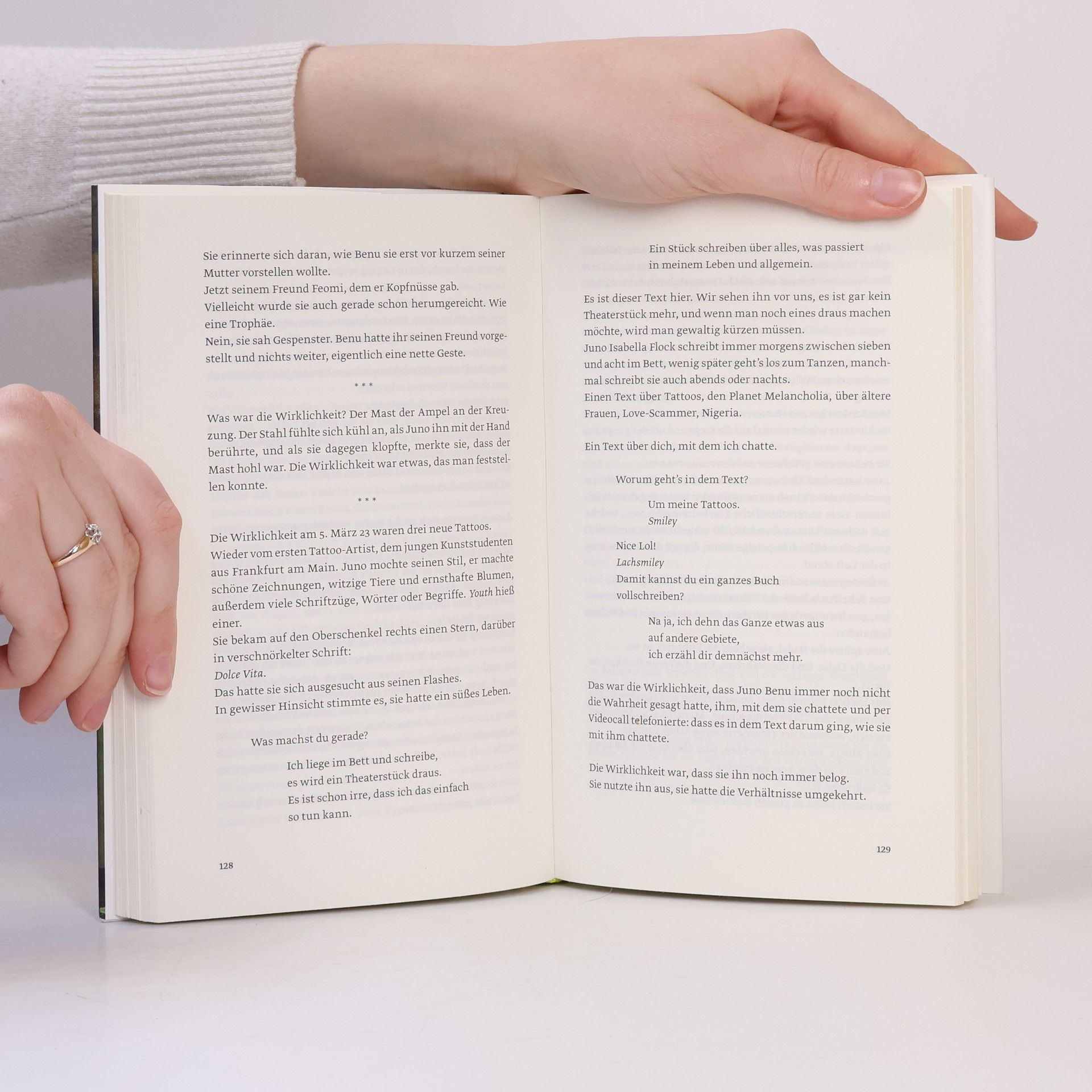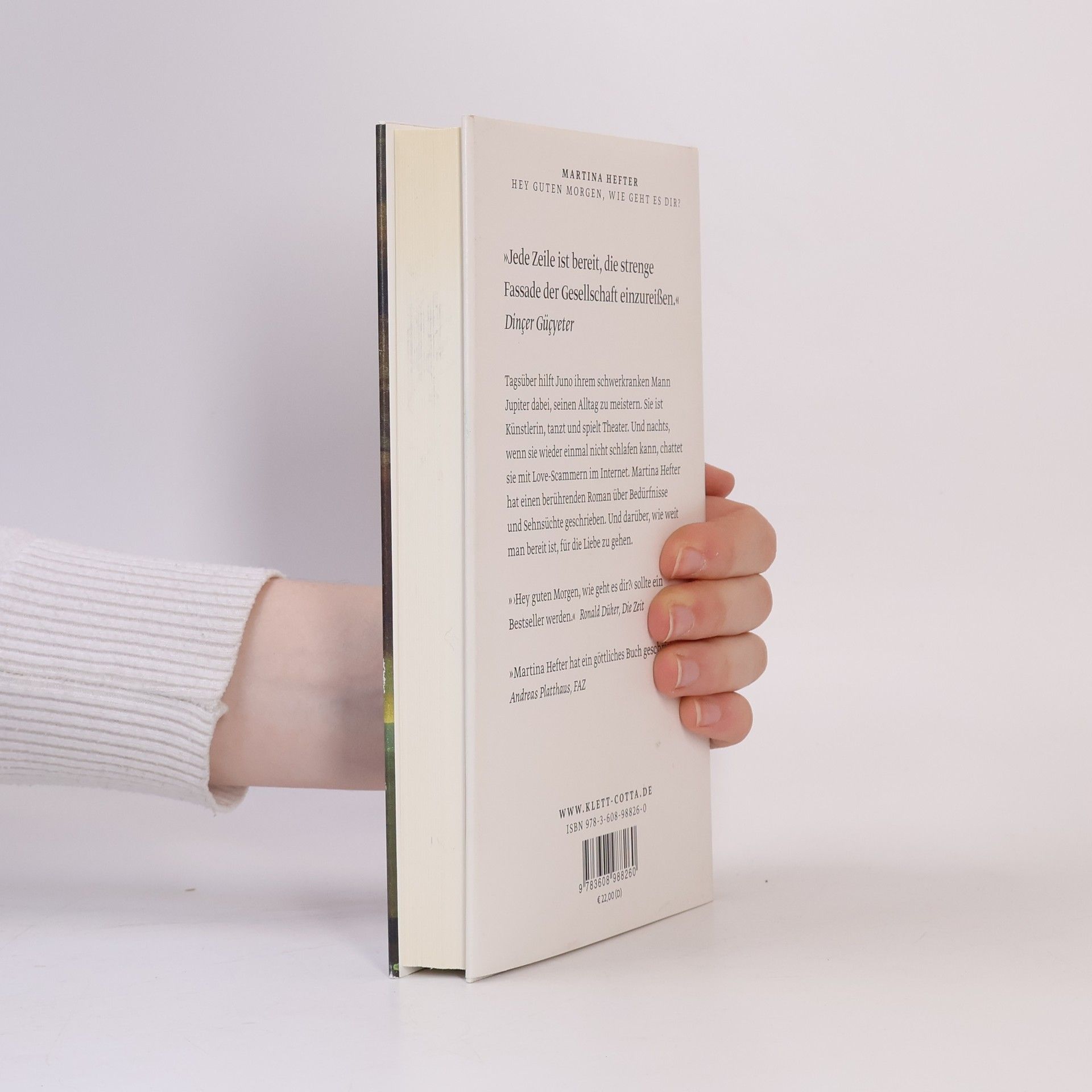 Tagsüber hilft Juno ihrem schwerkranken Mann Jupiter dabei, seinen Alltag zu meistern. Außerdem ist sie Künstlerin, tanzt und spielt Theater. Und nachts, wenn sie wieder einmal nicht schlafen kann, chattet sie mit Love-Scammern im Internet. Martina Hefter hat einen berührenden Roman über Bedürfnisse und Sehnsüchte im Leben geschrieben. Und darüber, wie weit man bereit ist, für die Liebe zu gehen.Juno schreibt online mit Männern, die Frauen online ihre Liebe gestehen und so versuchen, sie um ihr Geld zu bringen. Doch statt darauf hereinzufallen, werden genau diese Männer zu einer Form von Freiheit für Juno. In den Gesprächen kann sie sein, wer sie will und sagen, was sie will – und das vermeintlich ohne Konsequenzen. Ganz im Gegensatz zu ihrem sonstigen Leben, in dem sie immer unterwegs, immer besorgt um Jupiter, immer beschäftigt und eingebunden ist. Also flüchtet Juno ab und zu vor ihrem Alltag ins Internet und spielt dort Spielchen mit Männern, die sie anlügen. Sie selbst wird zur Lügnerin. Aber ist es nicht so, dass man sich beim Lügen zuallererst selbst belügt? Eines Tages trifft Juno auf Benu, der ihre Behauptungen ebenso durchschaut wie sie seine. Und trotz der Entfernung zwischen ihnen entsteht eine Verbindung. »Hey guten Morgen, wie geht es dir« ist ein tiefgehender Roman, aber so leichtfüßig wie eine Komödie.