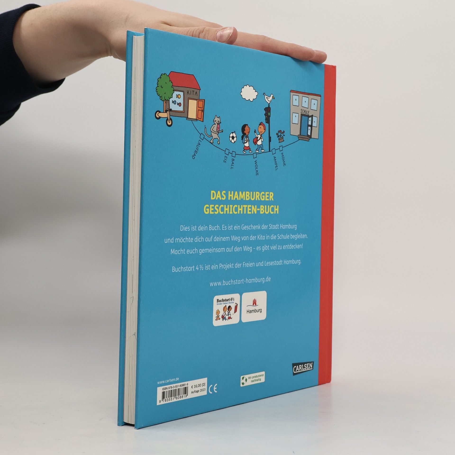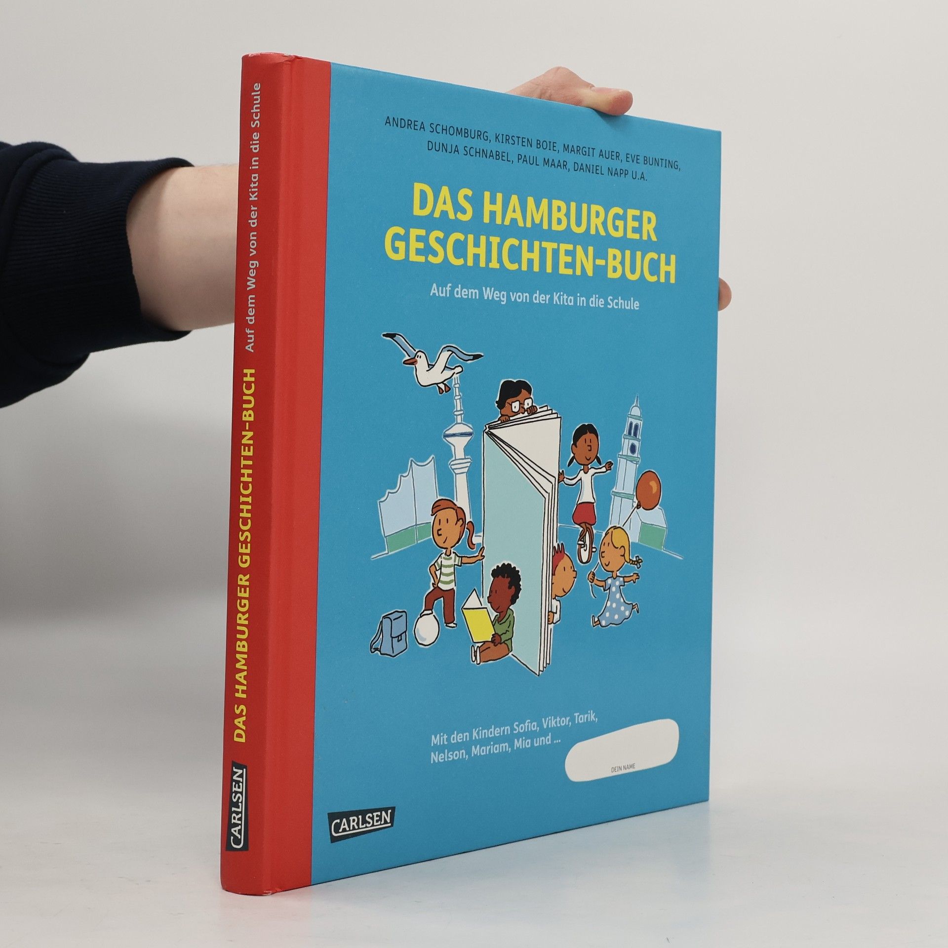Das 134 Seiten dicke "Hamburger Geschichten-Buch" wurde in Kooperation der Schulbehörde, Sozialbehörde, Kulturbehörde, den Bücherhallen Hamburg und dem Projektträger Seiteneinsteiger e.V. gemeinsam mit dem Carlsen-Verlag entwickelt. Es enthält neben Gedichten, Comics und Wimmelbildern viele Vorlesegeschichten von bekannten Autorinnen und Autoren wie Paul Maar, Daniel Napp oder Margit Auer. Die Schriftstellerin Andrea Schomburg steuerte Originalgeschichten rund um die sechs Kinder Mariam, Mia, Nelson, Sofia, Tarik und Viktor bei; diese Freunde erleben typische Situationen aus Kita und Schule. Das Cover gestaltete Ole Könnecke. Das Besondere am Buch: Es hat ein beschreibbares Namensfeld auf dem Cover, und in den bunten Eintragsseiten kann jedes Kind eigene Notizen festhalten. So wird das "Hamburger Geschichtenbuch" zum ganz persönlichen Bücher-Schatz.