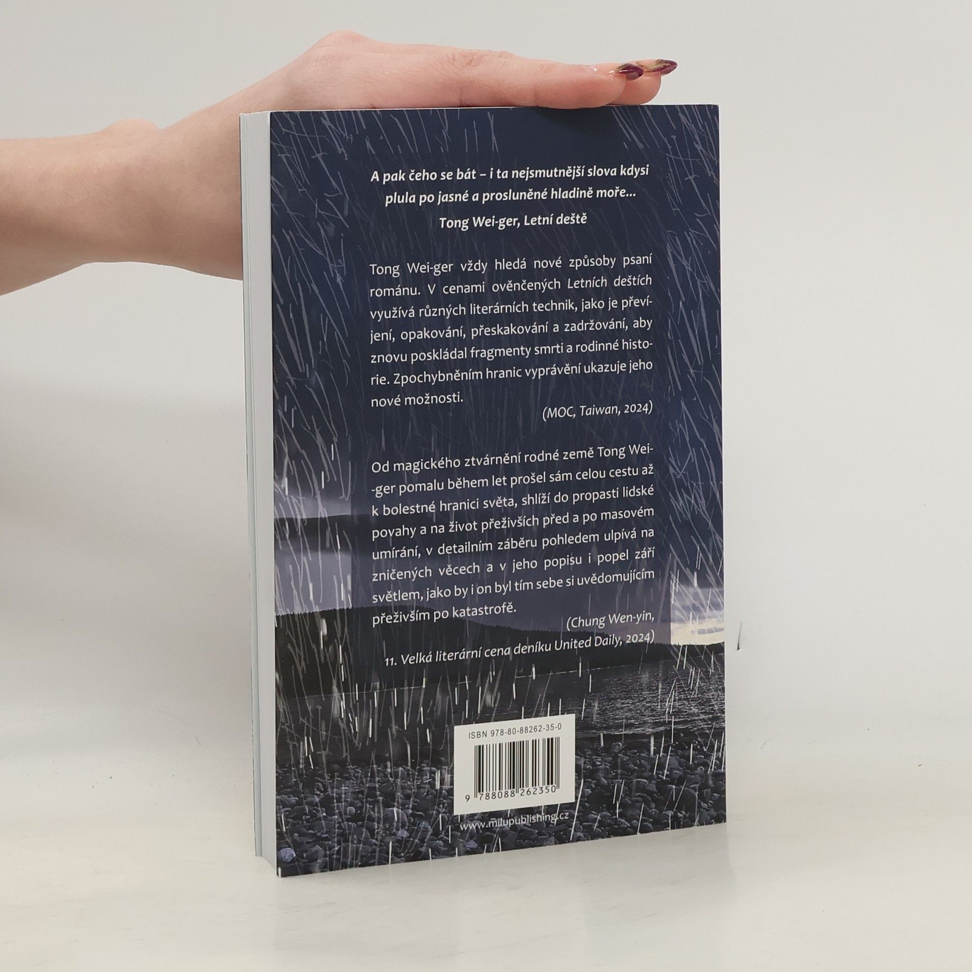 Román Letní deště (2010) lze číst jako detektivku, jako psychologické drama i jako sled surreálných obrazů využívajících specifik tchajwanské imaginace a reálií. Vychází z krajiny autorova dětství, čerpá z místních zvyků, víry a přírody, z pocitů ztrát i vlastní nedostatečnosti, z nostalgie i touhy po vzájemné blízkosti, která překračuje hranice života a smrti. Poutavě vás vtáhne do života čtyř generací jedné rodiny, odhalí traumatické prožitky i cesty k usmíření a podmaní si vás nezaměnitelnou atmosférou vyprávění. Zavede vás na sever Tchaj-wanu do starých čtvrtí měst, do přímořských oblastí a do vesnice v srdci hor a poodhalí vám život na jednom z malých ostrovů v Tchajwanské úžině.