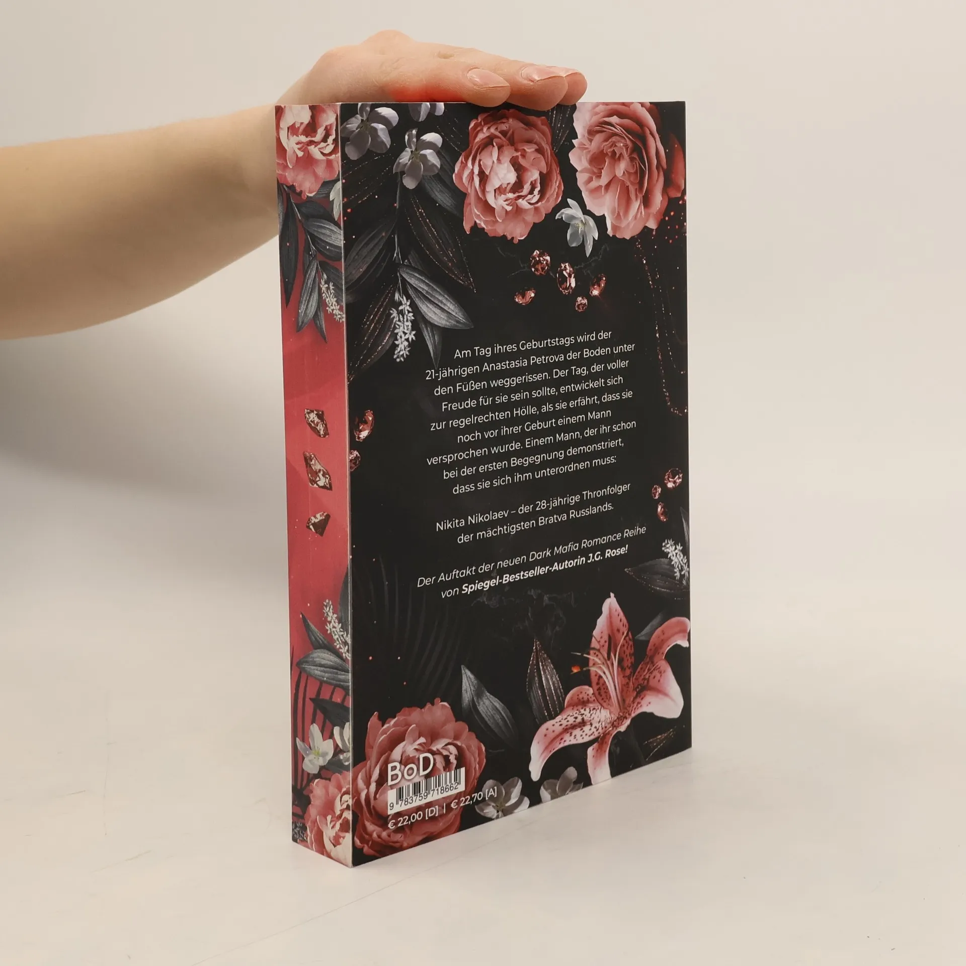 Auftakt der neuen Dark Mafia Romance Reihe von Spiegel-Bestseller-Autorin J.G. Rose! Am Tag ihres Geburtstags wird der 21-jährigen Anastasia Petrova der Boden unter den Füßen weggerissen. Der Tag, der voller Freude für sie sein sollte, entwickelt sich zur regelrechten Hölle, als sie erfährt, dass sie noch vor ihrer Geburt einem Mann versprochen wurde. Einem Mann, der ihr schon bei der ersten Begegnung demonstriert, dass sie sich ihm unterordnen muss: Nikita Nikolaev – der 28- jährige Thronfolger der mächtigsten Bratva Russlands. Dieses Buch zeigt toxische Beziehungsmuster und behandelt Themen, die triggernd sein könnten. Es ist nichts für schwache Nerven.