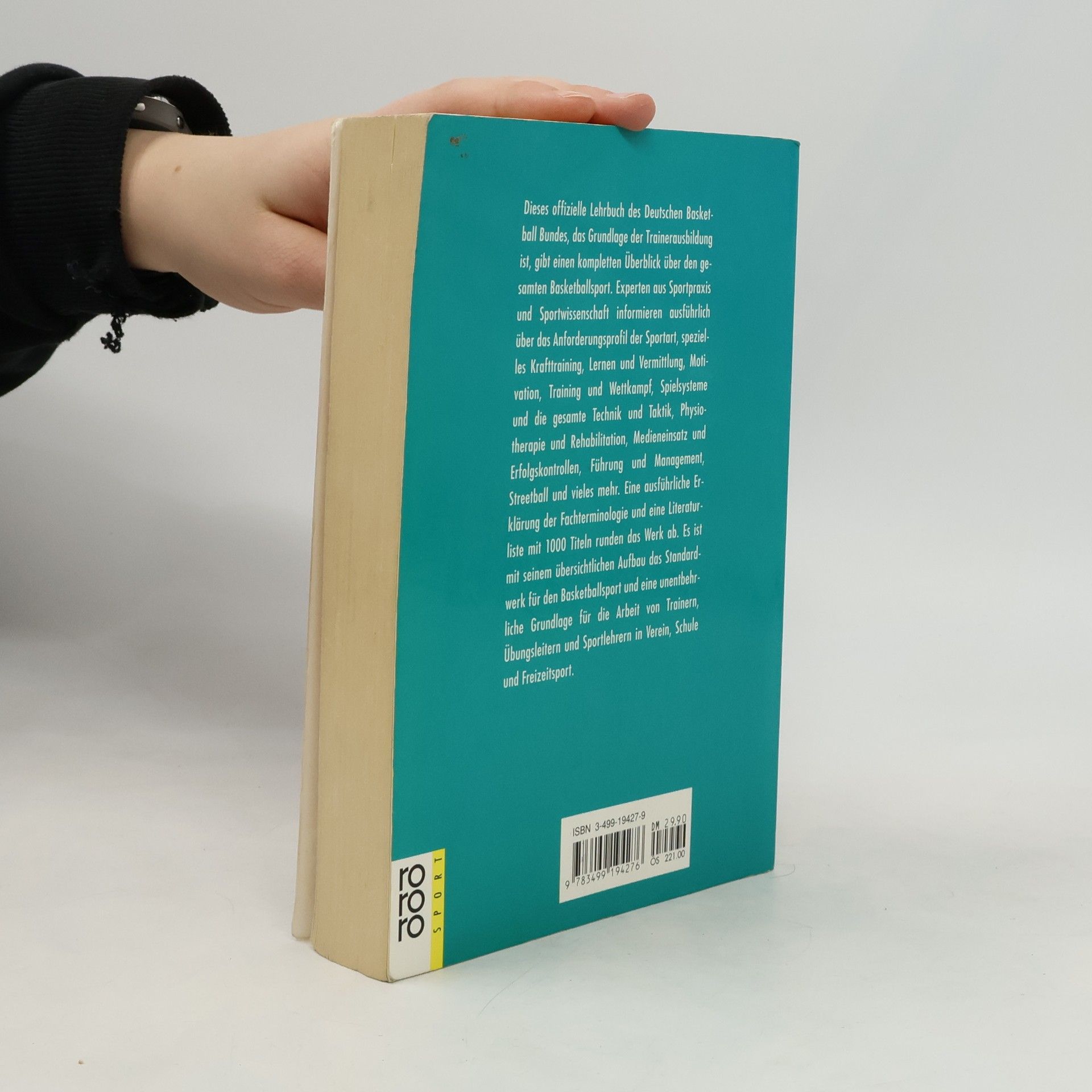 Dieses offizielle Lehrbuch des Deutschen Basketball Bundes, das Grundlage der Trainerausbildung ist, gibt einen kompletten Ueberblick über den gesamten Basketballsport. Experten aus Sportpraxis und Sportwissenschaft informieren ausführlich über das Anforderungsprofil der Sportart, spezielles Krafttraining, Lernen und Vermittlung, Motivation, Training und Wettkampf, Spielsysteme und die gesamte Technik und Taktik, Physiotherapie und Rehabilitation, Medieneinsatz und Erfolgskontrollen, Führung und Management, Streetball und vieles mehr. Eine ausführliche Erklärung der Fachterminologie und eine Literaturliste mit 1000 Titeln runden das Werk ab. Es ist mit seinem übersichtlichen Aufbau das Standardwerk für den Basketballsport und eine unentbehrliche Grundlage für die Arbeit von Trainern, Uebungsleitern und Sportlehrern in Verein, Schule und Freizeitsport.