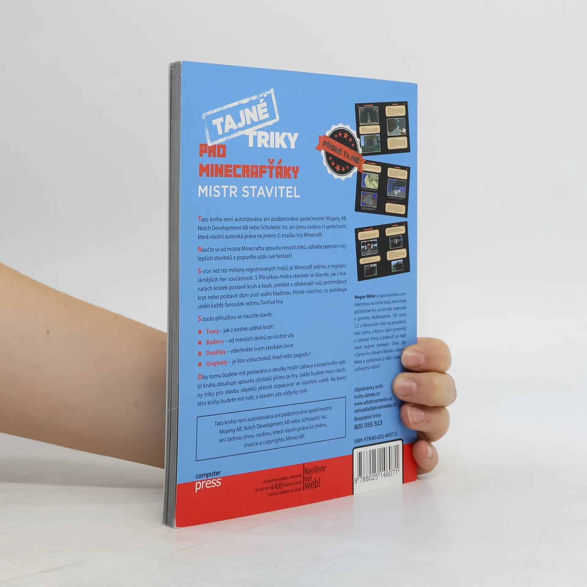 Tato kniha není autorizována ani podporována společnostmi Mojang AB, Notch Development AB nebo Scholastic Inc. ani jinou osobou či společností, která vlastní autorská práva na jméno či značku hry Minecraft. Naučte se od mistra Minecraftu spoustu nových triků, odhalte tajemství nejlepších stavitelů a popusťte uzdu své fantazii! S více než sto miliony registrovaných hráčů je Minecraft jednou z nejpopulárnějších her současnosti. S Příručkou mistra stavitele se dozvíte, jak z hranatých kostek postavit kruh a kouli, zvelebit a zdokonalit svůj protimobový kryt nebo postavit dům pod vodní hladinou. Prostě všechno, co potřebuje vědět každý fanoušek režimu Tvořivá hra. S touto příručkou se naučíte stavět: - Tvary – jak z kostek udělat kruh? - Budovy – od menších domů po složité vily - Doplňky – vdechněte svým stavbám život - Originály – je libo vzducholoď, hrad nebo pagodu? Díky tomu budete mít postaráno o desítky hodin zábavy a kreativního vyžití! Kniha obsahuje spoustu obrázků přímo ze hry, takže budete moci všechny triky pro stavbu objektů přesně zopakovat ve vlastním světě. Na konci této knihy budete mít svět, o kterém jste vždycky snili.