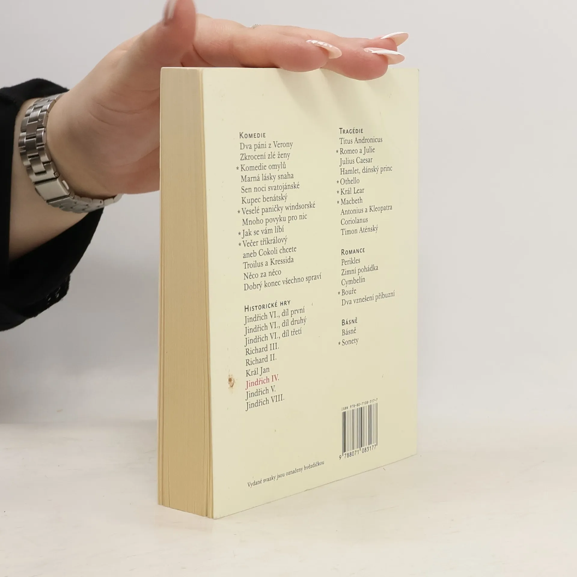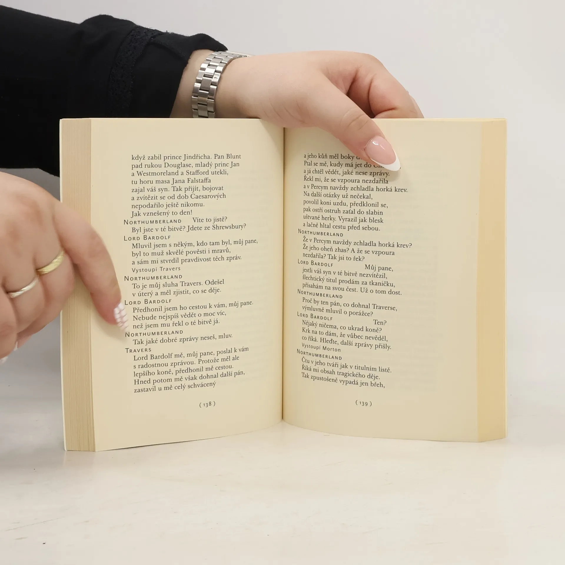 Jindřich IV., první díl a Jindřich IV., druhý díl v jednom svazku. Jindřich IV. se od ostatních Shakespearových historických her liší hned v několika významných ohledech. Především je to jediná Shakespearova historická hra, která zřetelně (zvláště v prvním dílu) směřuje ke komedii. Její děj se odehrává v královských síních, v londýnských hospodách i na bitevních polích, nevystupují v ní jen angličtí, skotští a velšští šlechtici, ale také Falstaffovi kumpáni, naháněči zlodějů, povozníci, podkoní, pocestní, šerifové a číšníci. Žádná z těchto postav nemá na rozdíl od postav šlechticů a soudců historické předlohy, všechny jsou výtvorem Williama Shakespeara, a všechny zároveň tvoří podstatnou součást téměř breughelovsky zalidněného světa, jemuž vévodí rytíř Jan Falstaff.