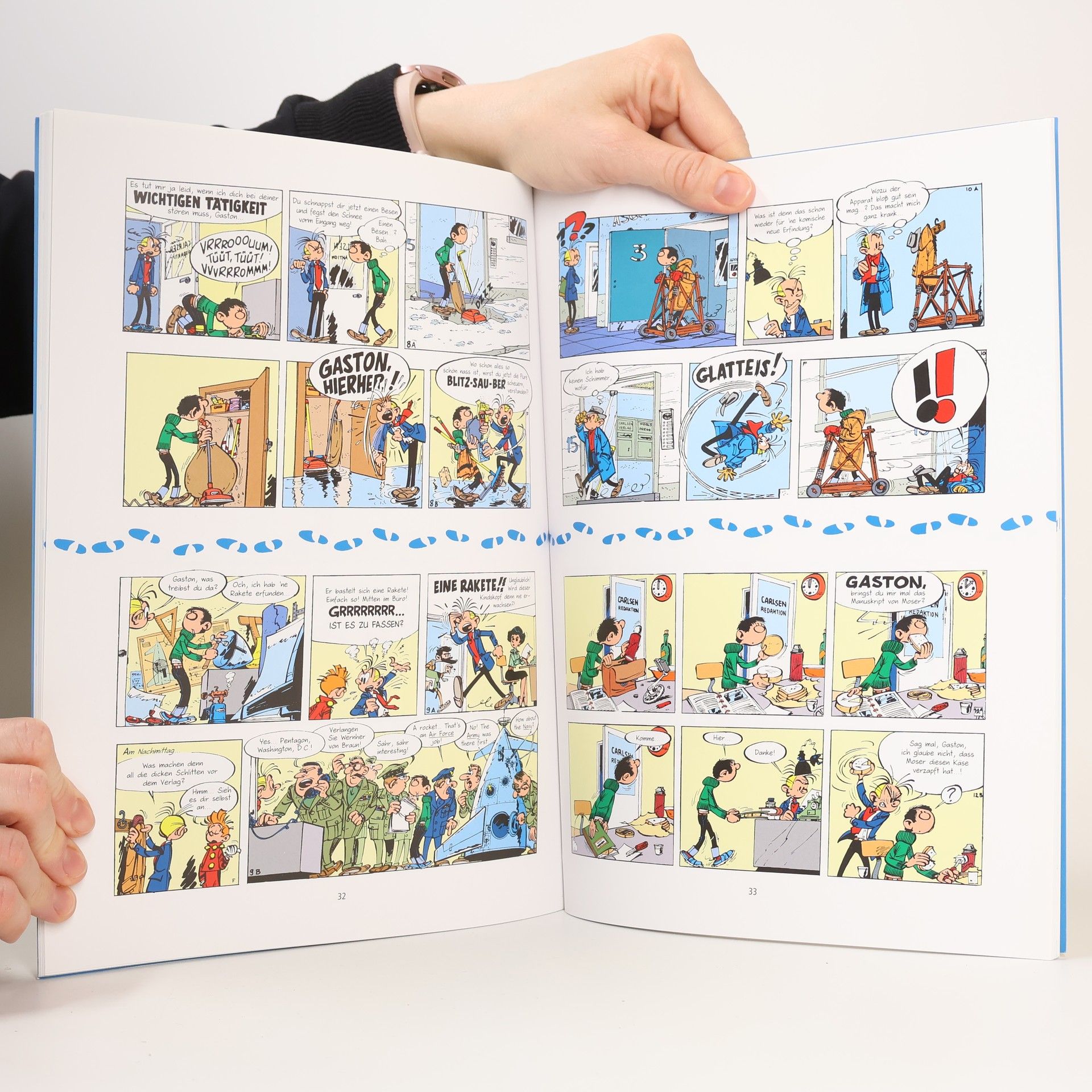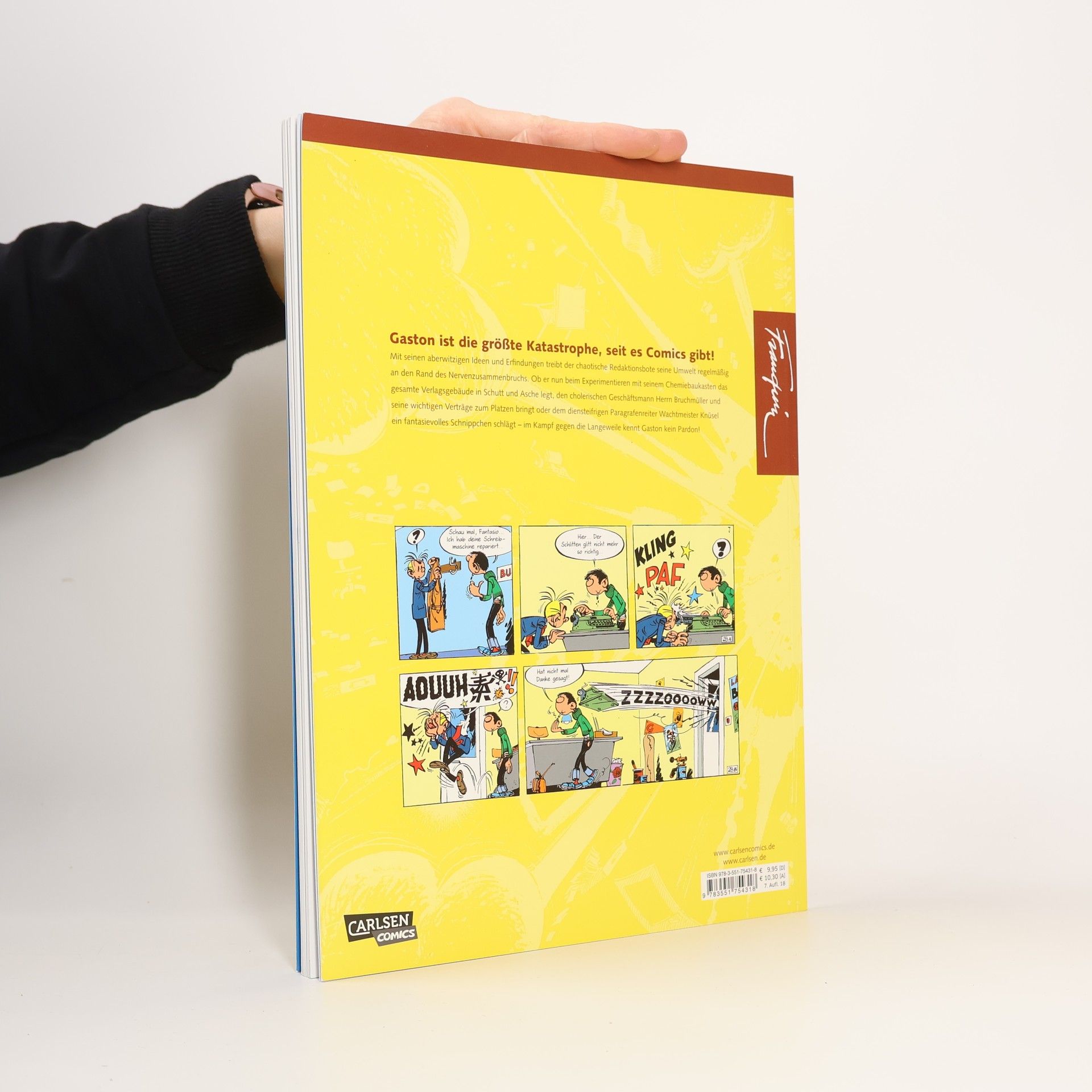 Gaston ist die größte Katastrophe, seit es Comics gibt. Mit seinen aberwitzigen Ideen und Erfindungen bringt er die gesamte Redaktion eines Comic-Verlages regelmäßig an den Rand des Nervenzusammenbruchs und wichtige Verträge zum Platzen. Die skurrilen Eskapaden des chaotischen Redaktionsboten aus der Feder des belgischen Ausnahmezeichners André Franquin sind in ihrem Witz und ihrer überbordenden Fantasie eine unerreichte Sternstunde des europäischen Comics. Carlsen legt die gesamte Reihe in 19 Bänden neu auf und bietet den Freunden des Chaotischen Büroboten die Möglichkeit, alle seine Eskapaden zu genießen.