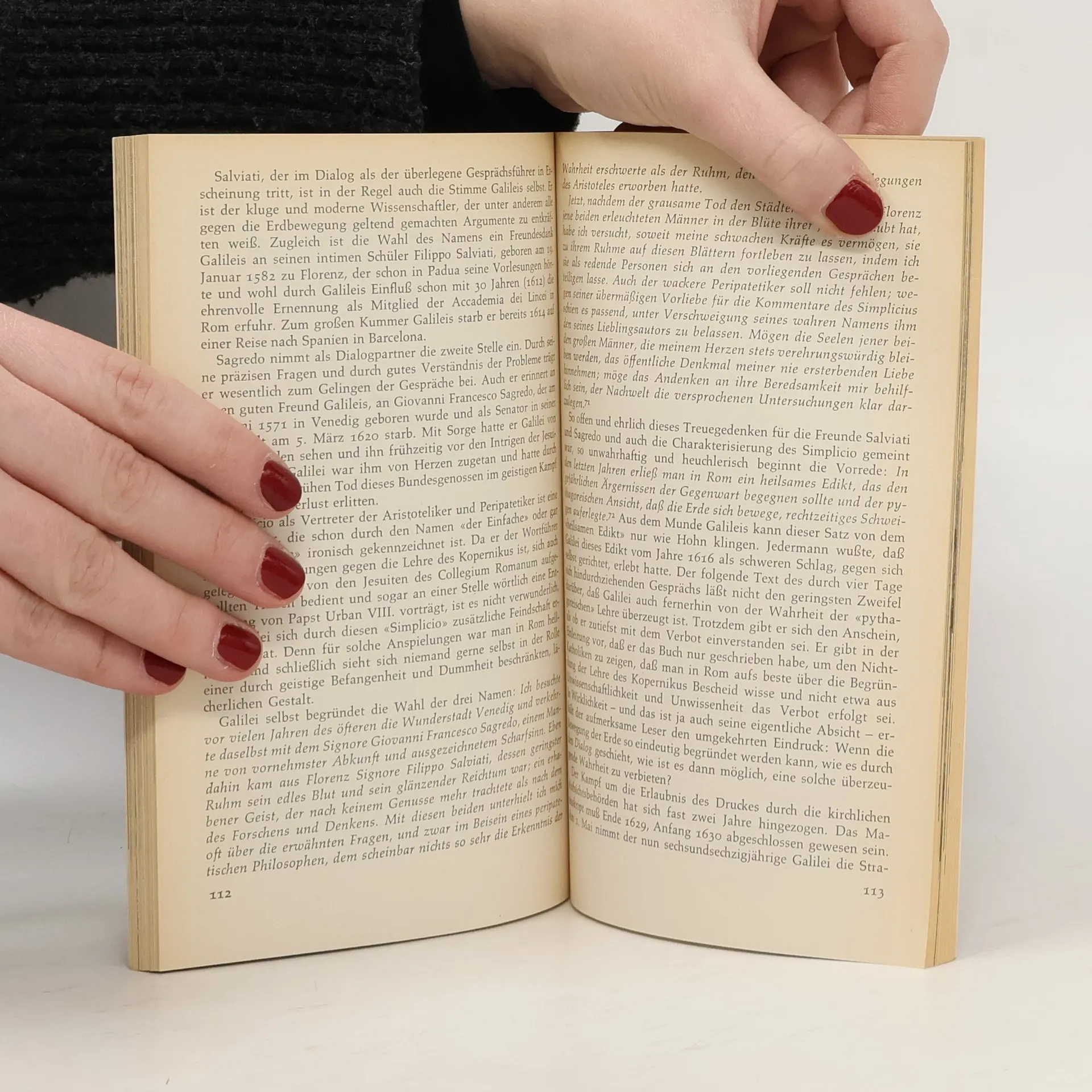 «Ich, Galilei, Sohn des Vinzenz Galilei aus Florenz, siebzig Jahre alt, stand persönlich vor Gericht und ich knie vor Euch Eminenzen, die Ihr in der ganzen Christenheit die Inquisitoren gegen die ketzerische Verworfenheit seid. Ich habe vor mir die heiligen Evangelien, berühre sie mit der Hand und schwöre, daß ich immer geglaubt habe, auch jetzt glaube und mit Gottes Hilfe auch in Zukunft glauben werde, alles was die heilige katholische und apostolische Kirche für wahr hält, predigt und lehrt. Es war mir von diesem Heiligen Offizium vom Rechts wegen die Vorschrift auferlegt worden, dass ich völlig die falsche Meinung aufgeben müsse, dass die Sonne der Mittelpunkt der Welt ist, und dass sie sich nicht bewegt, und das die Erde nicht der Mittelpunkt der Welt ist, und dass sie sich bewegt. ...»
