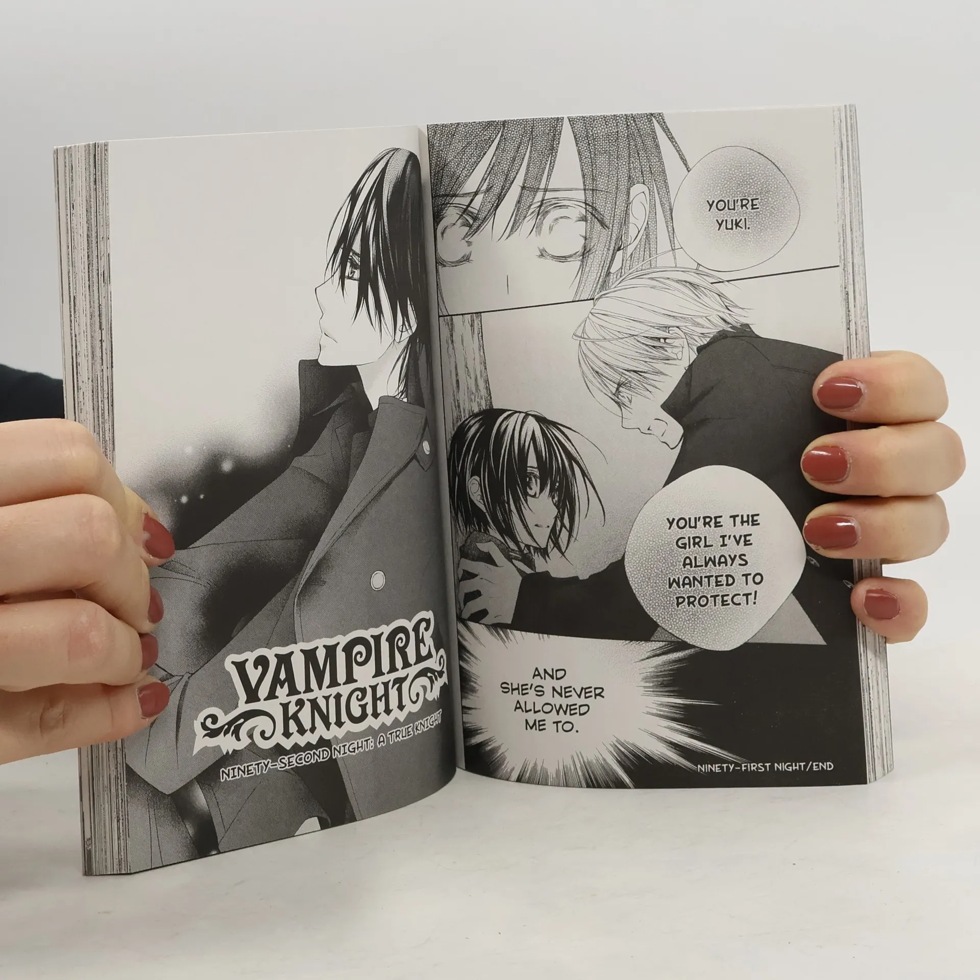 Cross Academy is attended by two groups of students: the Day Class and the Night Class. At twilight, when the students of the Day Class return to their dorm, they cross paths with the Night Class on their way to school. Yuki Cross and Zero Kiryu are the Guardians of the school, protecting the Day Class from the Academy's dark secret: the Night Class is full of vampires! Kaname vows to sacrifice himself. Yuki vows to sacrifice herself to stop him. Zero takes a weapon in hand to protect what is dear to him. Whether parted for eternity or close enough to touch, they each will always desire their beloved…