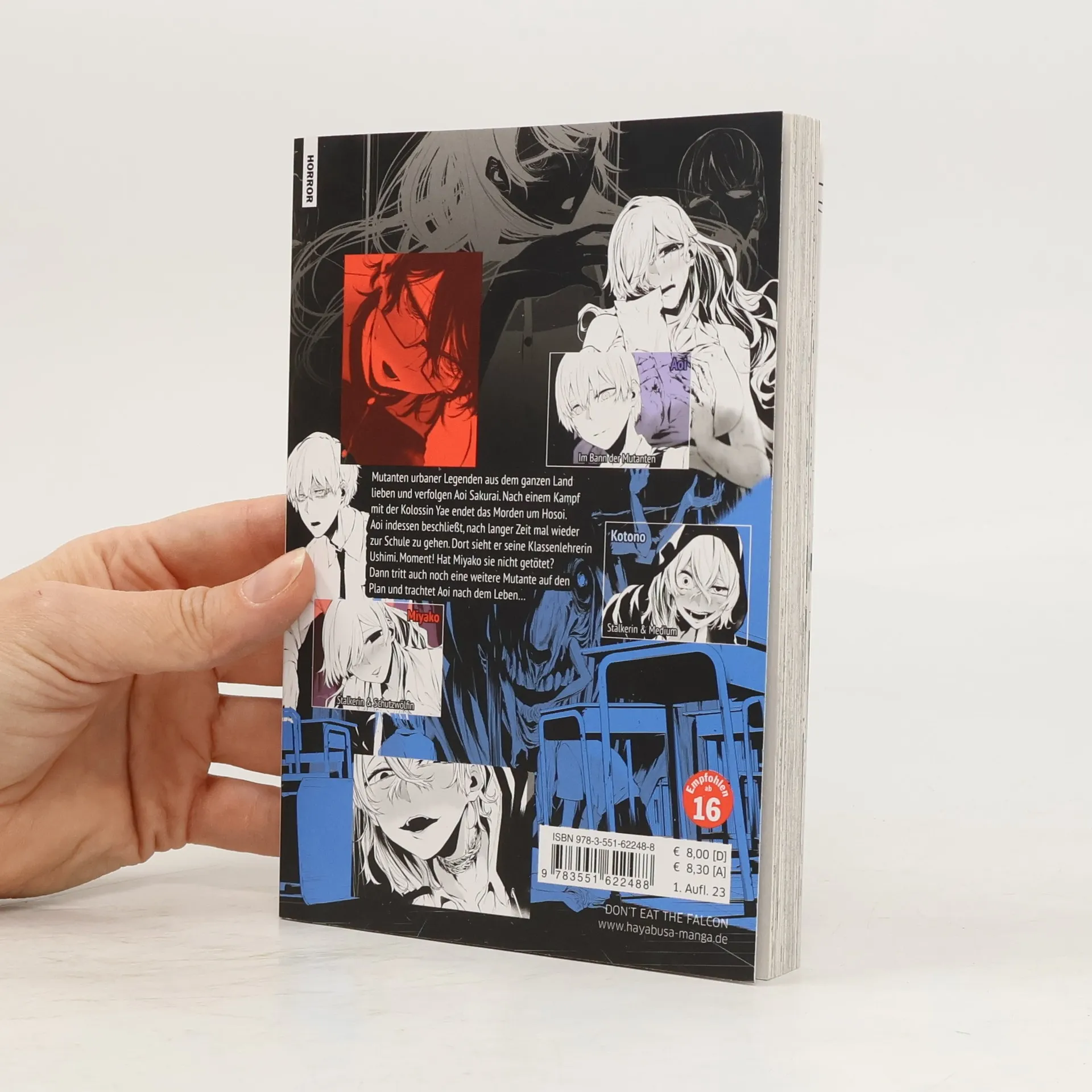 Übernatürlicher Horrorthriller-Manga über aufdringliche Yokai und toxische Beziehungen Monster urbaner Legenden aus dem ganzen Land lieben und verfolgen den Aoi Sakurai. Nach einem Kampf mit der Kolossin Yae endet das Morden um Hosoi. Aoi indessen beschließt, nach langer Zeit mal wieder zur Schule zu gehen. Dort trifft er auf seine Klassenlehrerin Ushimi. Moment! Hat Miyako sie nicht getötet? Dann tritt auch noch eine weitere Mutante auf den Plan und trachtet Aoi nach dem Leben. »August 9th, I will be eaten by you«: die Haute Cuisine des Body-Horrors Der Überraschungshit aus Japan konstruiert einen albtraumhaften Alltag, der das Grauen des Übernatürlichen mit realistischen Ängsten vermischt. Blutiger Horror-Manga mit übernatürlichen Wesen Für Fans von »Tokyo Ghoul« und »Teach me how to kill« Die Serie gilt noch nicht als abgeschlossen Empfohlen für Leser*innen ab 16 Jahren Grauenhafte Yokais, blutige Überlebenskämpfe und ein Artwork, bei dem einem das Wasser im Munde zusammenläuft.