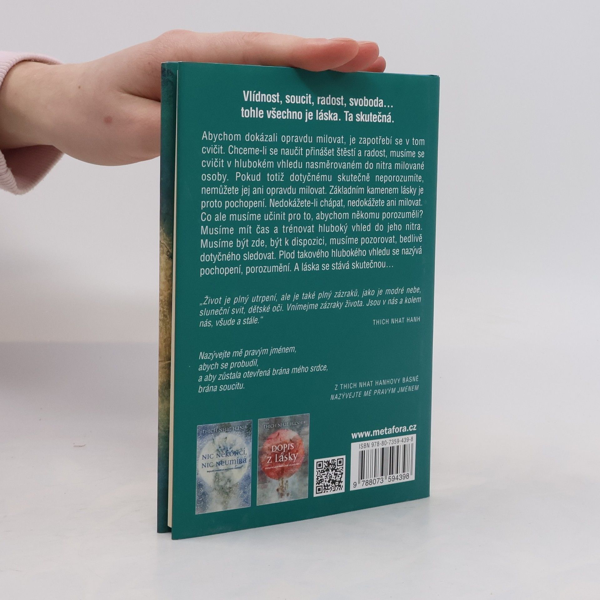 Vlídnost, soucit, radost, svoboda... tohle všechno je láska. Ta skutečná. Milovat a být milován. Kdo by po tom netoužil. Mnozí se ale domnívají, že je to jen nesplnitelný ideál. A přitom je to tak snadné. Thich Nhat Hanh, buddhistický mnich a známý učitel duchovních pravd, nabízí jednoduchou metodu s ohromujícími výsledky. Úplně stačí, když se naučíme být s plným uvědoměním v právě přítomném okamžiku. Soustředit se na vlastní dech a pak pronést jednu z manter. I ty jsou krásně prosté. Jako třeba tahle: „Má drahá, můj drahý, jsem tu pro tebe." A zázraky se začnou dít. „Abychom dokázali opravdu milovat, je zapotřebí se v tom cvičit. Chceme-li se naučit přinášet štěstí a radost, musíme se cvičit v hlubokém vhledu nasměrovaném do nitra milované osoby," říká autor téhle knihy.