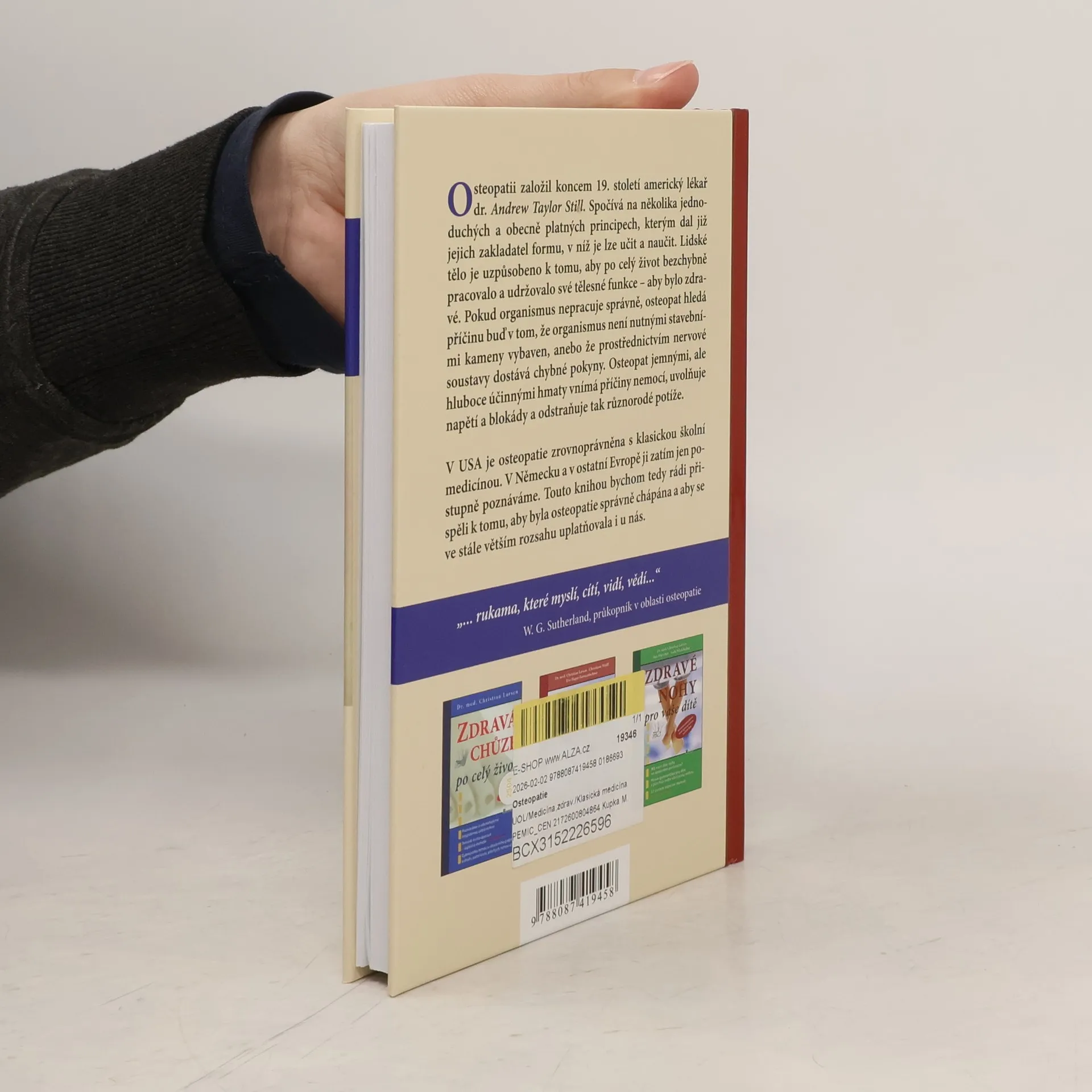 Osteopatii založil koncem 19. století americký lékař dr. Andrew Taylor Still. Spočívá na několika jednoduchých a obecně platných principech, kterým dal již jejich zakladatel formu, v níž je lze učit a naučit. Lidské tělo je uzpůsobeno k tomu, aby po celý život bezchybně pracovalo a udržovalo své tělesné funkce – aby bylo zdravé. Pokud organismus nepracuje správně, osteopat hledá příčinu buď v tom, že organismus není nutnými stavebnímikameny vybaven, anebo že prostřednictvím nervové soustavy dostává chybné pokyny. Osteopat jemnými, ale hluboce účinnými hmaty vnímá příčiny nemocí, uvolňuje napětí a blokády a odstraňuje tak různorodé potíže. V USA je osteopatie zrovnoprávněna s klasickou školní medicínou. V Německu a v ostatní Evropě ji zatím jen postupně poznáváme.