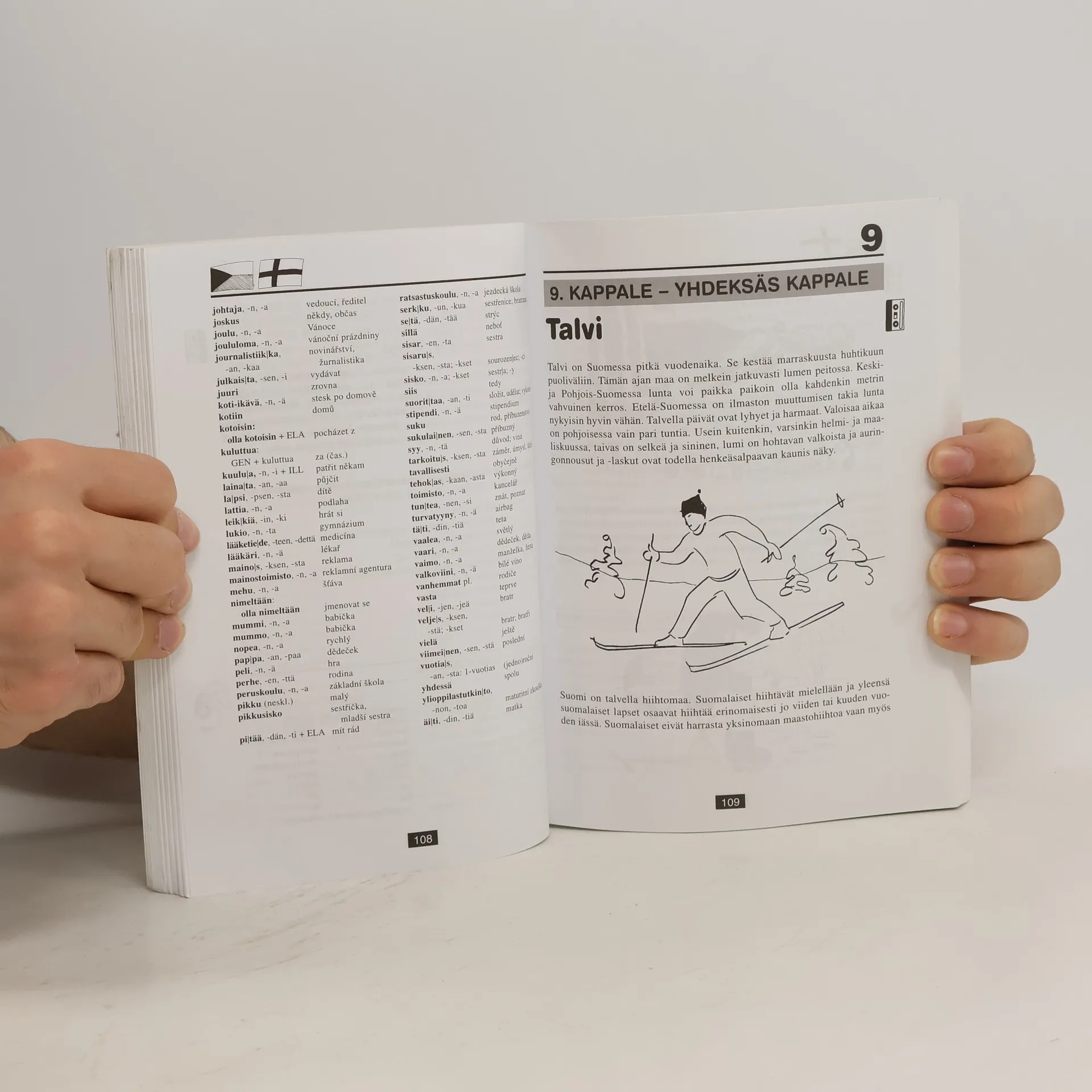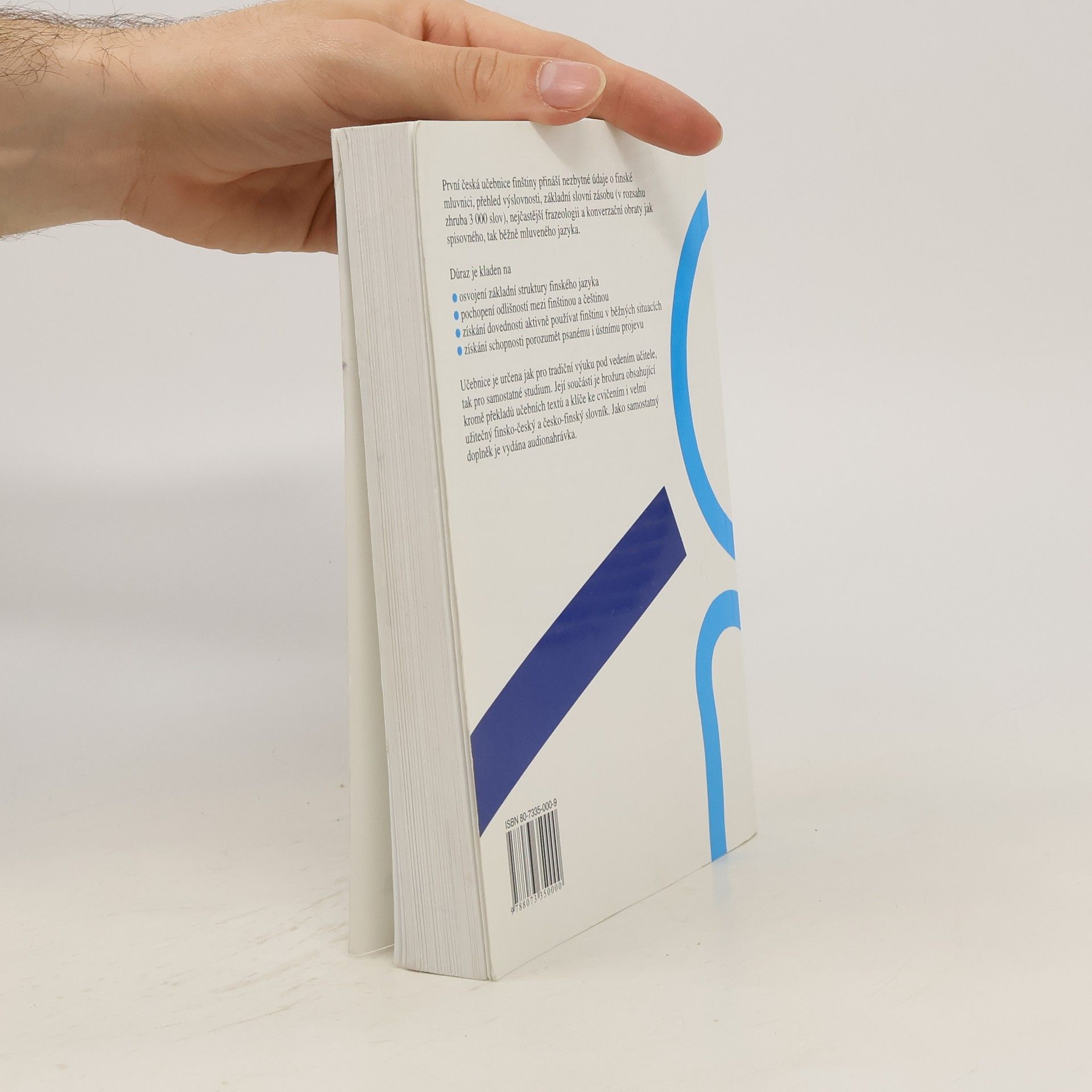 První učebnice finského jazyka v češtině nabízí v 31 lekcích úplné základy současné finštiny. Je určena především pro kursy pod vedením učitele, který může doplňovat a rozvádět vše, co – ve snaze pojmout do knihy co nejvíce – mohlo být naznačeno nebo procvičeno jen stručně. Svým uspořádáním je však vhodná i pro samouky. Součástí učebnice je slovník finsko-český obsahující zhruba 3000 hesel a česko-finský o rozsahu zhruba 1000 hesel, dále klíč s řešením cvičení v lekcích a s českými překlady textů a rozhovorů ze všech lekcí.
