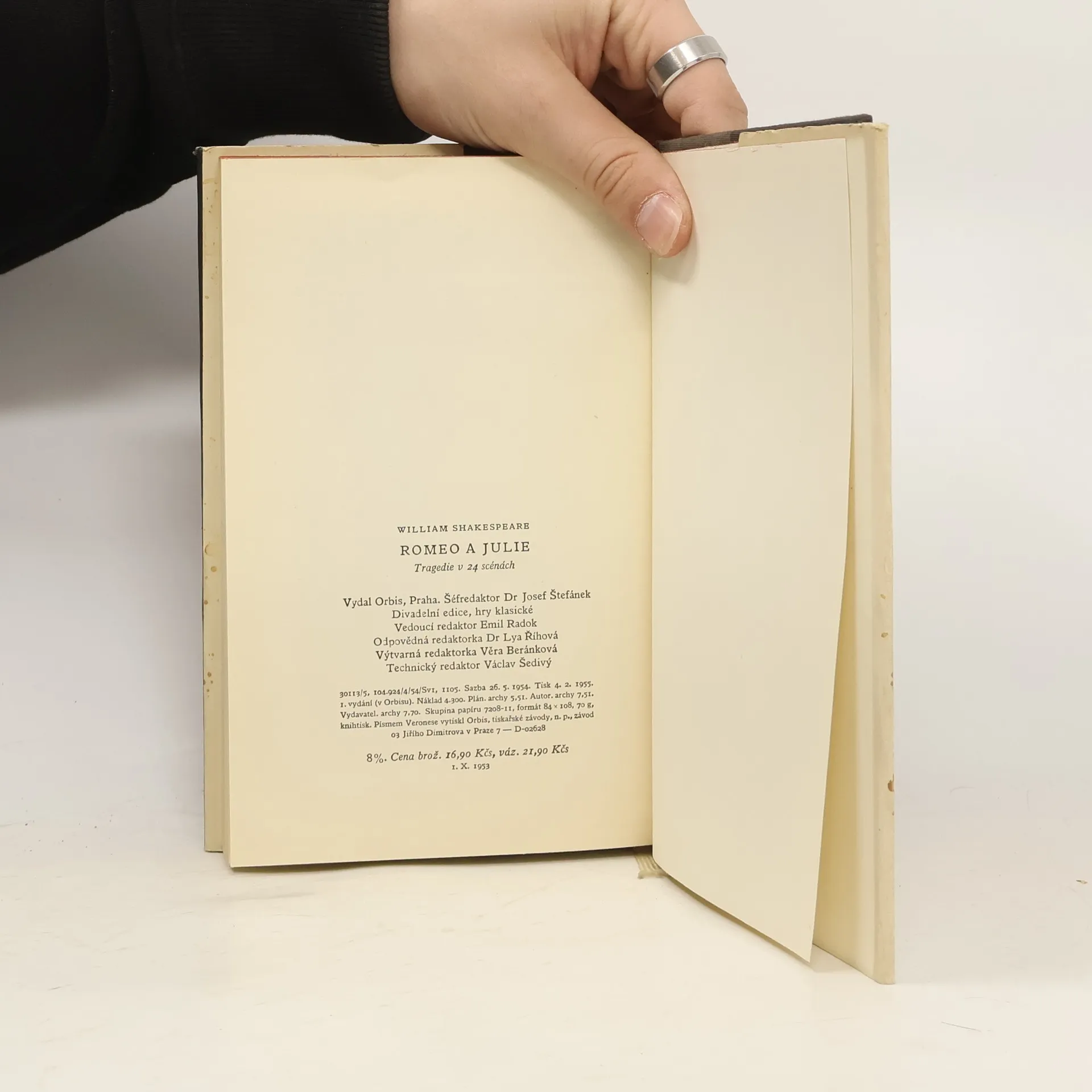 První původní Shakespearova tragedie, kterou básník napsal v jednatřiceti letech. - Dějovým podkladem hry je italská středověká pověst o Romeovi a Julii. Ústřední postavy jsou však svou vášnivou citovostí, rozumovostí,odvahou, samostatností a sebevědomím typickými lidmi pozdní anglické renesance. Hlavní dějový konflikt - milostná tragedie Romea a Julie - se odehrává na pozadí bouřlivé Verony uprostřed světa rozervaného sváry dvou mocnýchrodů, Monteků a Kapuletů. Srážka mladistvě čistého myšlení a cítění Juliina a Romeova s okolním světem a jeho předsudky, zrozenými ve starém světě feudálním i nově vznikajícím světě kapitalistickém, tvoří hlavní idieovou náplňhry. - Překlad je doprovozen obšírným historickým doslovem, zmiňujícím se i o jednotlivých inscenacích hry u nás.