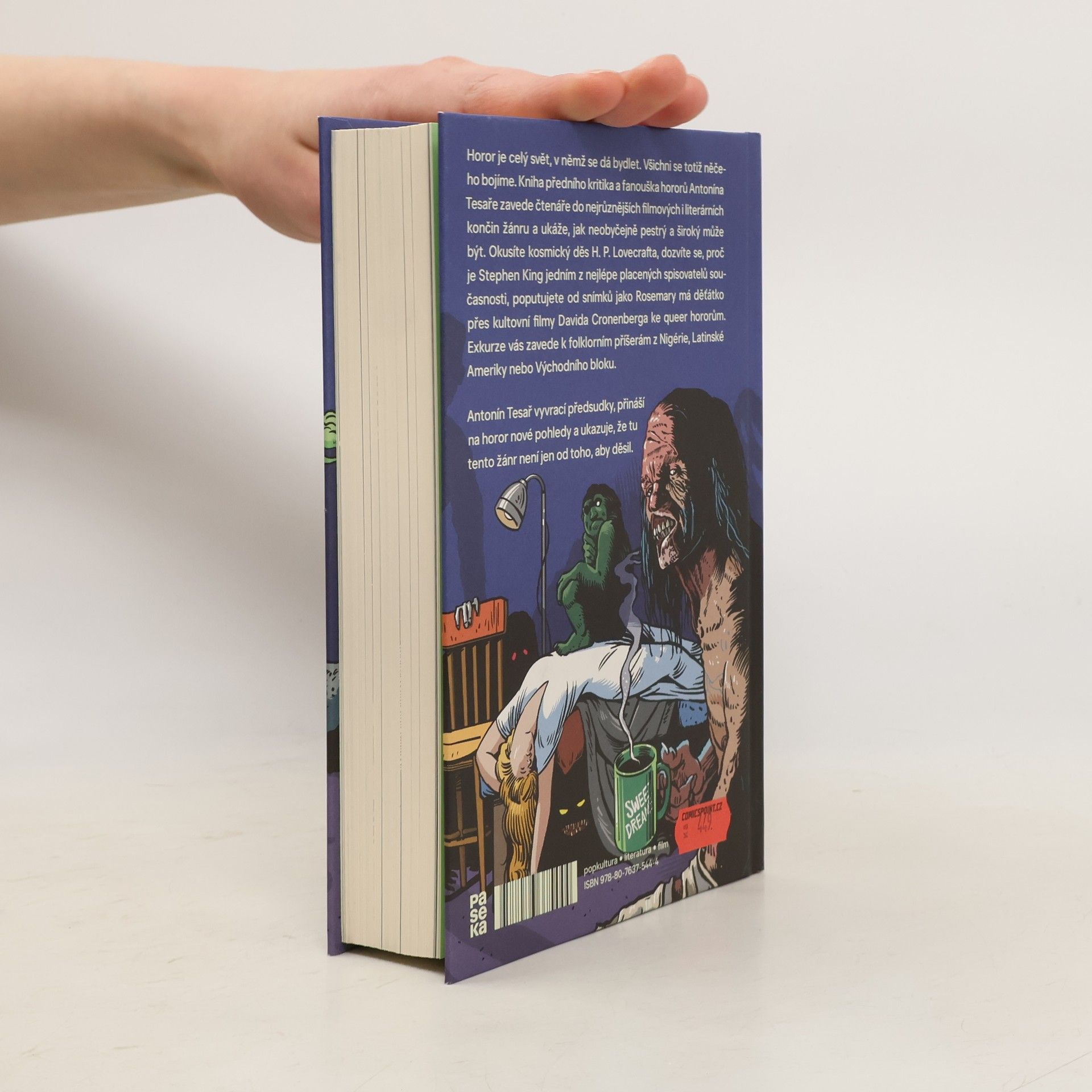 Horor je celý svět, v němž se dá bydlet. Všichni se totiž něčeho bojíme. Kniha předního kritika a fanouška hororů Antonína Tesaře zavede čtenáře do nejrůznějších filmových i literárních končin tohoto žánru a ukáže, jak neobyčejně pestrý a široký může být. Okusíte kosmický děs H. P. Lovecrafta, dozvíte se, proč je Stephen King jedním z nejlépe placených spisovatelů současnosti, poputujete od snímků jako Rosemary má děťátko přes kultovní filmy Davida Cronenberga až po queer horory. Exkurze vás zavede k folklorním příšerám z Nigérie, Latinské Ameriky nebo Východního bloku. Antonín Tesař vyvrací předsudky, přináší nové pohledy na horor a ukazuje, že tu tento žánr není jen od toho, aby děsil. Vychází s doslovem Ivana Adamoviče.