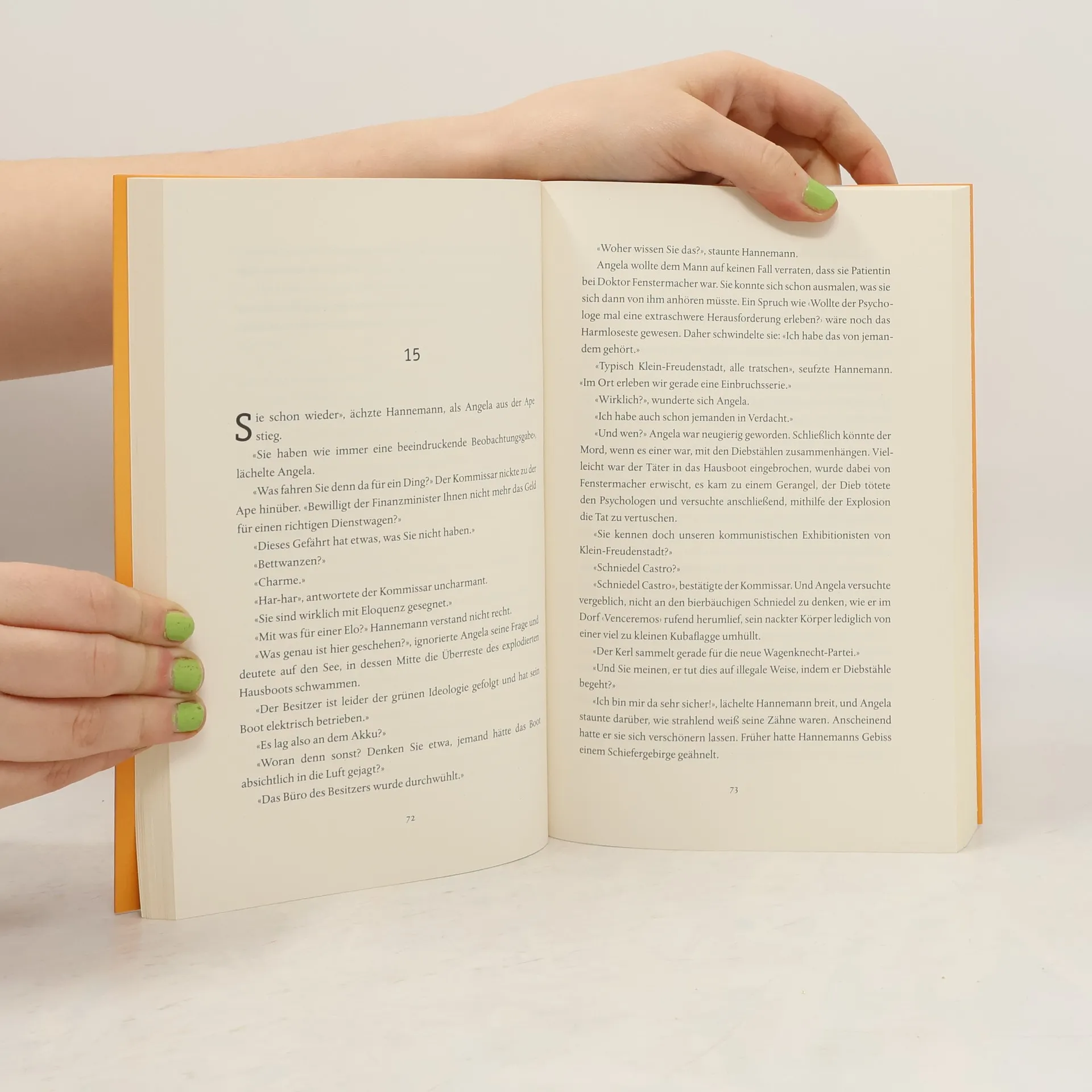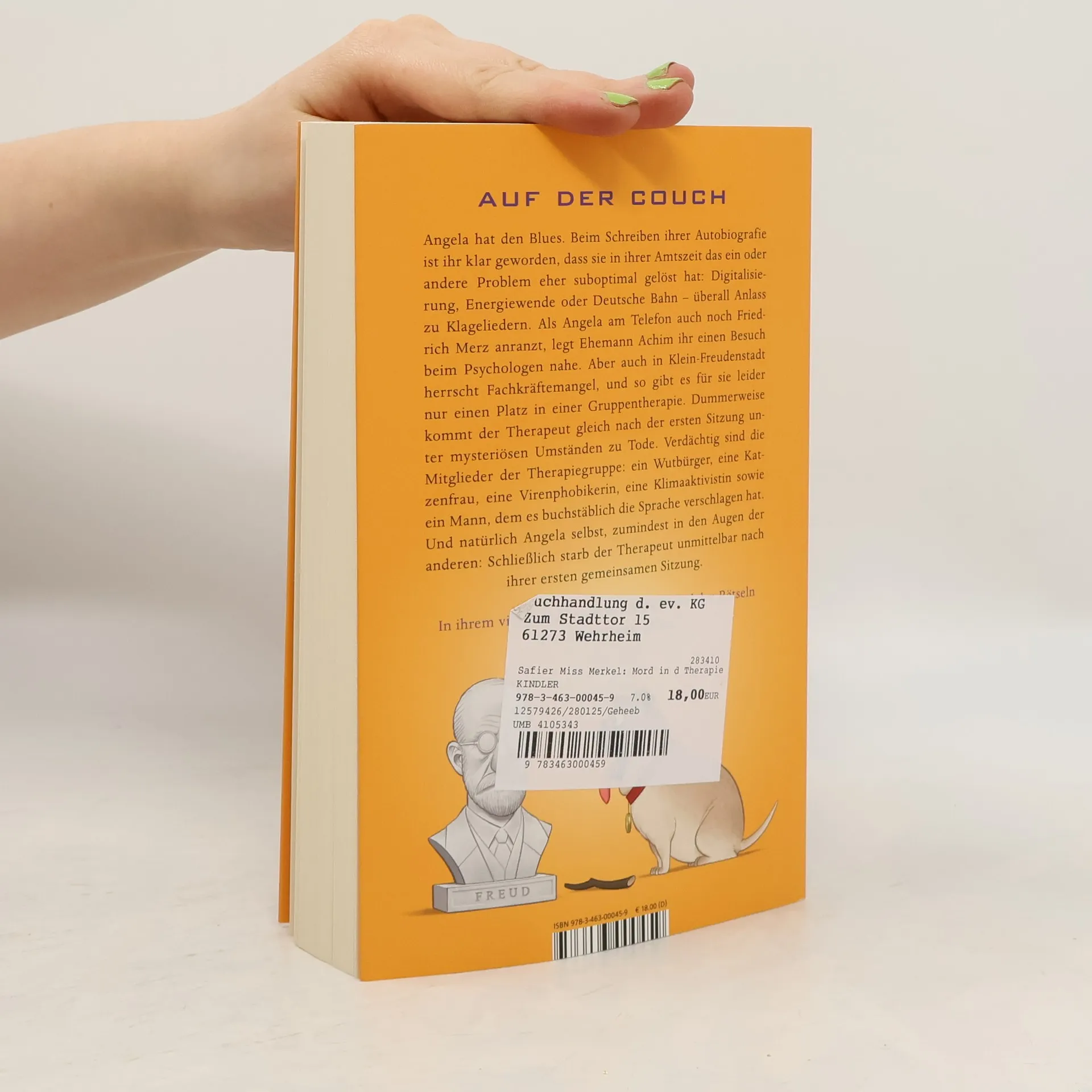Der vierte Band der Bestseller-Krimireihe um die ermittelnde Altkanzlerin Angela ist niedergeschlagen. Beim Schreiben ihrer Autobiografie ist ihr klar geworden, dass sie in ihrer Amtszeit das ein oder andere Problem des Landes eher suboptimal gelöst hat. Sei es zum Beispiel die Digitalisierung, die Energiewende oder die Bundesbahn, die allesamt Anlass zu Klagegebeten geben. Nachdem Angela auch noch Friedrich Merz anranzt, schlägt Ehemann Achim ihr einen Besuch beim Psychologen vor. Da aber auch in Angelas beschaulichem Heimatort Klein-Freudenstadt Fachkräftemangel herrscht, gibt es für sie nur einen Platz in einer Gruppentherapie bei Doktor Felix Fenstermacher. Dummerweise wird der Therapeut gleich nach der ersten Sitzung auf seinem Hausboot in die Luft gesprengt. Angela bekommt dadurch gleich viel bessere Laune, endlich kann sie wieder ermitteln. Verdächtig sind die Mitglieder der Gruppe: ein Wutbürger, eine Katzenfrau, eine Viren-Phobikerin, eine Klimaaktivistin und ein Mann, dem es buchstäblich die Sprache verschlagen hat. Allerdings fällt der Verdacht der anderen erst einmal auf Angela selbst, schließlich starb der Therapeut gleich nach ihrer ersten gemeinsamen Sitzung.