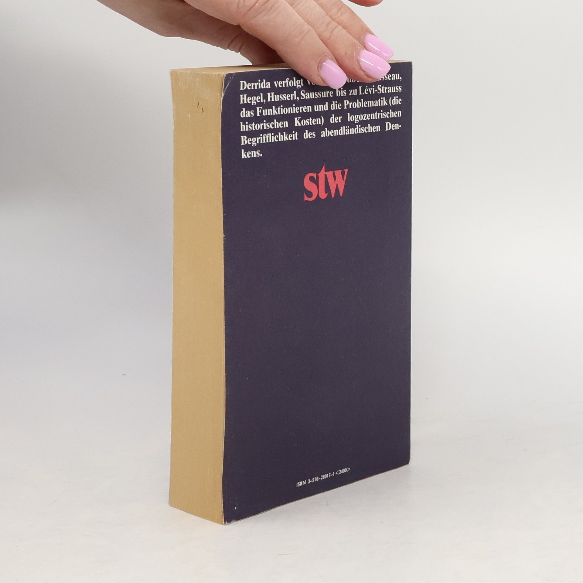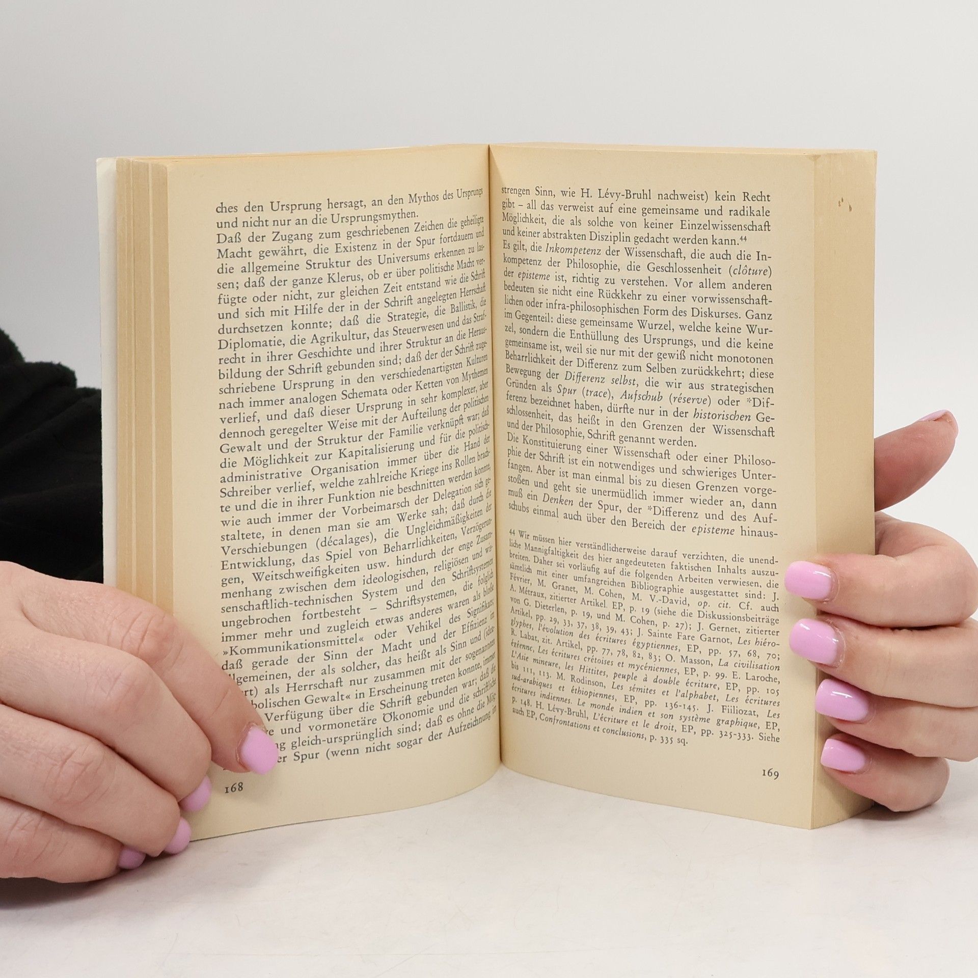Unter dem Titel Grammatologie erarbeitet Jacques Derrida eine Theorie der Schrift, des Zeichens, des Bezeichnens, die eine Reihe tradierter Vorstellungen und Begriffe in Frage stellt, u. a.: Vernunft, Ursprung, Subjekt, Geschichte (die immer nur eine Geschichte der »Vernunft« gewesen sei). Im ersten Teil des Buches - »Die Schrift vor dem Buchstaben« - entwirft Derrida eine theoretische Grundlage, die er im zweiten Teil - »Natur, Kultur, Schrift« - an einem Schlüsseltext des europäischen Logozentrismus überprüft, an Rousseaus Essai sur l'origine des langues , dessen (von Lévi-Strauss her unternommene) Lektüre zu einer Lektüre der Epoche Rousseaus wird. Derrida verfolgt von Plato über Rousseau, Hegel, Husserl, Saussure bis zu Lévi-Strauss das Funktionieren und die Problematik (die historischen Kosten) der logozentrischen Begrifflichkeit des abendländischen Denkens.