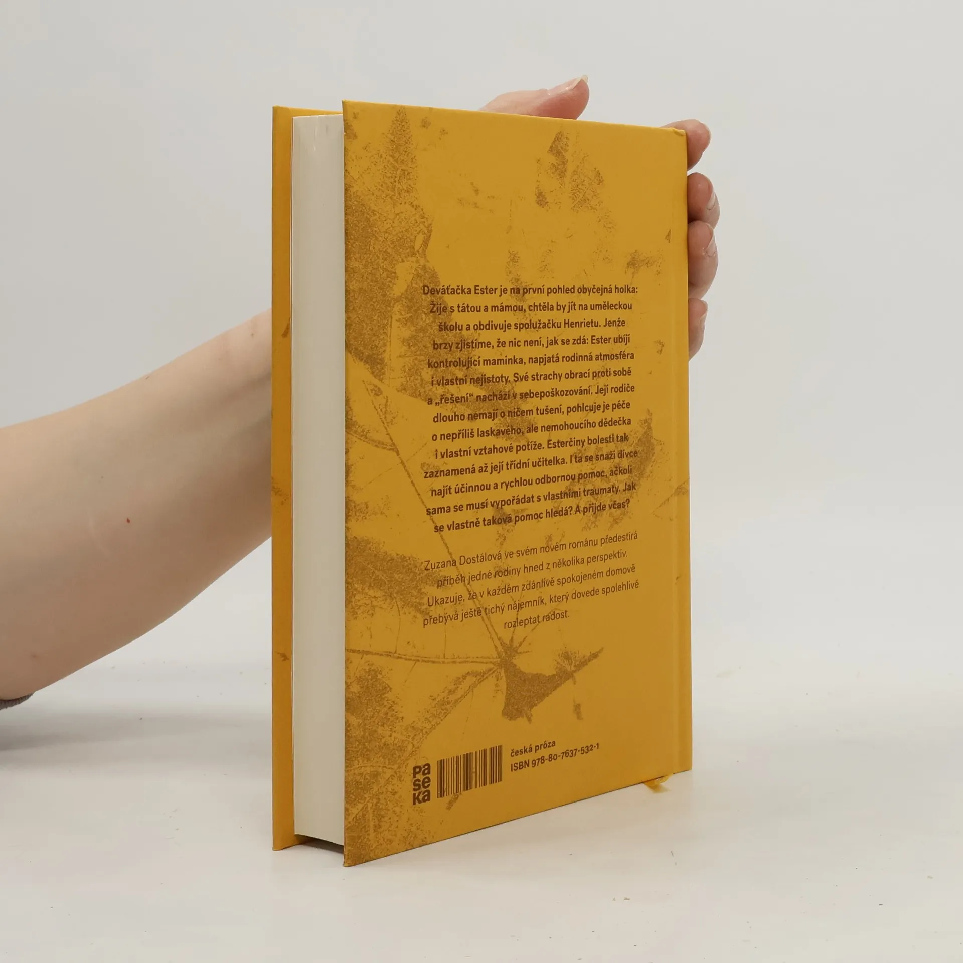 Deváťačka Ester je na první pohled obyčejná holka: Žije s tátou a mámou, chtěla by jít na uměleckou školu a obdivuje spolužačku Henrietu. Jenže brzy zjistíme, že nic není, jak se zdá: Ester ubíjí kontrolující maminka, napjatá rodinná atmosféra i vlastní nejistoty. Své strachy obrací proti sobě a „řešení“ nachází v sebepoškozování. Její rodiče dlouho nemají o ničem tušení, pohlcuje je péče o nepříliš laskavého, ale nemohoucího dědečka i vlastní vztahové potíže. Esterčiny bolesti tak zaznamená až její třídní učitelka. I ta se snaží dívce najít účinnou a rychlou odbornou pomoc, ačkoli sama se musí vypořádat s vlastními traumaty. Jak se vlastně taková pomoc hledá? A přijde včas? Zuzana Dostálová ve svém novém románu předestírá příběh jedné rodiny hned z několika perspektiv. Ukazuje, že v každém zdánlivě spokojeném domově přebývá ještě tichý nájemník, který dovede spolehlivě rozleptat radost.