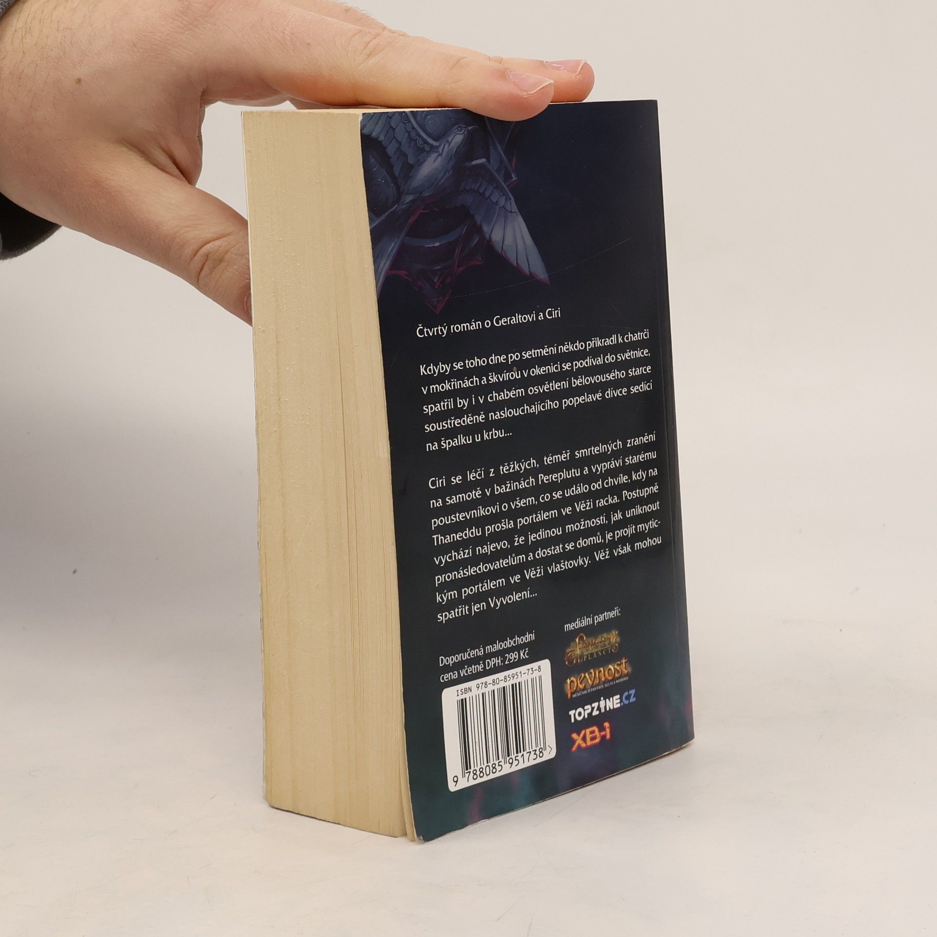 Kdyby se toho dne po setmění někdo přikradl k chatrči v mokřinách a škvírou v okenici se podíval do světnice, spatřil by i v chabém osvětlení bělovousého starce soustředěně naslouchajícího popelavé dívce sedící na špalku u krbu… * Ciri se léčí z těžkých, téměř smrtelných zranění na samotě v bažinách Pereplutu a vypráví starému poustevníkovi o všem, co se událo od chvíle, kdy na Thaneddu prošla portálem ve Věži racka. Postupně vychází najevo, že jedinou možností, jak uniknout pronásledovatelům a dostat se domů, je projít mytickým portálem ve Věži vlaštovky. Věž však mohou spatřit jen Vyvolení…