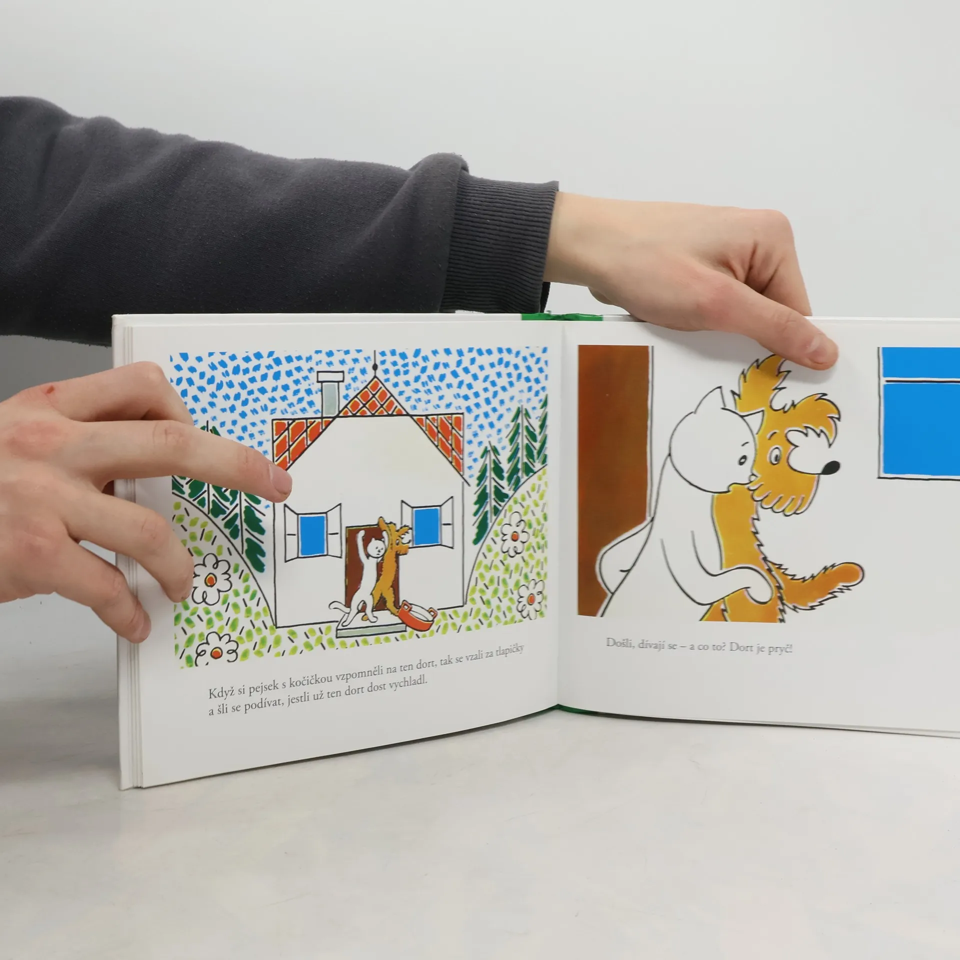 Milé děti i ostatní, oznamujeme Vám, že je všechno v nejlepším pořádku, a tak se spolu zase scházíme v téhle další knížce podle Povídání o pejskovi a kočičce, to je tedy celé o nás dvou, které napsal pan spisovatel Josef Čapek. Chceme k tomu ještě dodat, že jsme oba tuze rádi, že nás tak pěkně vypodobnil na svých obrázcích. Tahle nová knížka o nás se proto jmenuje Jak si dělali dort, protože jsme si jednou opravdu dělali takový velikánský dort, když jsme měli náhodou dohromady svátek i narozeniny. Bylo to ale také naposled, protože jsme poznali, že mnoho dobrého škodí. Ale víc už Vám nemůžeme prozradit, protože byste pak už snadno uhádli, jak to nakonec všechno dopadlo. Tak si pěkně čtěte a ten náš recept na opravdický dort snad ani mamince neukazujte. Raději ji poproste, ať Vám k Vašemu svátku nebo narozeninám udělá dort podle sebe nebo podle kuchařské knížky. Přejeme Vám dobré pochutnání. Tak nazdar a v úctě, Kočička a Pejsek