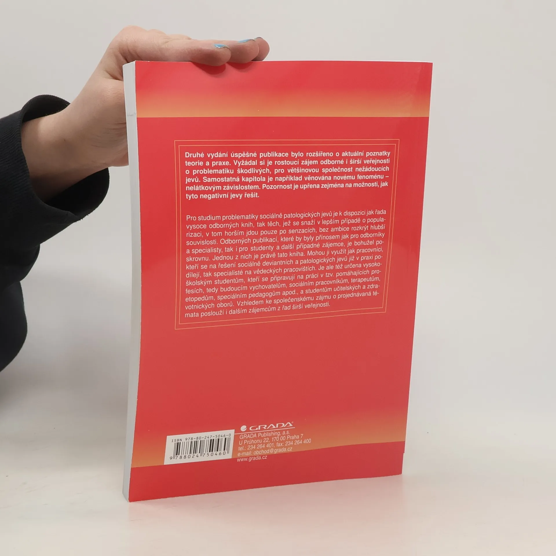 Sociální patologie (Závažné sociálně patologické jevy, příčiny, prevence, možnosti řešení) Druhé vydání úspěšné publikace bylo rozšířeno o aktuální poznatky teorie a praxe. vyžádal si je rostoucí zájem odborné i širší veřejnosti o problematiku škodlivých, pro většinovou společnost nežádoucíxh jevů. Samostaná kapitola je například věnována novému fenoménu - nelátkovým závislostem. Pozornost je upřena zejména na možnosti, jak tyto negativní jevy řešit. Předkládaná publikace navazuje na původní text monografie Sociální patologie (Analýza příčin a možnosti ovlivńování závažných sociálně pedagogických jevů) vydaný v roce 2009. Původní publikace byla podrobena značné revizi, nově předkládaný text je doplněn a do různé míry rozšířen o aktuální poznatky z teorie a praxe...
