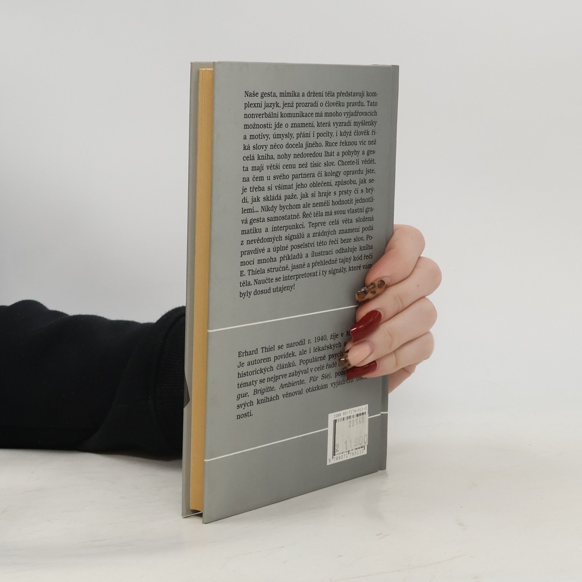 Řeč těla prozradí víc než tisíc slov Naše gesta, mimika a držení těla představují komplexní jazyk, jenž prozradí o člověku pravdu. Tato nonverbální komunikace má mnoho vyjadřovacích možností: jde o znamení, která vyzradí myšlenky a motivy, úmysly, přání i pocity, i když člověk říká slovy něco docela jiného. Ruce řeknou víc než celá kniha, nohy nedovedou lhát a pohyby a gesta mají větší cenu než tisíc slov. Chcete-li vědět, na čem u svého partnera či kolegy opravdu jste, je třeba si všímat jeho oblečení, způsobu, jak sedí, jak skládá paže, jak si hraje s prsty či s brýlemi... Nikdy bychom ale neměli hodnotit jednotlivá gesta samostatně. Řeč těla má svou vlastní gramatiku a interpunkci. Teprve celá věta složená z nevědomých signálu a zrádných znamení podá pravdivé a úplné poselství této řeči beze slov. Pomocí mnoha příkladu a ilustrací odhaluje kniha E. Thiela stručně, jasně a přehledně tajný kód řeči těla. Naučte se interpretovat i ty signály, které vám byly dosud utajeny! Vydání první