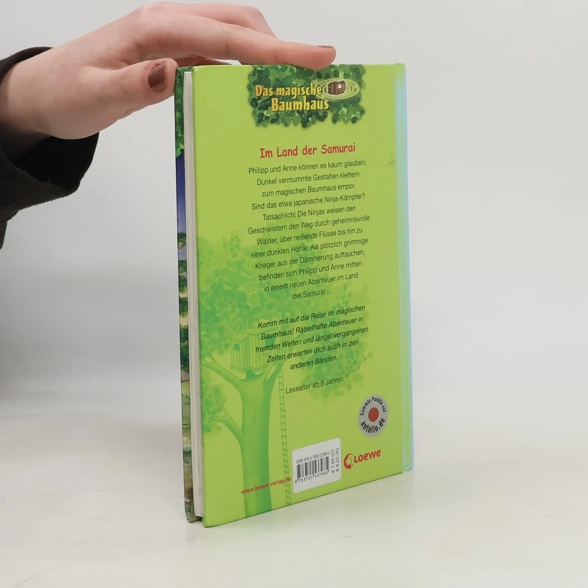 Philipp und Anne können es kaum glauben: Dunkel vermummte Gestalten klettern zum magischen Baumhaus empor. Das können nur japanische Ninja-Kämpfer sein! Die Ninjas weisen den Geschwistern den Weg durch geheimnisvolle Wälder, über reißende Flüsse bis hin zu einer dunklen Höhle. Als plötzlich grimmige Krieger aus der Dämmerung auftauchen, befinden sich Philipp und Anne mitten in einem neuen Abenteuer im Land der Samurai ... Komm mit auf die Reise im magischen Baumhaus! Rätselhafte Abenteuer in fremden Welten und längst vergangenen Zeiten erwarten dich auch in den anderen Bänden. Die beliebte Kinderbuch-Reihe von Bestsellerautorin Mary Pope Osborne! Die Geschwister Anne und Philipp reisen mit dem magischen Baumhaus durch die Zeit. Sie erleben spannende Abenteuer, entdecken ferne Länder und lernen viele berühmte Persönlichkeiten kennen.