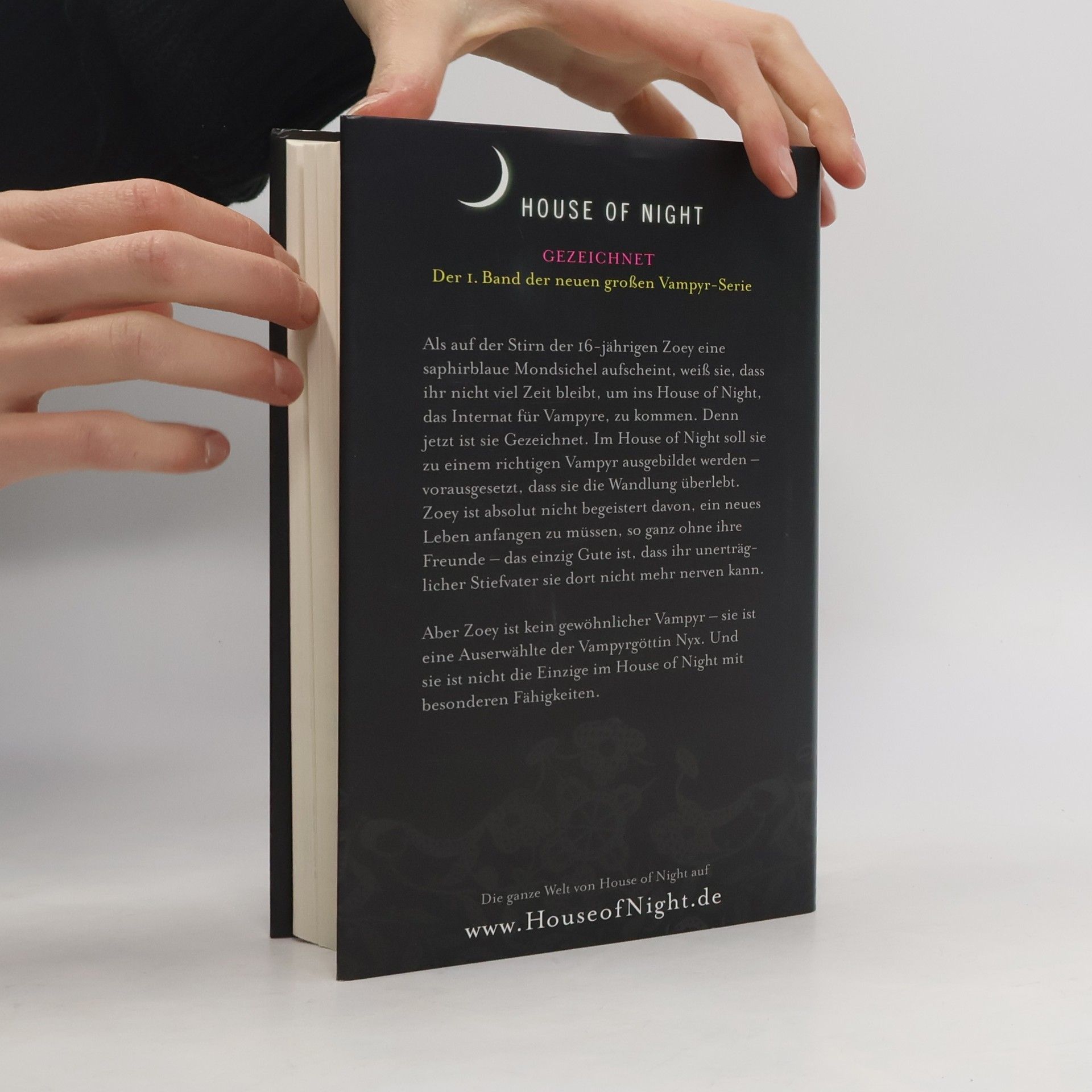 Als auf der Stirn der 16-jährigen Zoey eine saphirblaue Mondsichel aufscheint, ist ihr sofort klar, dass sie Gezeichnet worden ist und im House of Night zum Vampyr ausgebildet werden soll. Doch sie ist keine normale Jungvampyrin: Die Göttin Nyx hat sie mit besonderen Kräften versehen. Und Zoey ist nicht die Einzige im Internat mit solchen Fähigkeiten. Als sie herausfindet, dass die Anführerin der Töchter der Dunkelheit, einer Elitegruppe der Schule, ihre Gaben missbraucht, muss sie ihren ganzen Mut aufbringen, um sich ihrer Bestimmung zu stellen … Gezeichnet ist der furiose Auftakt zu Zoeys Entdeckungsreise zwischen den Welten, zwischen Licht und Dunkel und letztendlich zu sich selbst.