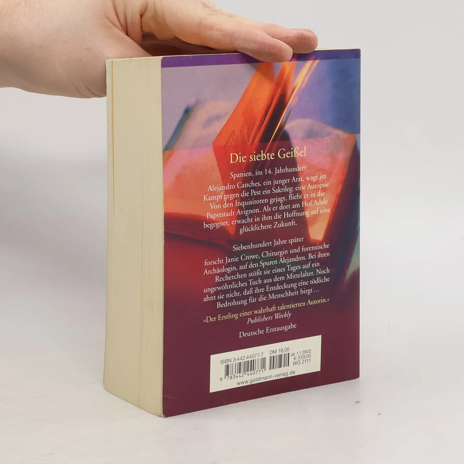 Spanien, im 14. Jahrhundert. Alejandro Canches, ein junger Arzt, wagt im Kampf gegen die Pest ein Sakrileg: eine Autopsie. Von den Inquisitoren gejagt, flieht er in die Papststadt Avignon. Als er dort am Hof Adele begegnet, erwacht in ihm die Hoffnung auf eine glücklichere Zukunft. Siebenhundert Jahre später forscht Janie Crowe, Chirurgin und forensische Archäologin, auf den Spuren Alejandros. Bei ihren Recherchen stößt sie eines Tages auf ein ungewöhnliches Tuch aus dem Mittelalter. Noch ahnt sie nicht, daß ihre Entdeckung eine tödliche Bedrohung für die Menschheit birgt...