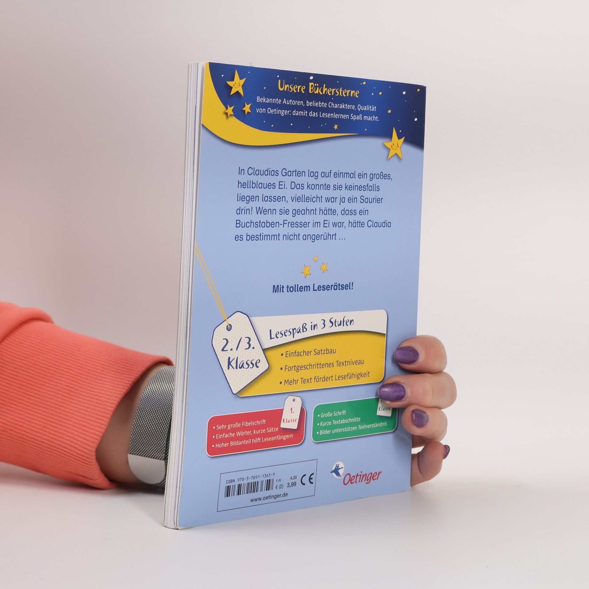 Angefangen hat alles damit, dass Claudia im Garten ein Ei fand. Das war himmelblau und ungefähr so groß wie ein Autoreifen. Klar, dass sie es nicht einfach so liegen lassen konnte. Vielleicht war ja ein Saurier drin oder ein Krokodil. Wenn Claudia geahnt hätte, dass in dem Ei ein Buchstaben-Fresser war, hätte sie es bestimmt nicht angerührt.
