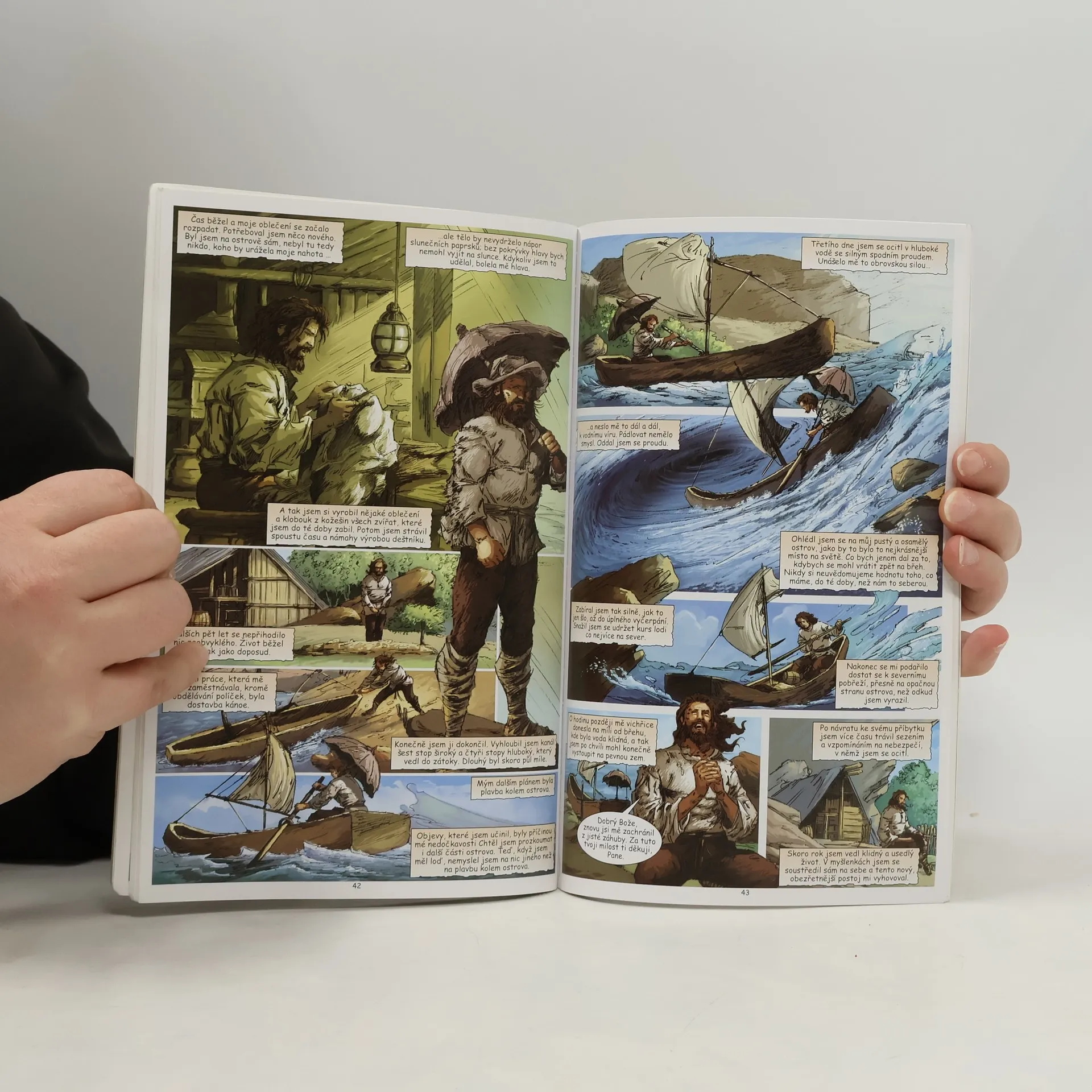 Komiksová adaptace slavného románu anglického spisovatele Daniela Defoa je určena dětem od 9 let. Strhující děj, výstižné ilustrace a forma obrázkového románu nadchne každé dítě a čtení se tak pro něj stane zábavou. Devatenáctiletý Robinson Crusoe není spokojen se svým klidným, ale nudným životem v Anglii. Tak rád by se plavil po moři a poznával svět. Jeho touha po dobrodružství ho přiměje bez rozloučení s rodiči opustit rodnou zemi a vydat se do cizích krajů. Během následujících pěti let poznává mnoho míst a lidí, ale především sám sebe. Zažije několik nebezpečných situací na moři i na pevnině, a tak si začíná pohrávat s myšlenkou, že se usadí. Ale jeho dobrodružná povaha ho ještě jednou přiměje nasednout na loď. Tentokrát má však ztroskotání lodi katastrofální následky a Robinson se jako jediný z posádky zachrání na zdánlivě opuštěném ostrově. Je možné, aby v takové situaci člověk sám přežil? Podaří se mu ostrov opustit, nebo na něm bude muset zůstat?