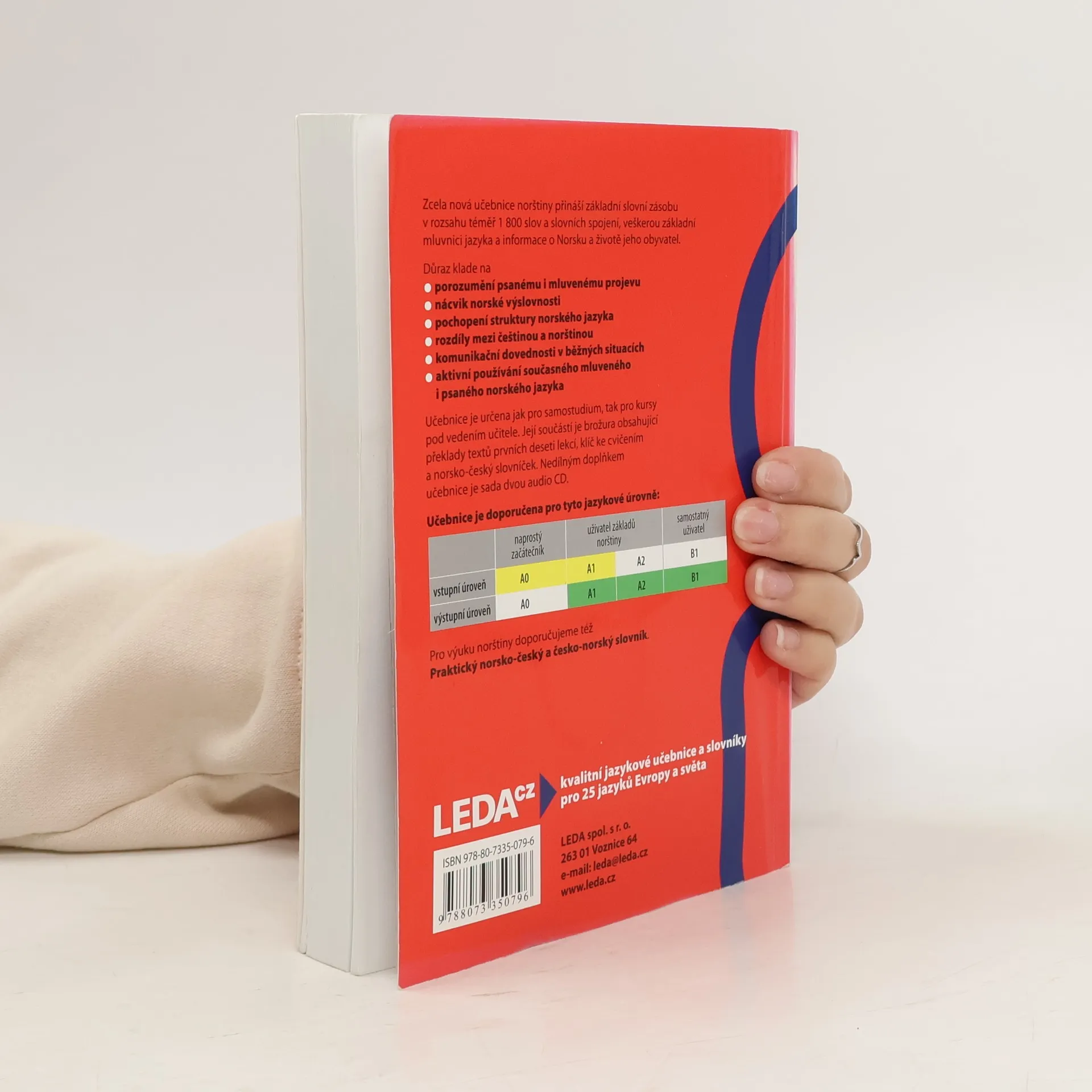 Základní učebnice norštiny je určena všem, kteří se chtějí naučit norsky (bokmal) především samostudiem, dobře ale poslouží i pro jazykové kurzy. V jednotlivých lekcích je zařazen úvodní článek (nebo články), dále dialogy, základní slovíčka pro danou lekci, rozšiřující slovní zásoba, oddíl frází a předložkových vazeb, informace týkající se norských reálií, oddíl s mluvnickým výkladem, cvičení na výslovnost, poslechová cvičení a velké množství cvičení na mluvnické jevy a slovní zásobu. Úvodní texty jednotlivých lekcí obsahují jak užitečné fráze nutné pro dorozumění v běžných situacích, tak zajímavé reálie týkající se Norska a života lidí v této zemi. Součástí učebnice jsou klíč ke cvičením, norsko-český slovníček v samostatné brožuře a dvě audio CD.