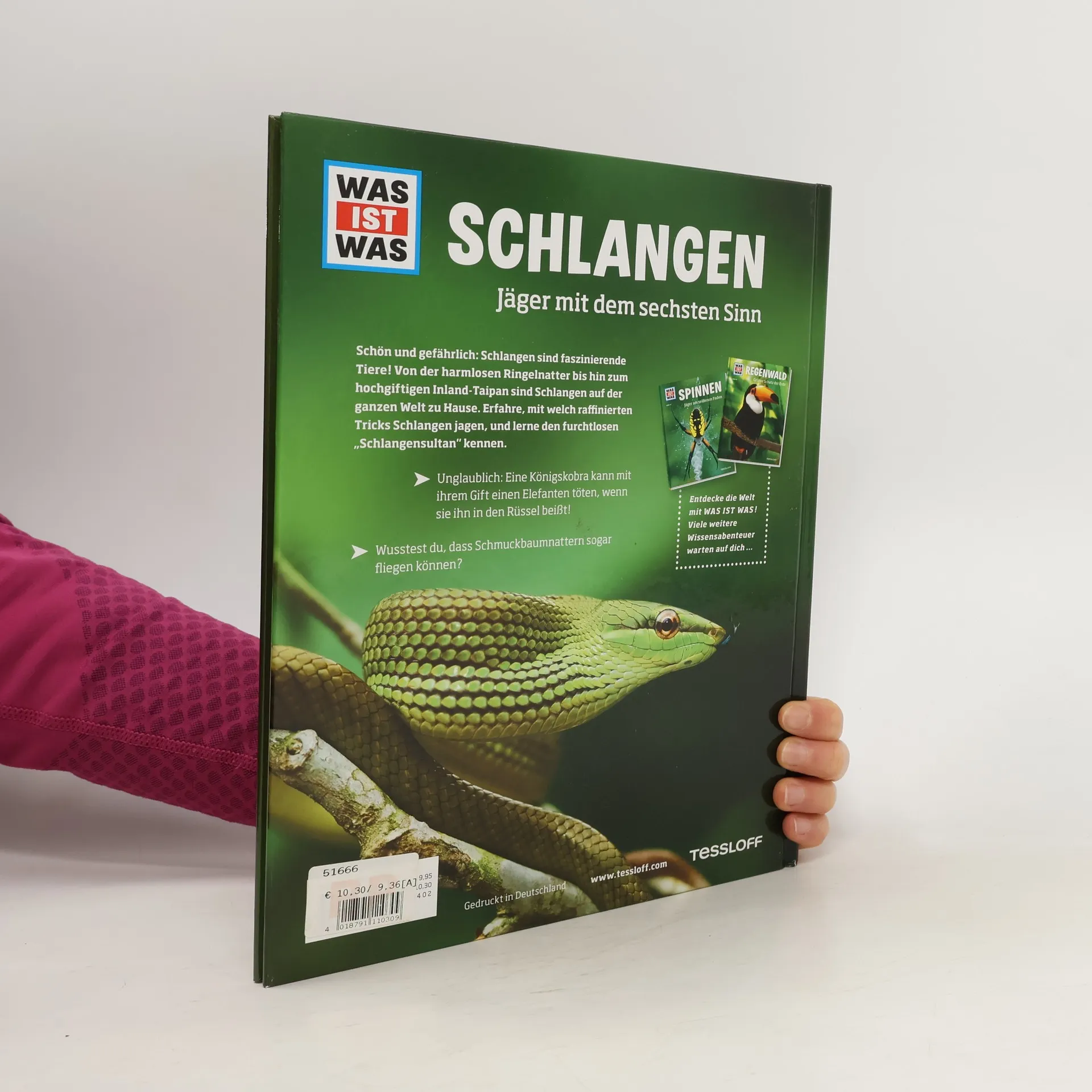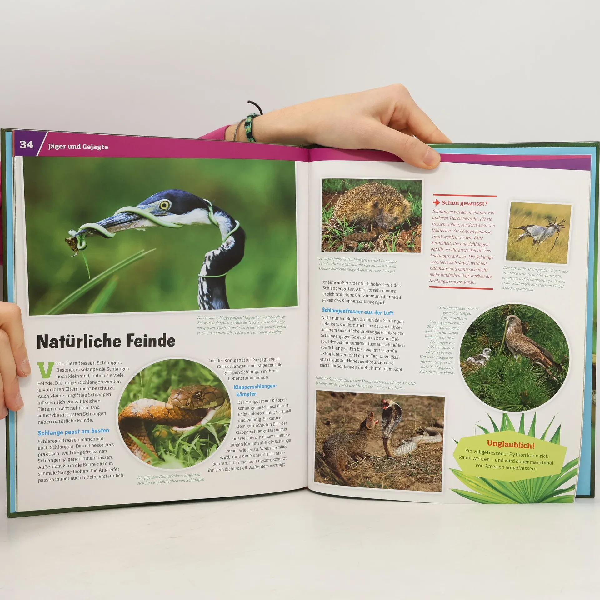 Sie haben keine Ohren und keine Arme oder Beine. Sie riechen mit der Zunge und können ihre Unterkiefer ausrenken. Schlangen sind faszinierende Tiere! Doch nicht alle Schlangen sind gleich. Die Bandbreite reicht von der harmlosen Ringelnatter über die gefähliche Königskobra bis hin zum Inland-Taipan, der giftigsten Schlange der Welt. Zu ihrer Beute kann eine winzige Termite genauso zählen wie eine Gazelle - manchmal stehen sogar andere Schlangen auf dem Speiseplan! Schlangen sind gute Jäger und jede Schlange jagt dabei auf ihre eigene Weise. Die Gabunviper vergiftet ihre Opfer und kann mit einer Geschwindigkeit von 85 Stundenkilometern zustoßen, die Anakonda dagegen würgt ihr Opfer zu Tode. Alles weit weg? Von wegen!