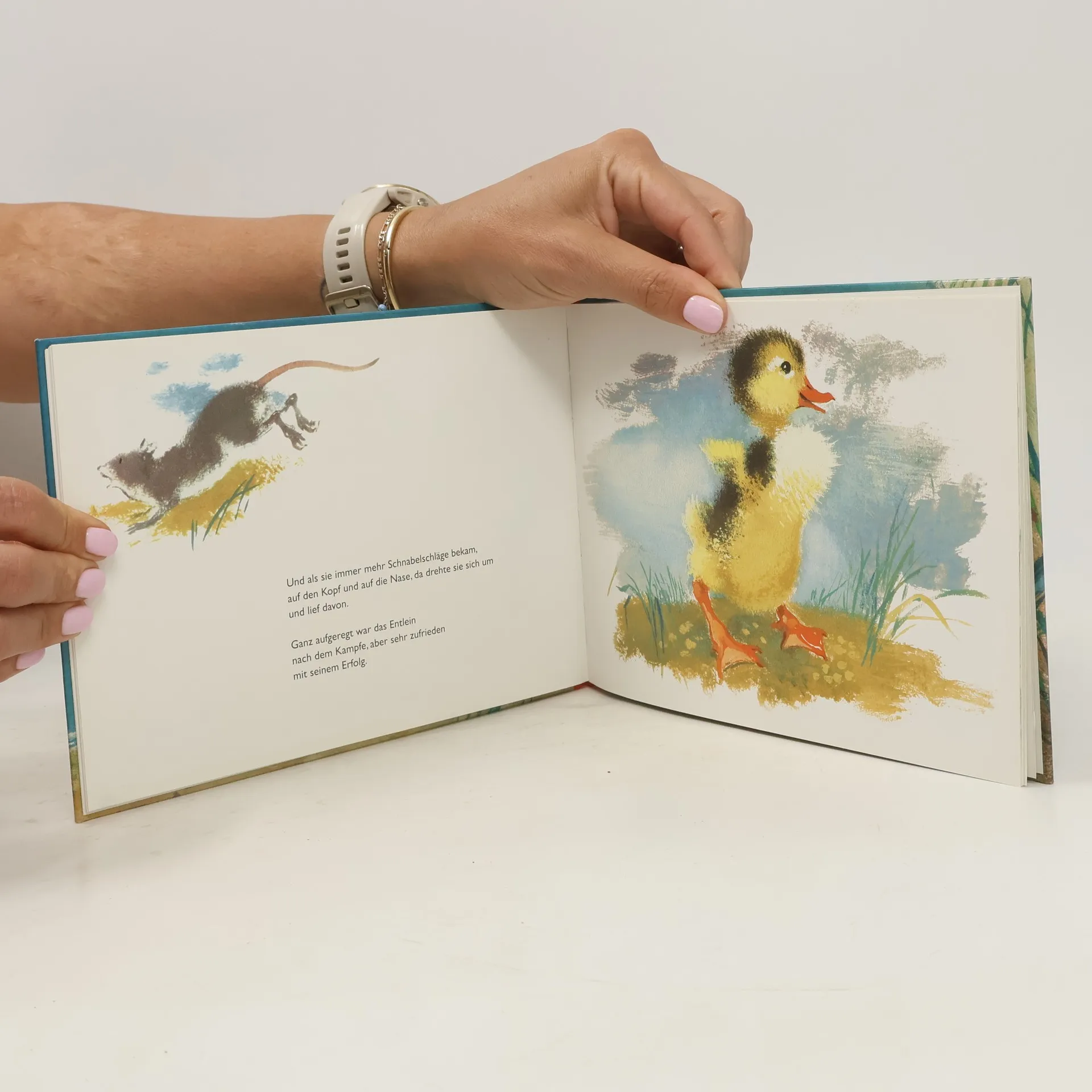 Hinein ins Wasser! Zum allerersten Mal dürfen die kleinen Entlein mit ihrer Mutter im See schwimmen. Ein Entlein bewundert die Seerosen, die Frösche und folgt neugierig einer glitzernden Libelle hinaus auf den See. Doch plötzlich ist es ganz allein, seine Mutter und die Geschwister sind nicht mehr zu sehen. Da nähert sich im Wasser ein großer dunkler Schatten ... * eines der auflagenstärksten Bilderbücher der DDR * ein Klassiker - nun wieder im Originalformat lieferbar