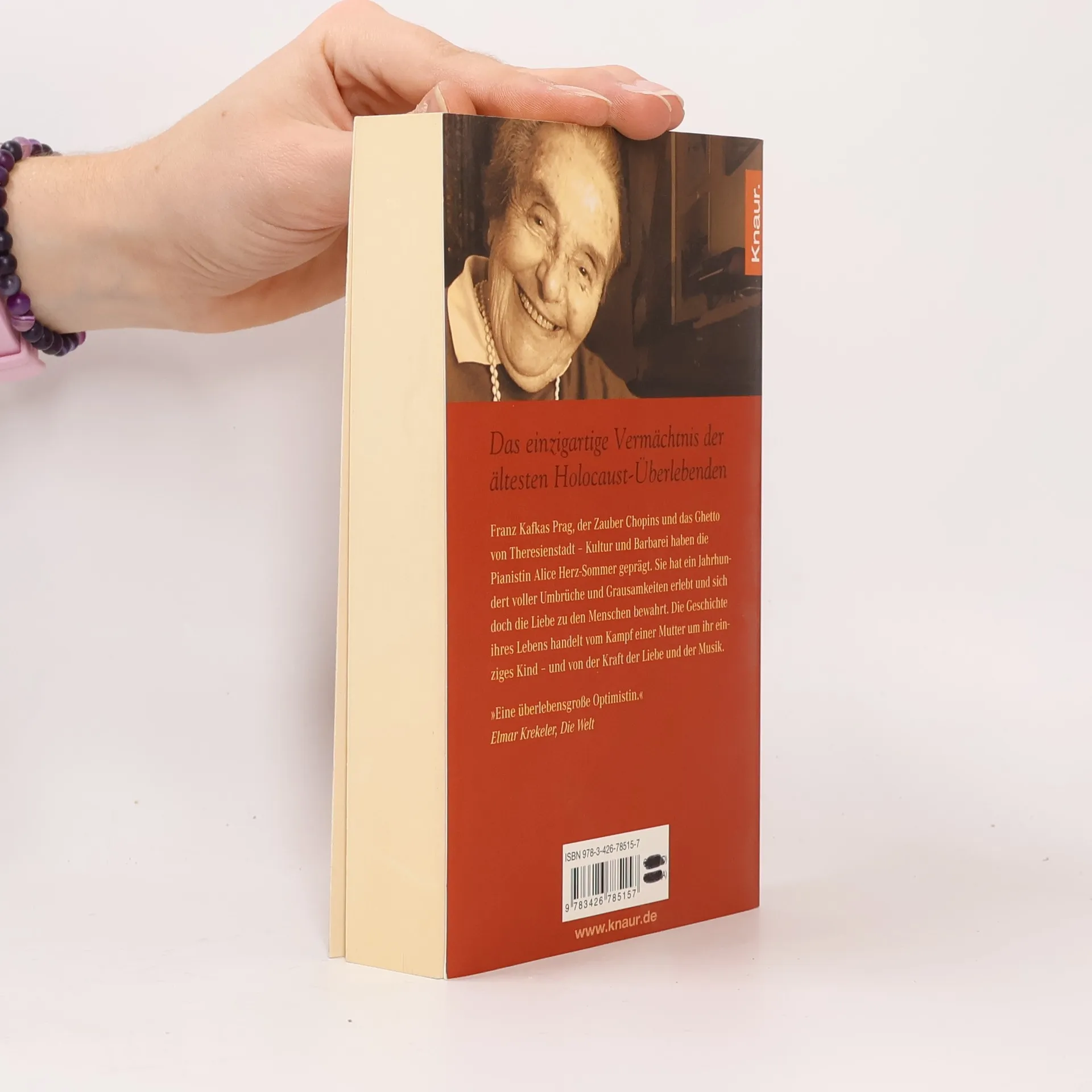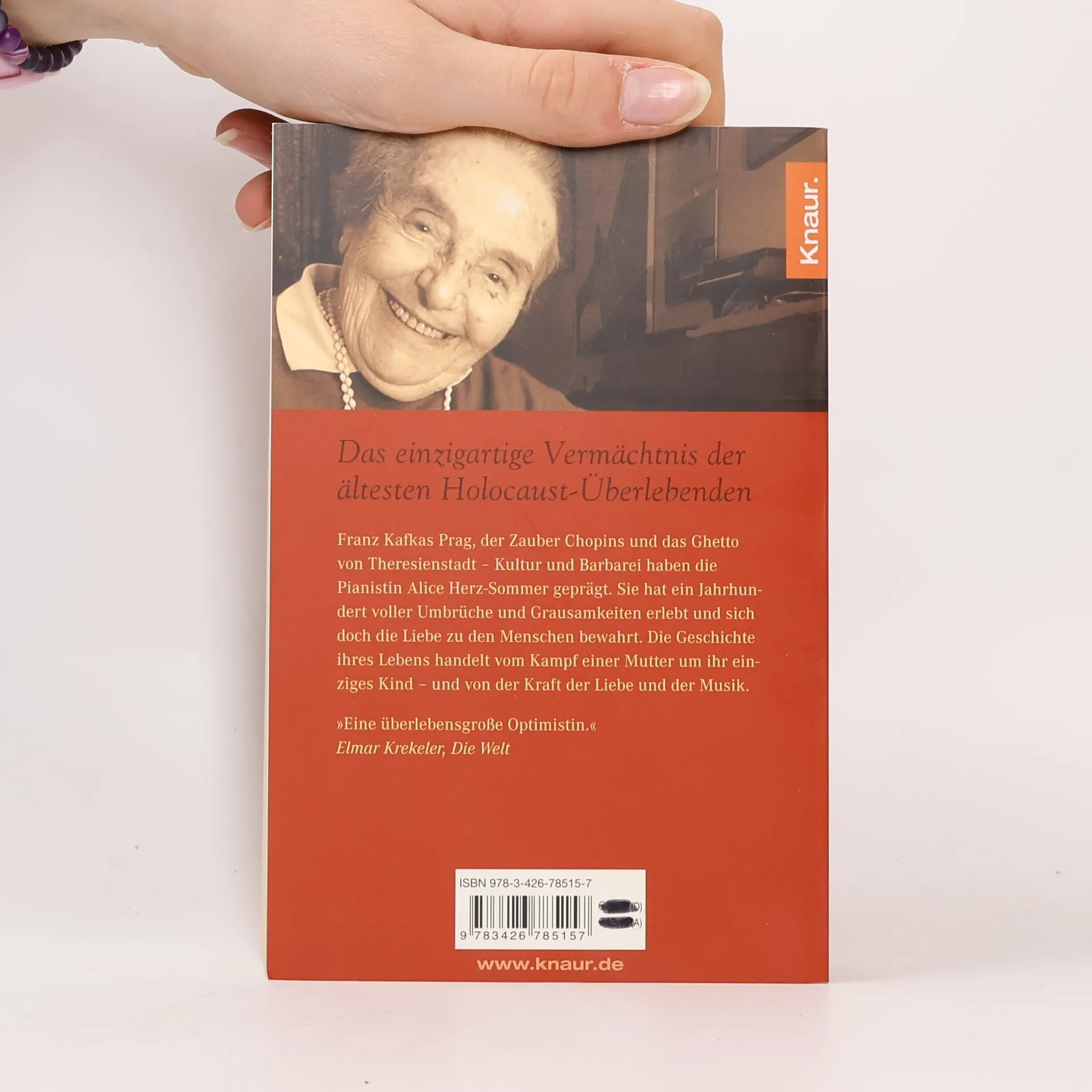 Die Geschichte einer doppelten Liebe: der Liebe einer Mutter zu ihrem Kind und der Liebe einer Künstlerin zur Musik. Franz Kafkas Prag und die Hölle des KZ, der Zauber der Musik und die Befehle der Wachleute von Theresienstadt – das sind die prägenden Elemente des ungewöhnlichen Lebens der Pianistin Alice Herz-Sommer. Sie wurde am 26. November 1903 in Prag geboren. 1943 wird sie mit ihrem Sohn Raphael nach Theresienstadt deportiert, wo ihr das Unglaubliche gelingt: In über 100 Konzerten schenkt sie den Mithäftlingen Kraft und Hoffnung, und für ihren kleinen Sohn schafft sie inmitten von Hunger, Leid und Tod eine Atmosphäre der Zuversicht und Geborgenheit. Alice Herz-Sommer starb als älteste Holocaust-Überlebende am 23. Februar 2014 im Alter von 110 Jahren in London. „Was für ein Leben, was für ein Mensch, was für eine Frau! Und was für ein Buch! Es feiert die Größe und Unbesiegbarkeit des Menschen und der Kunst.“ Lausitzer Rundschau