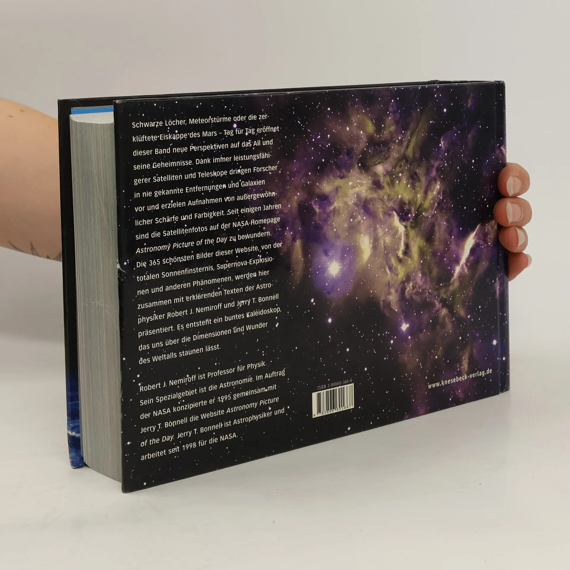 Nach dem sensationellen Erfolg von "Erde von oben" präsentiert dieser Band 365 spektakuläre Bilder des Universums. Dank leistungsfähiger Satelliten und Teleskope bieten die Aufnahmen eine nie gekannte Schärfe und Farbigkeit. Planeten, Galaxien und die totale Sonnenfinsternis von 1999 erscheinen aus neuer Perspektive und verdeutlichen die Unendlichkeit des Weltalls. Fasziniert von den Möglichkeiten der Weltraumforschung, gründeten die Astrophysiker Robert J. Nemiroff und Jerry T. Bonnell 1995 in Zusammenarbeit mit der NASA eine Website, die das Universum auch für Laien zugänglich macht. Unter dem Titel Astronomy Picture of the Day wird täglich eine atemberaubende Aufnahme aus dem All gezeigt, begleitet von einem sachkundigen Kommentar der Autoren. Die Homepage hat sich zur populärsten Website über Astronomie entwickelt und zieht mit einer Million Zugriffen pro Woche eine treue Fangemeinde an. Die 365 schönsten und ungewöhnlichsten Aufnahmen der letzten sieben Jahre wurden für dieses Buch ausgewählt. Zu sehen sind unter anderem die ersten Fotos eines schwarzen Lochs und ein Panorama des gesamten Himmels, das aus 51 Einzelaufnahmen besteht. Jedes Foto wird von einem anregenden Text begleitet, der mit Anekdoten und wissenschaftlichen Beispielen die Wunder des Kosmos anschaulich vermittelt.